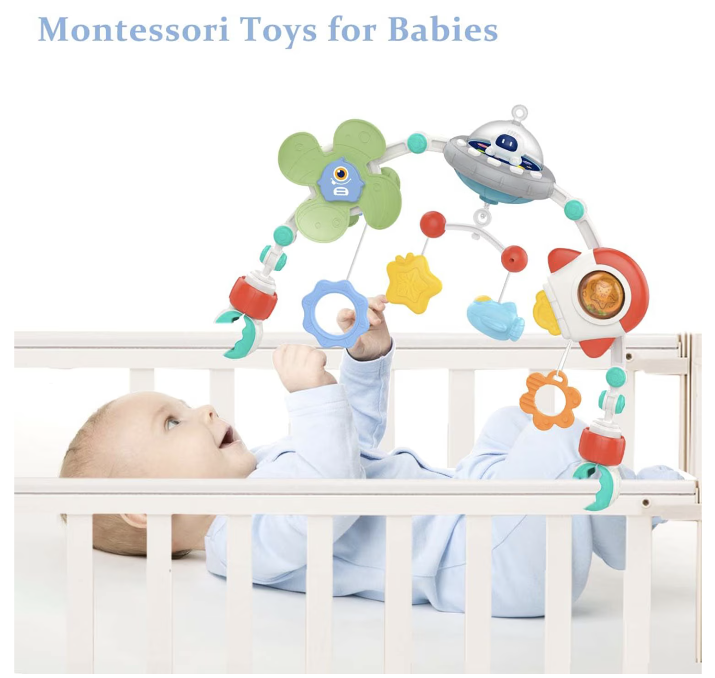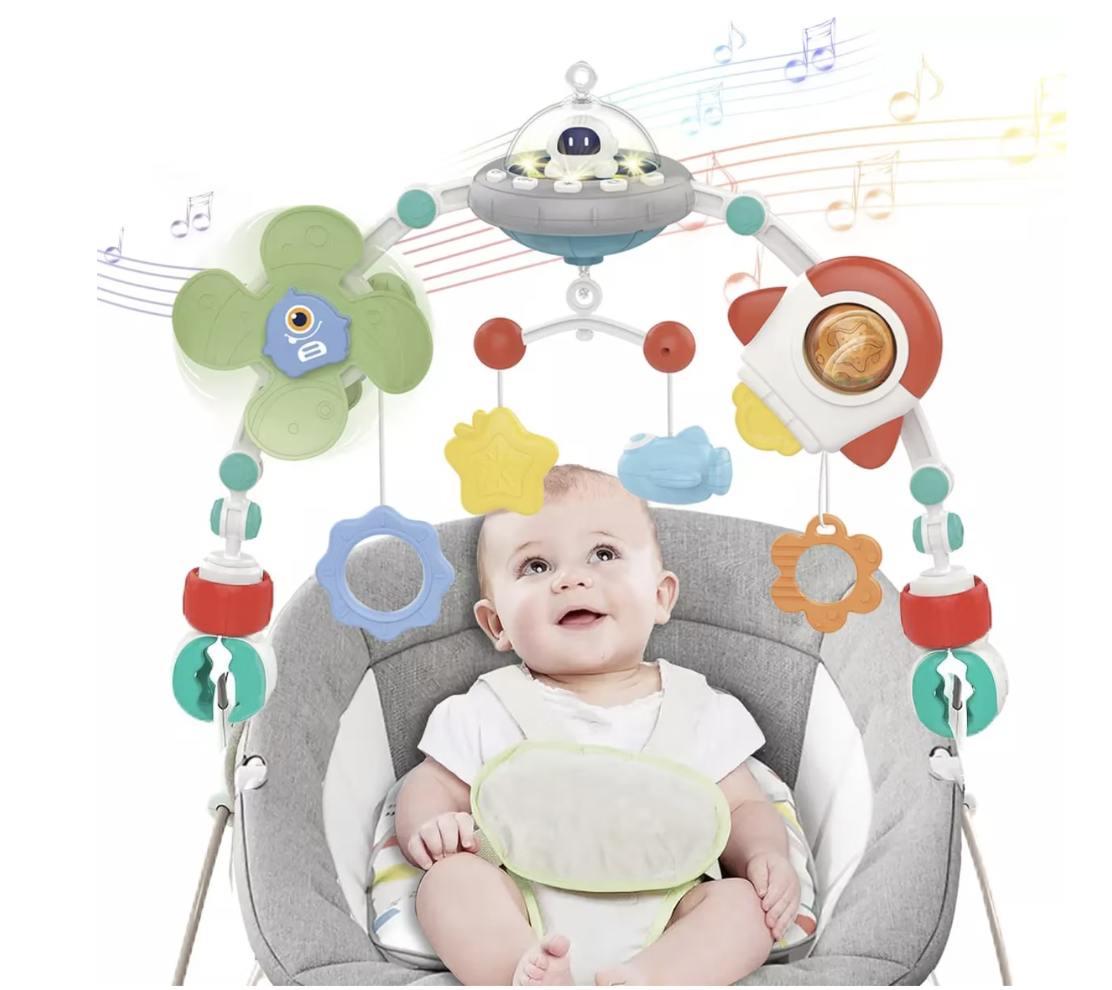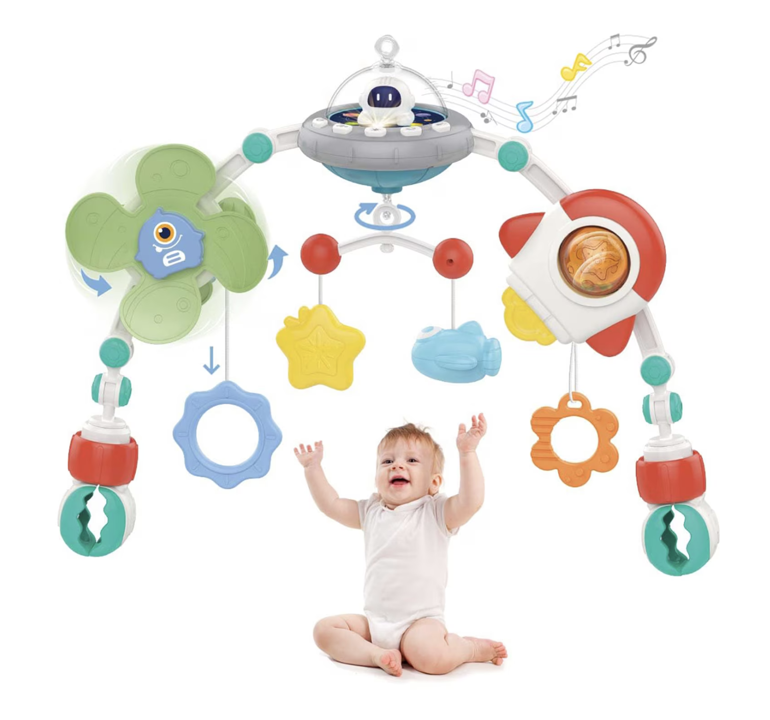 Stimuleaza joaca activa si curiozitatea – Fiecare jucarie este pozitionata pentru a atrage copilul, incurajand intinderea, atingerea si prinderea, ceea ce sprijina motricitatea fina si senzoriala.