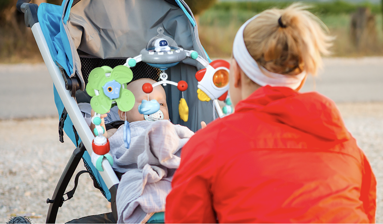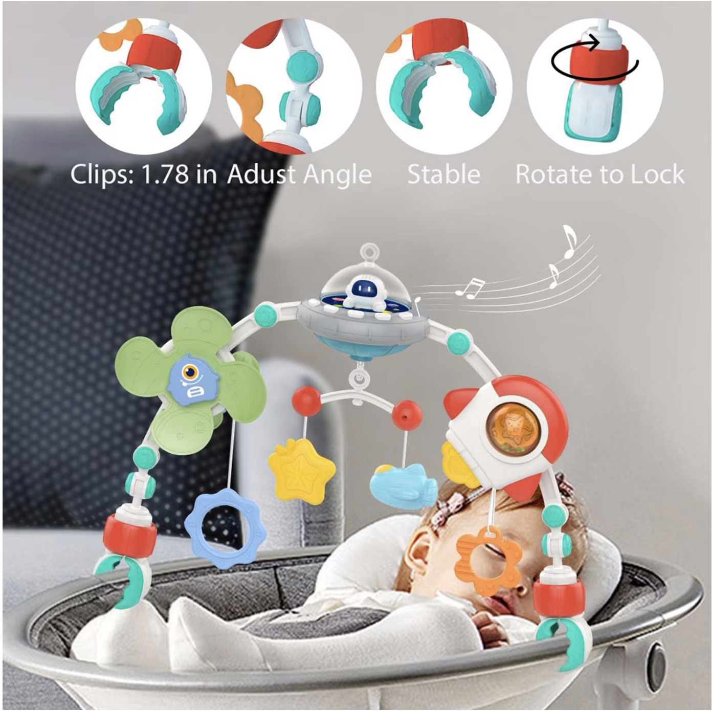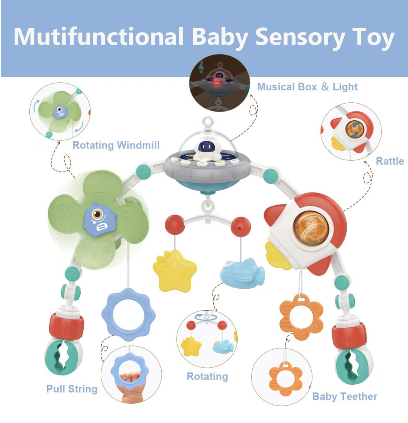 Stimuleaza joaca activa si curiozitatea – Fiecare jucarie este pozitionata pentru a atrage copilul, incurajand intinderea, atingerea si prinderea, ceea ce sprijina motricitatea fina si senzoriala.