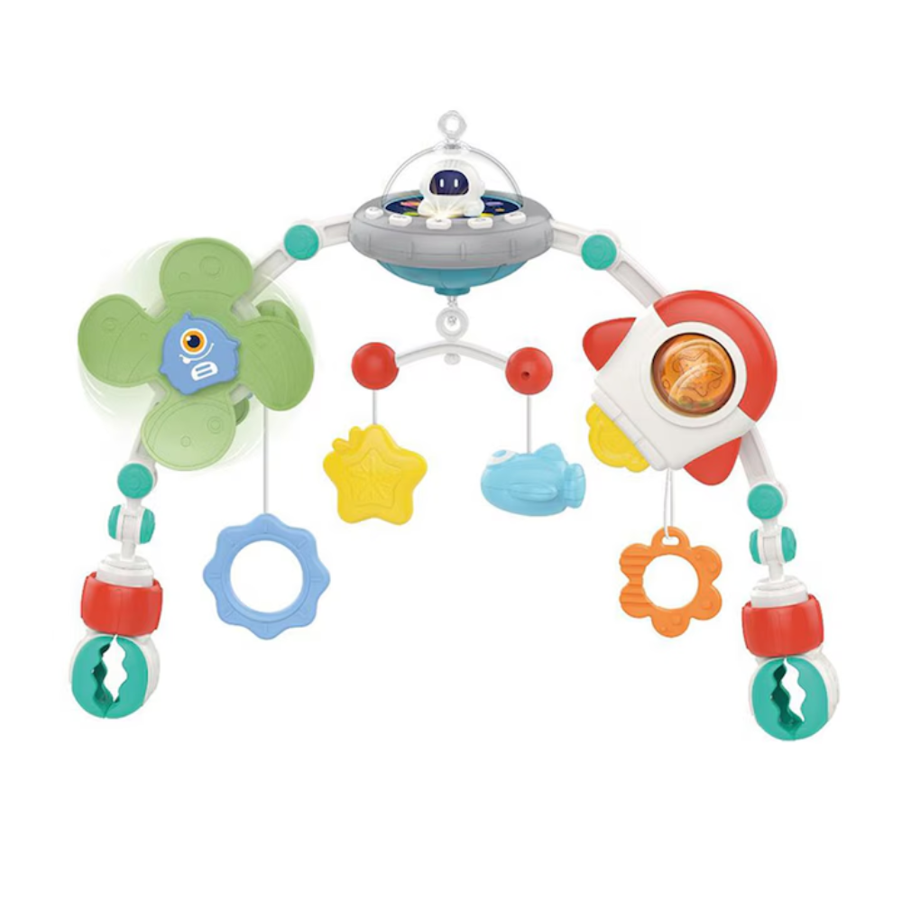 Jucarii interactive suspendate – Figurine simpatice in forma de flori, stele si rachete, viu colorate si usor de apucat. Ajuta la dezvoltarea coordonarii mana-ochi si stimuleaza atentia vizuala.