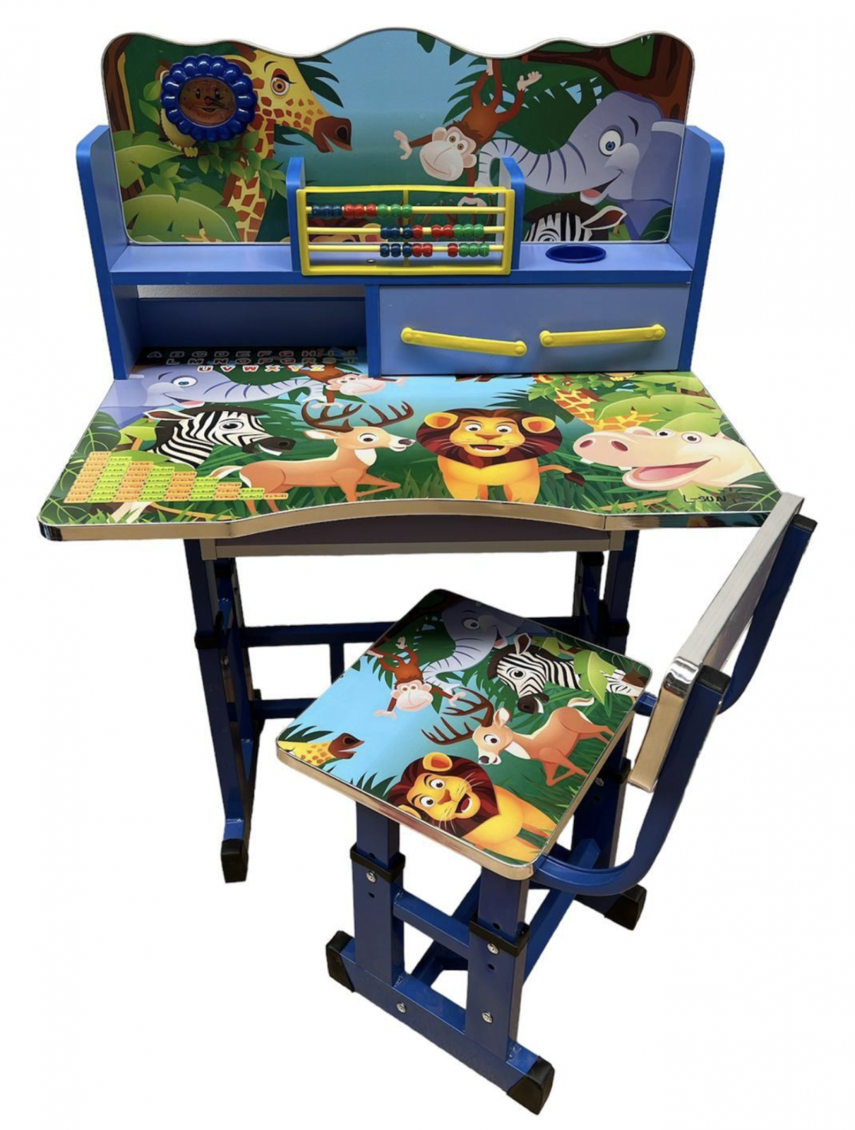Acest set de birou si scaun este realizat din pal MDF, colantat in culori vii, cu informatii legate de alfabet si tabla inmultirii.