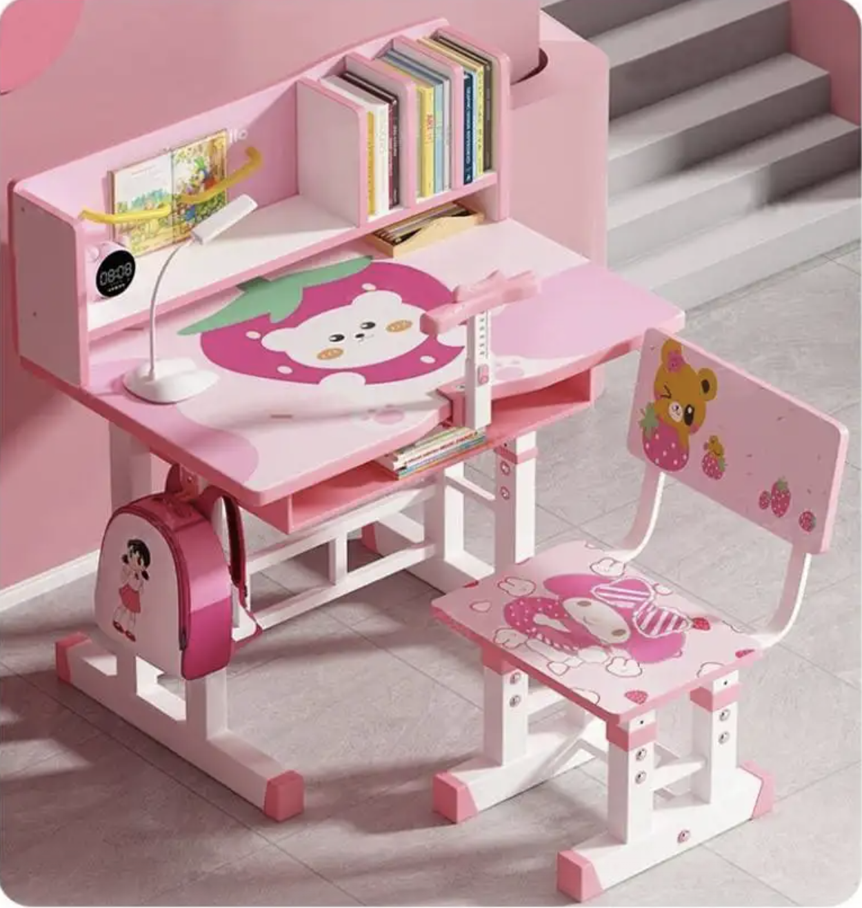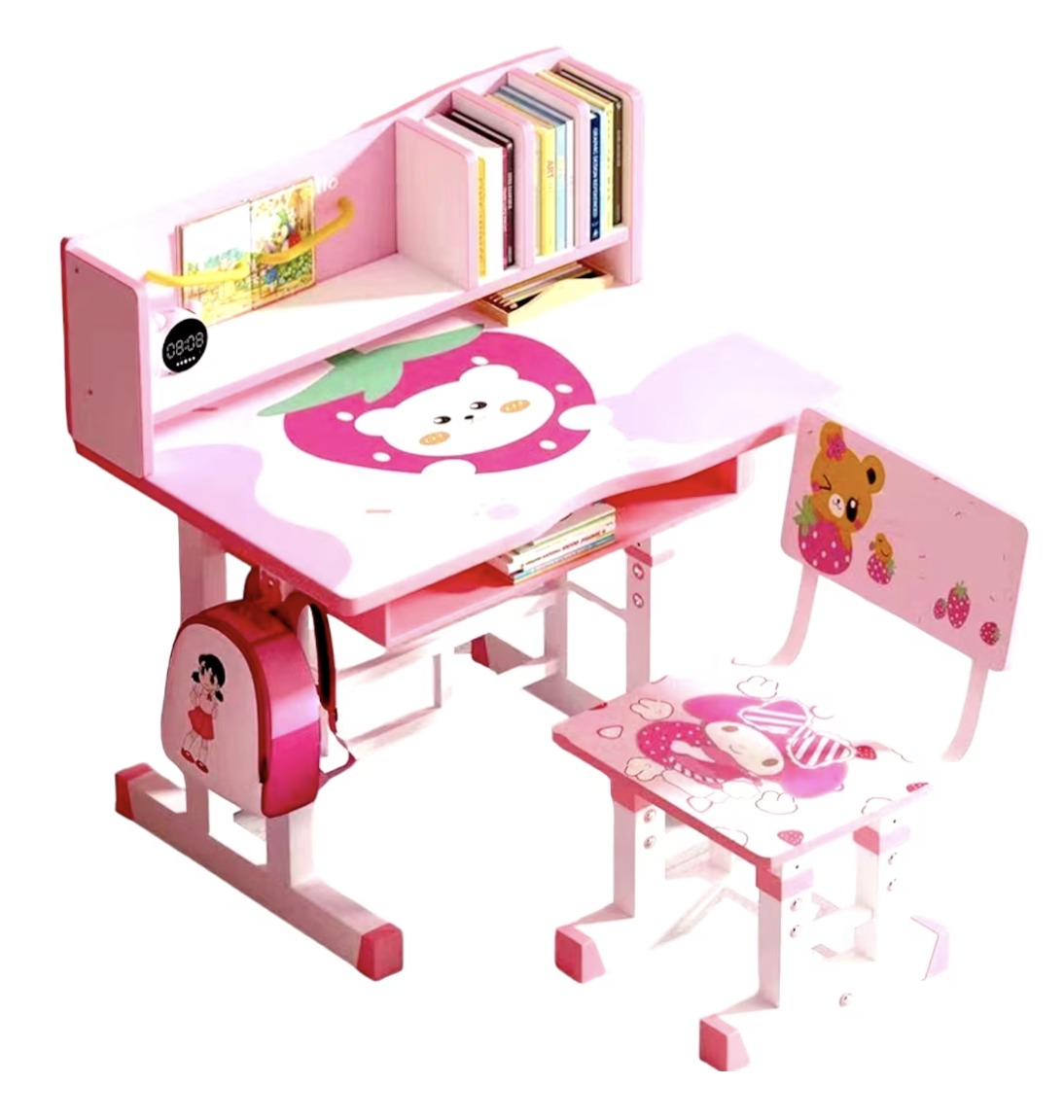 Birou cu scaun pentru copii, reglabile, cadru metalic si MDF, Ursuletul roz T15