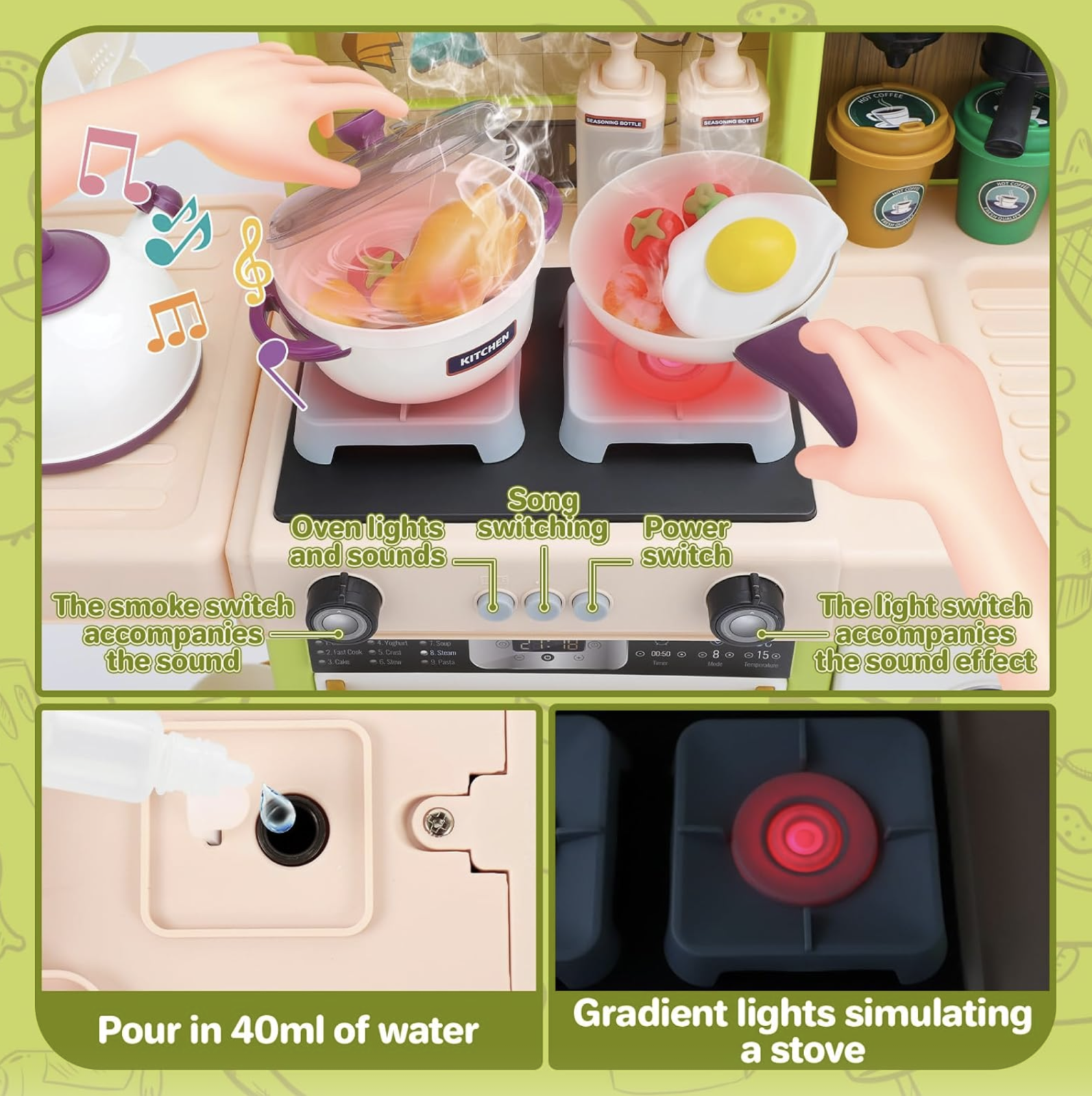 Accesorii incluse: alimente de jucarie, ustensile, vase