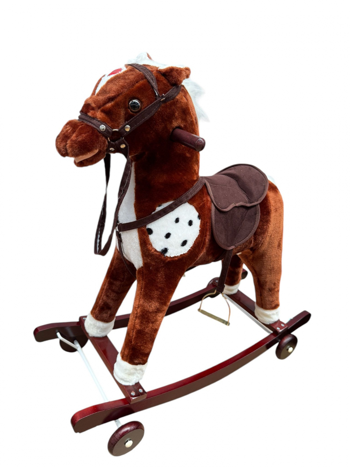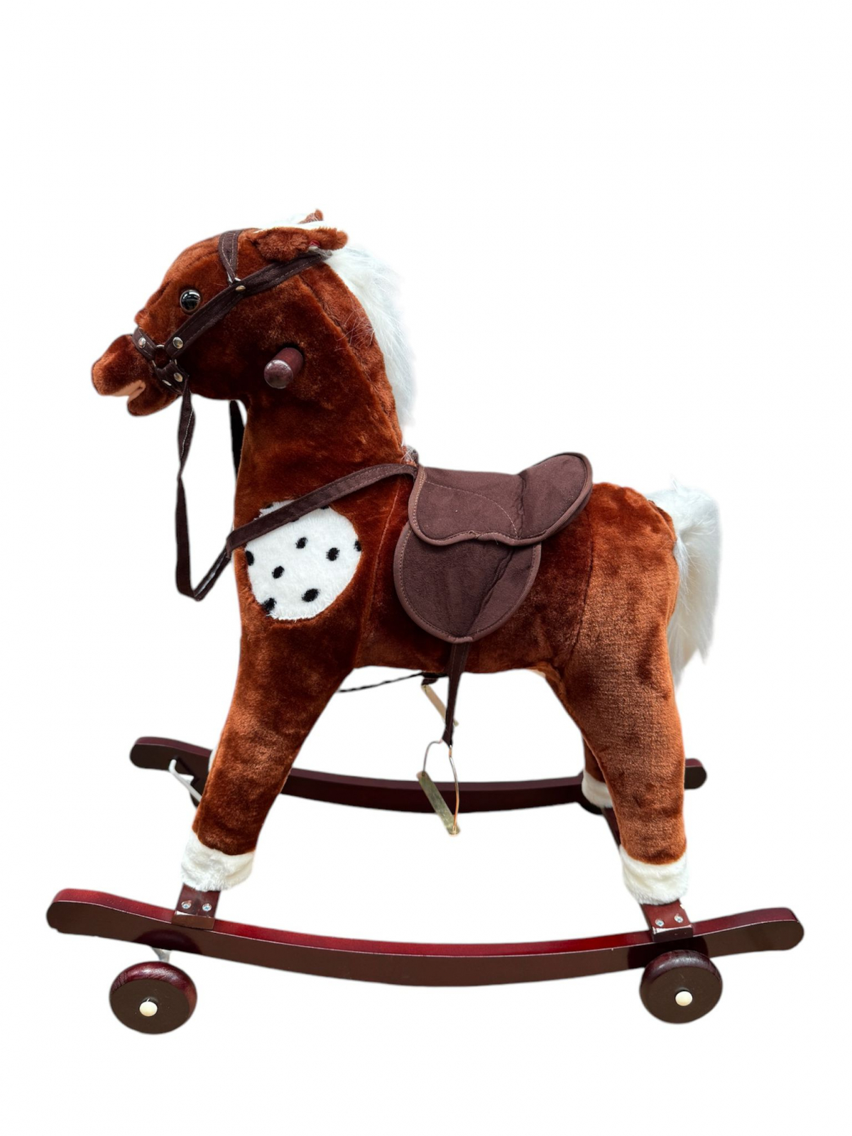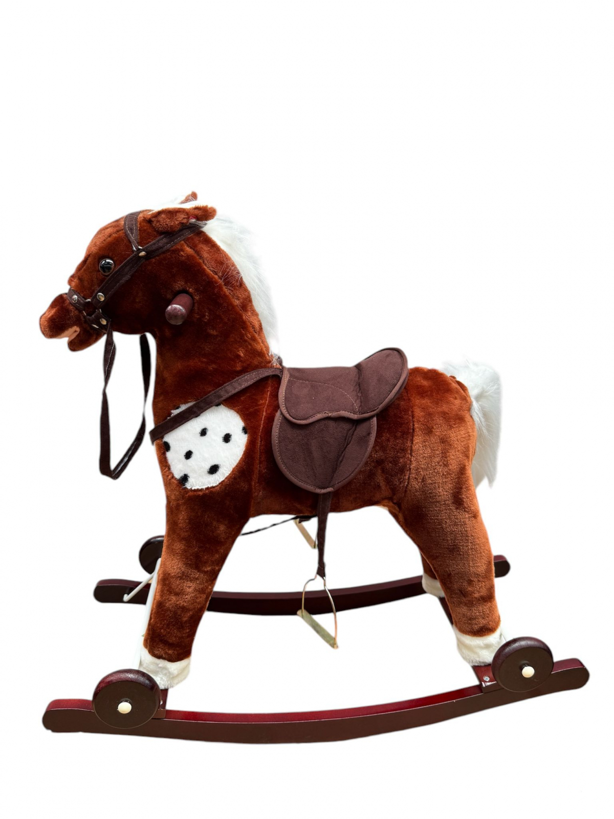 Calut care da din coada, din botic si necheaza atunci cand este apasat pe urechiuse, balansoar, din plus cu talpi si roti din lemn si cadru metalic, pentru copii, se balanseaza datorita miscarii inainte-inapoi a copilului, pe cele doua baze atasate, este dotat cu 2 manere de sprijin.Varsta recomandata: 1 - 3 ani.