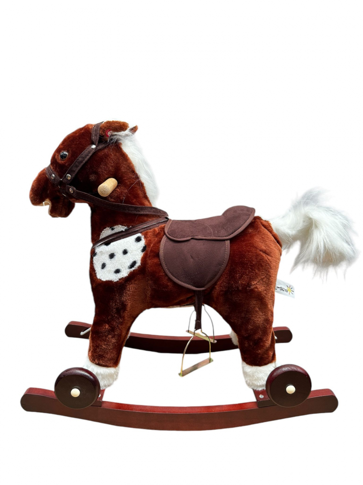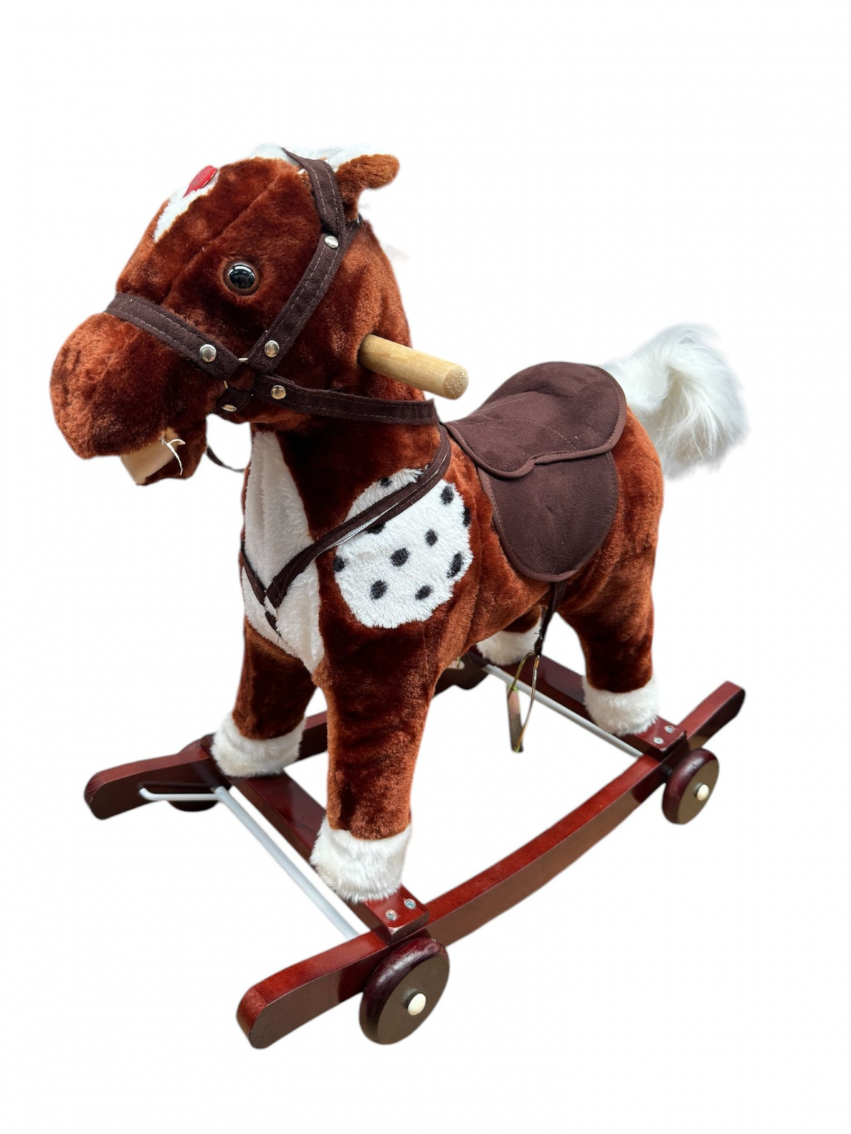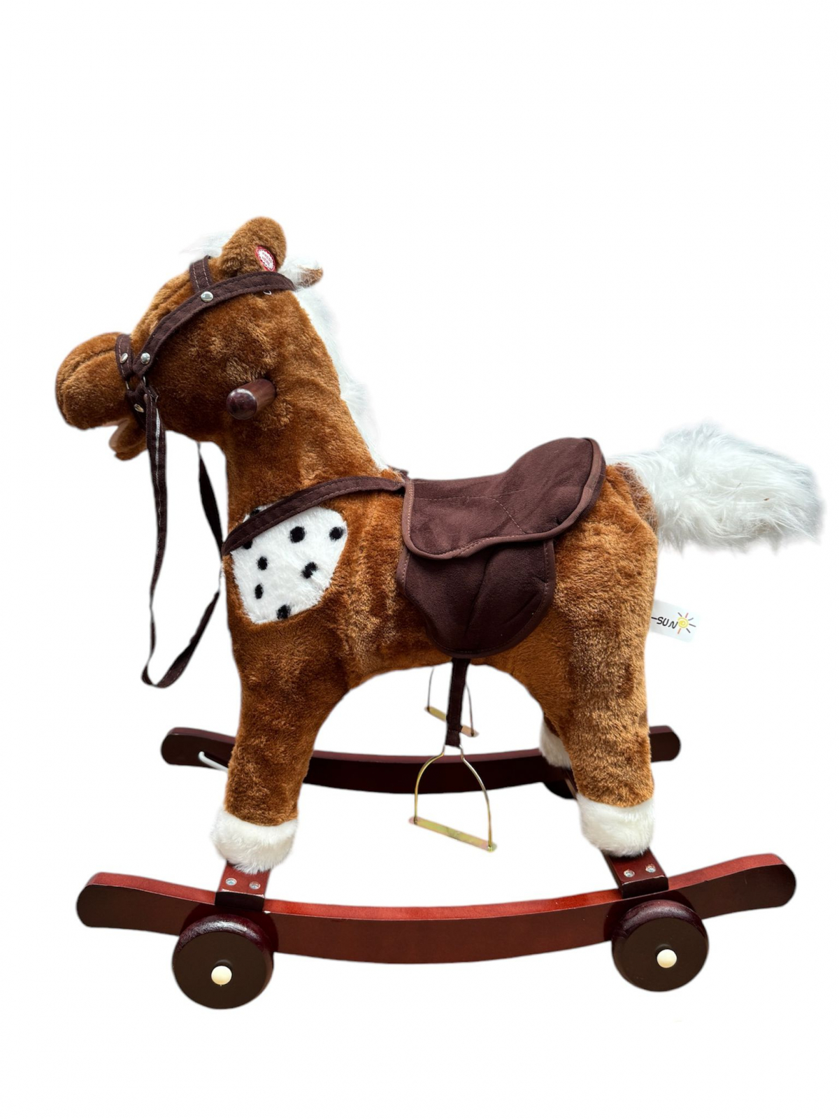 Calut care da din coada, din botic si necheaza atunci cand este apasat pe urechiuse, balansoar, din plus cu talpi si roti din lemn si cadru metalic, pentru copii, se balanseaza datorita miscarii inainte-inapoi a copilului, pe cele doua baze atasate, este dotat cu 2 manere de sprijin.Varsta recomandata: 1 - 3 ani.