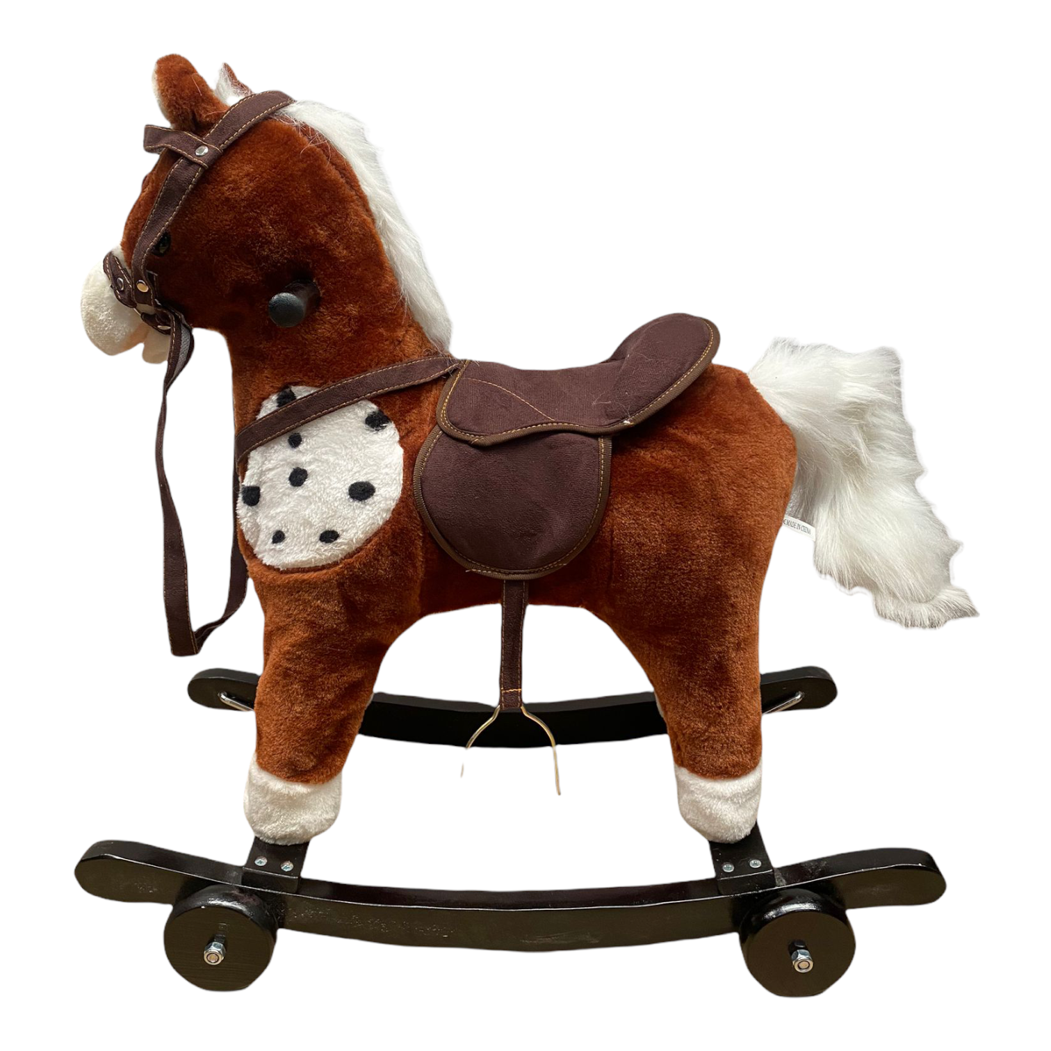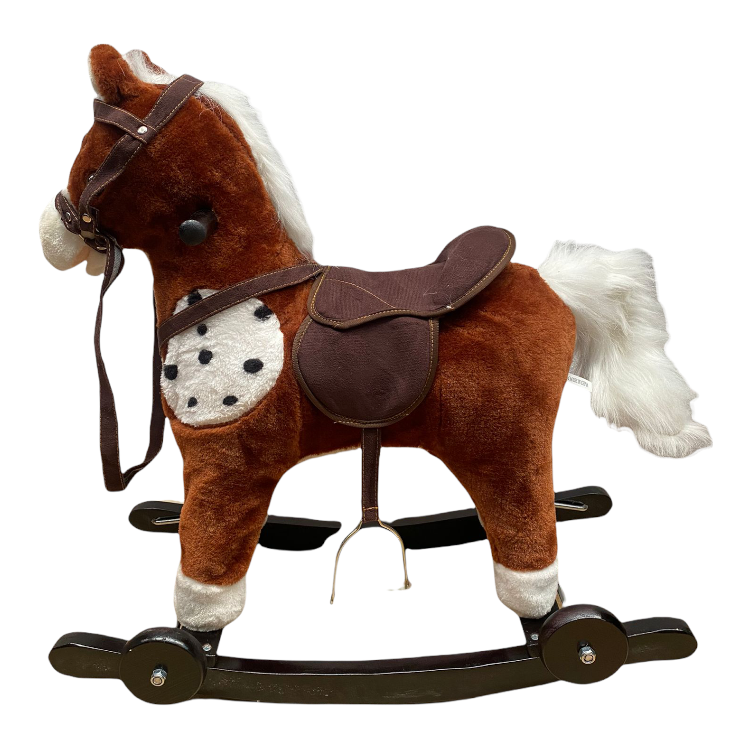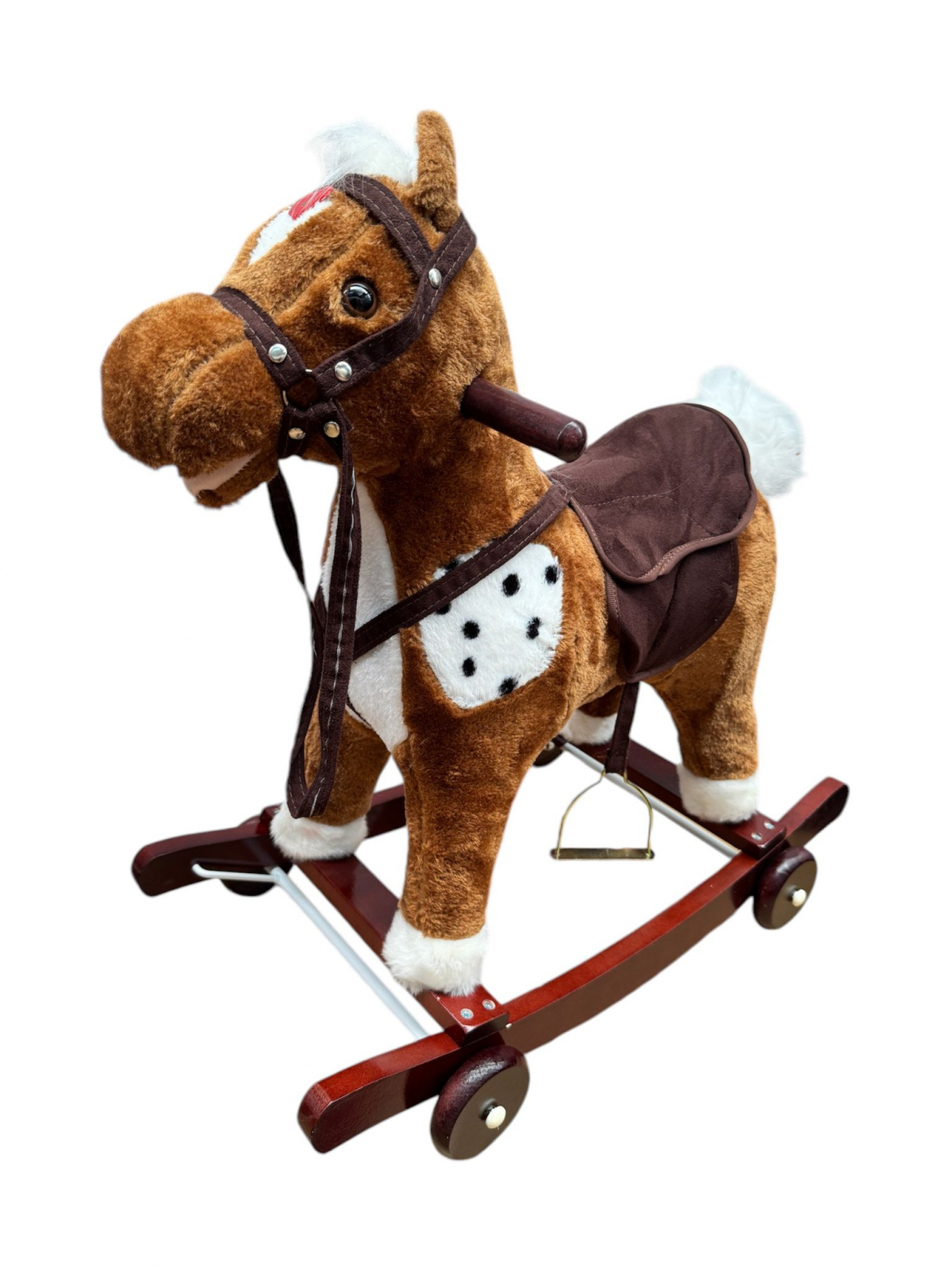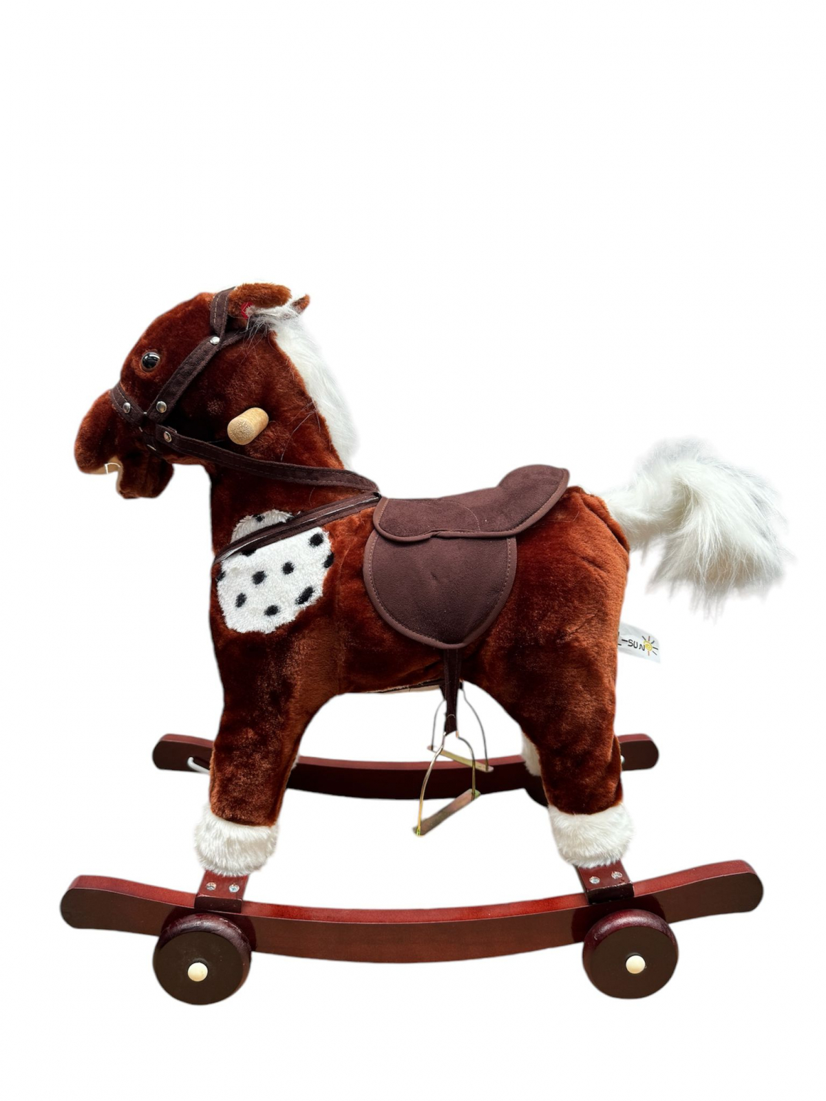 Calut care da din coada, din botic si necheaza atunci cand este apasat pe urechiuse, balansoar, din plus cu talpi si roti din lemn si cadru metalic, pentru copii, se balanseaza datorita miscarii inainte-inapoi a copilului, pe cele doua baze atasate, este dotat cu 2 manere de sprijin.Varsta recomandata: 1 - 3 ani.
