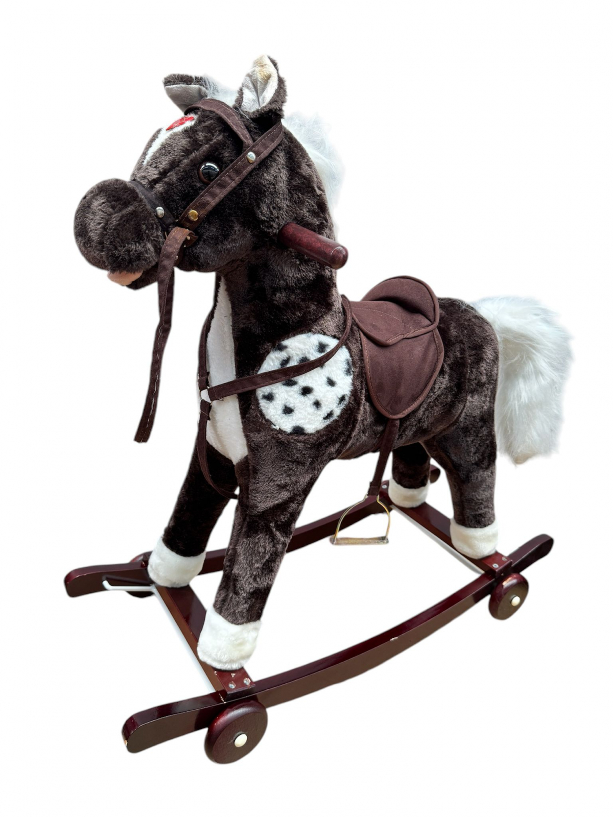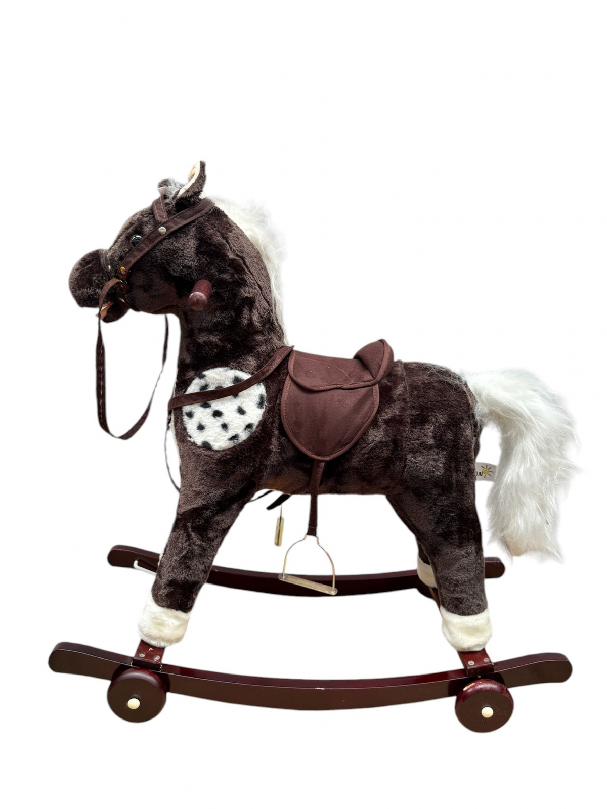 Calut care da din coada, din botic si necheaza atunci cand este apasat pe urechiuse, balansoar, din plus cu talpi si roti din lemn si cadru metalic, pentru copii, se balanseaza datorita miscarii inainte-inapoi a copilului, pe cele doua baze atasate, este dotat cu 2 manere de sprijin.Varsta recomandata: 1 - 3 ani.