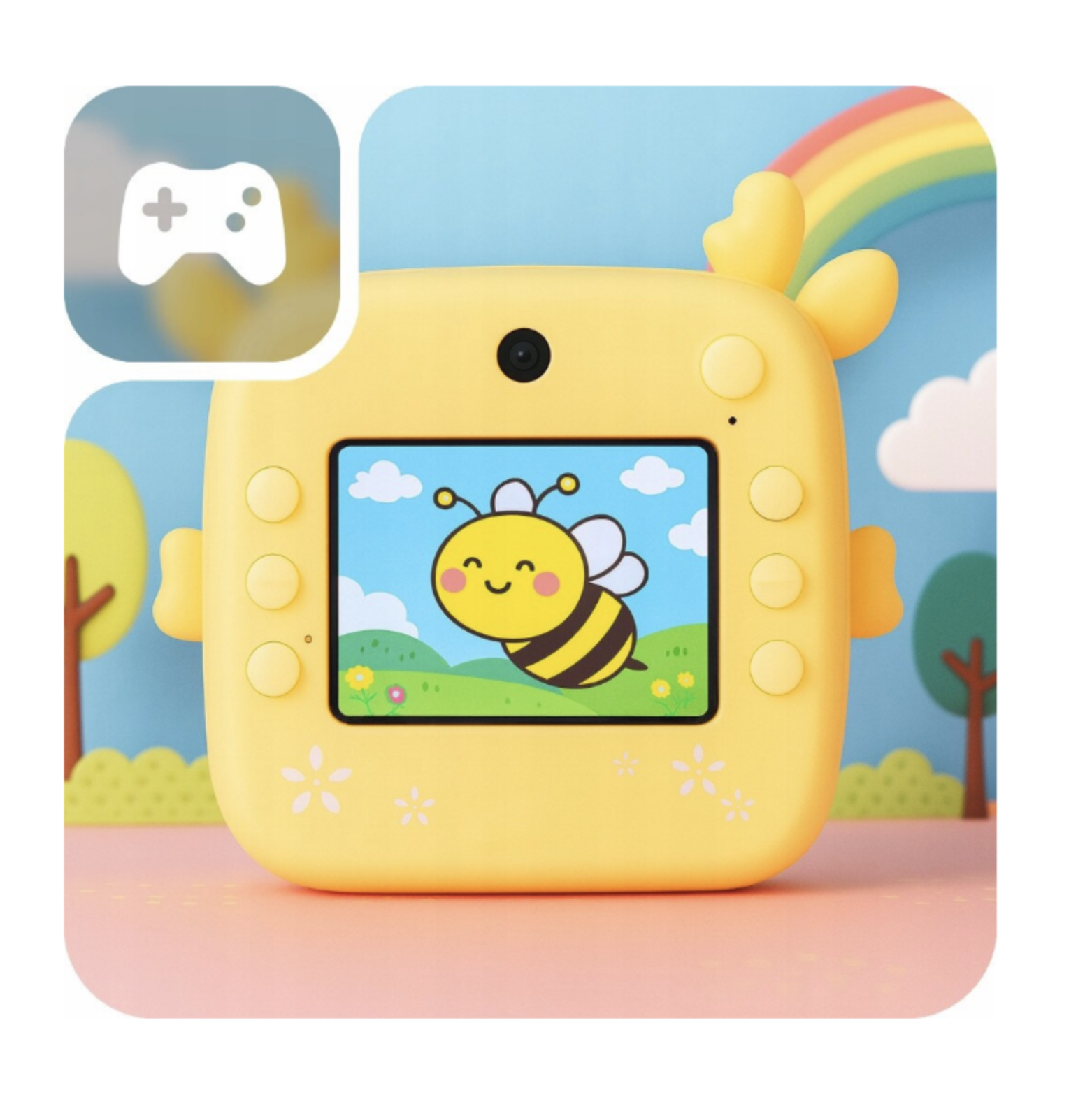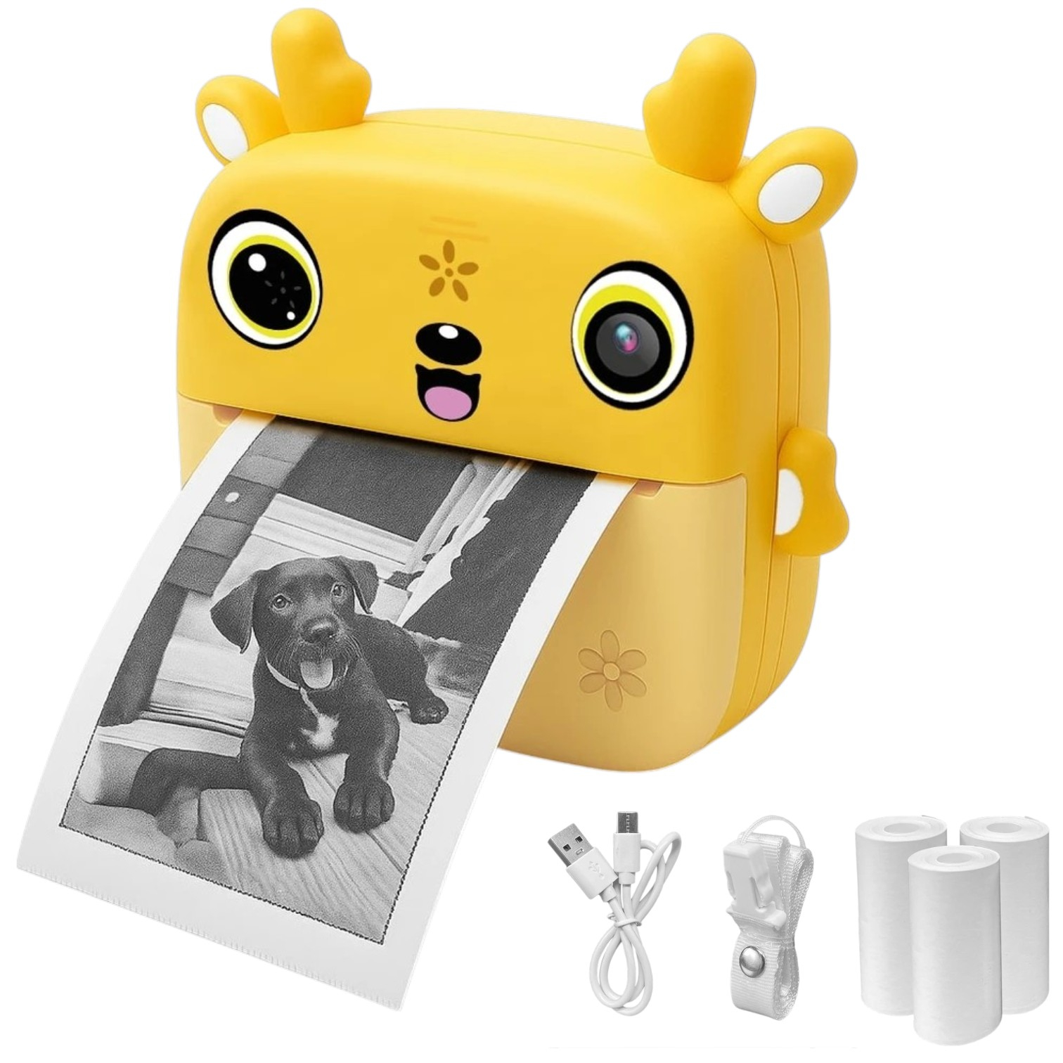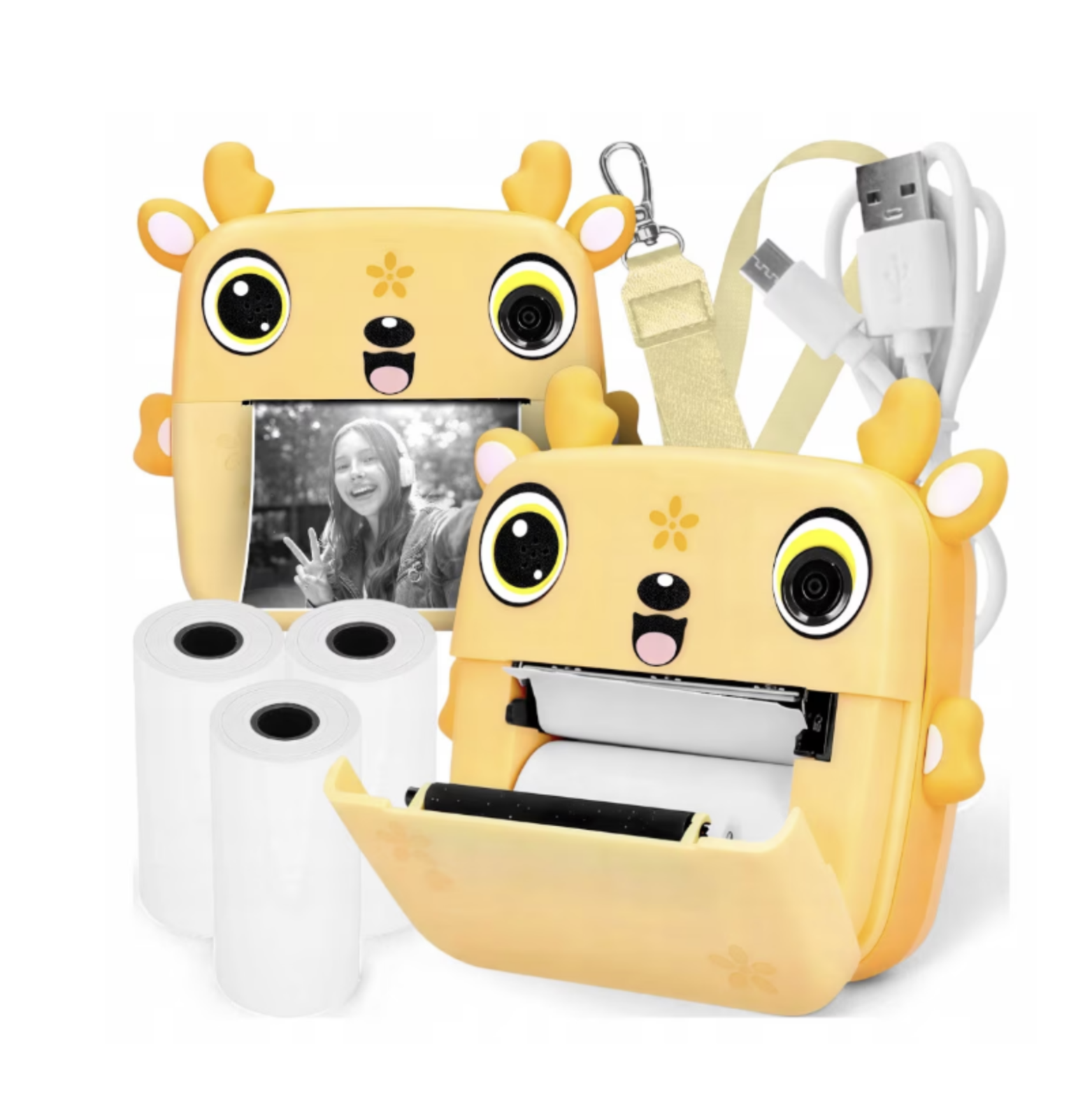 Camera foto copii cu imprimare instant, HD, video, jocuri, USB-C, 3 role, galben