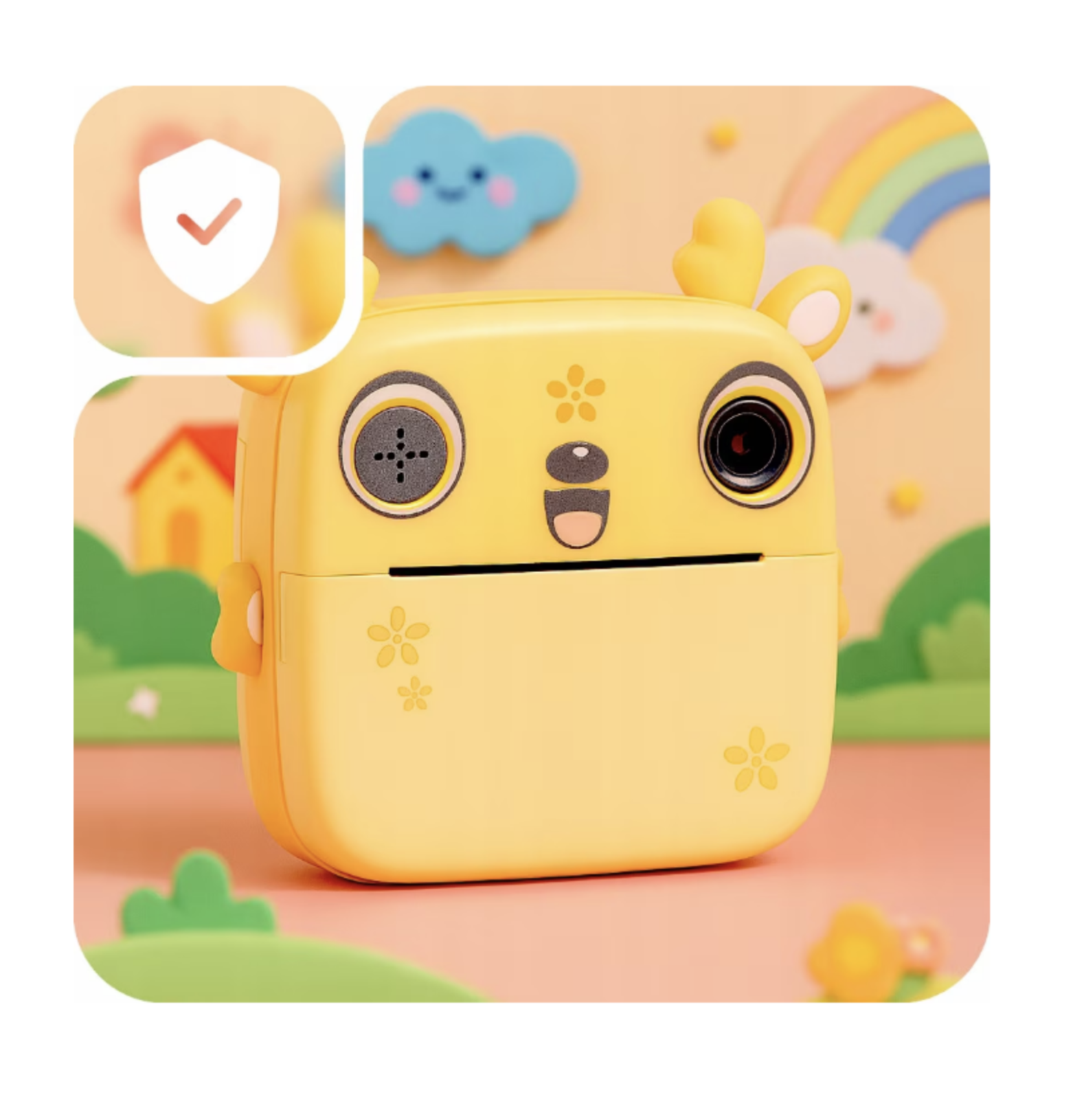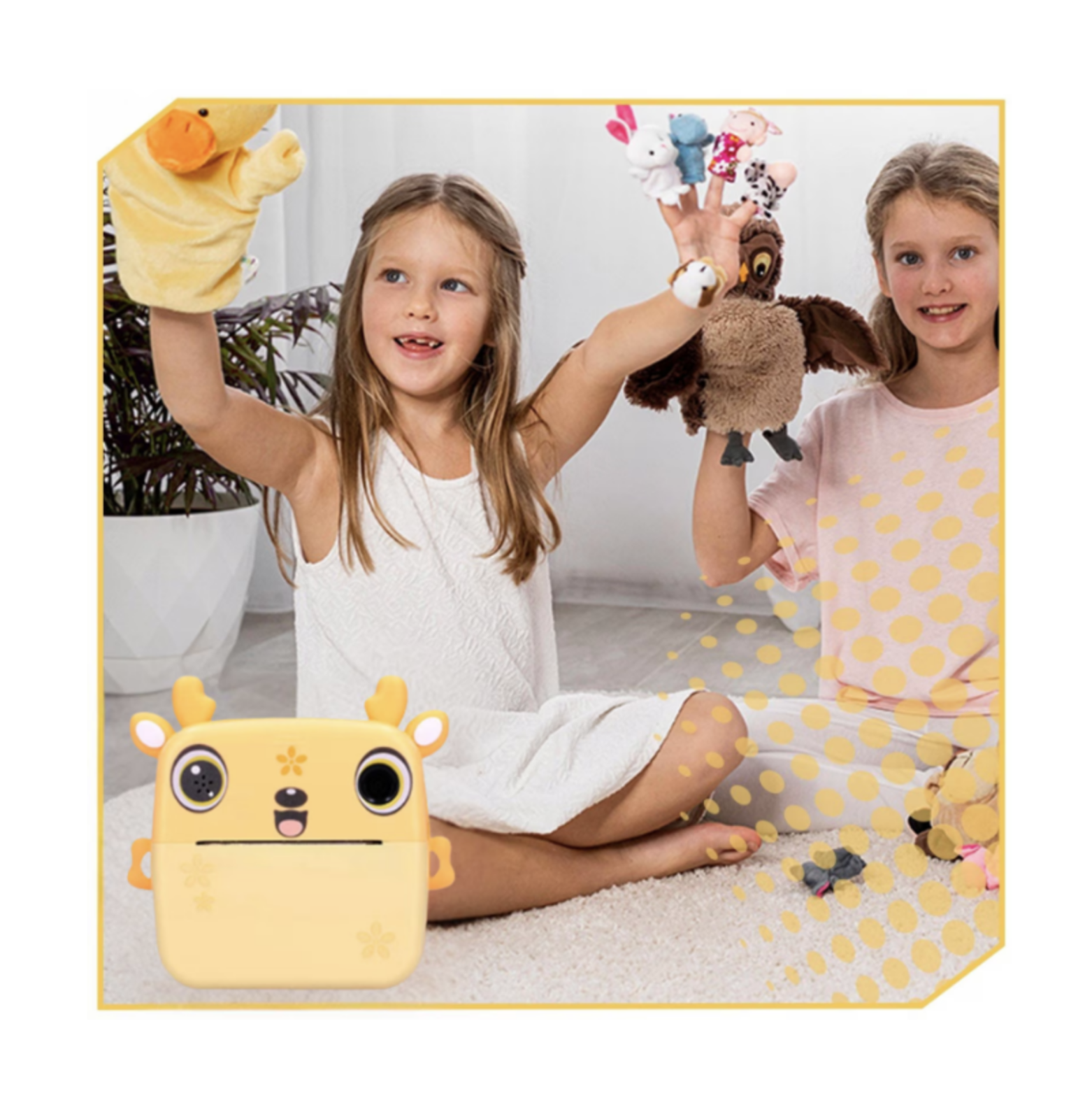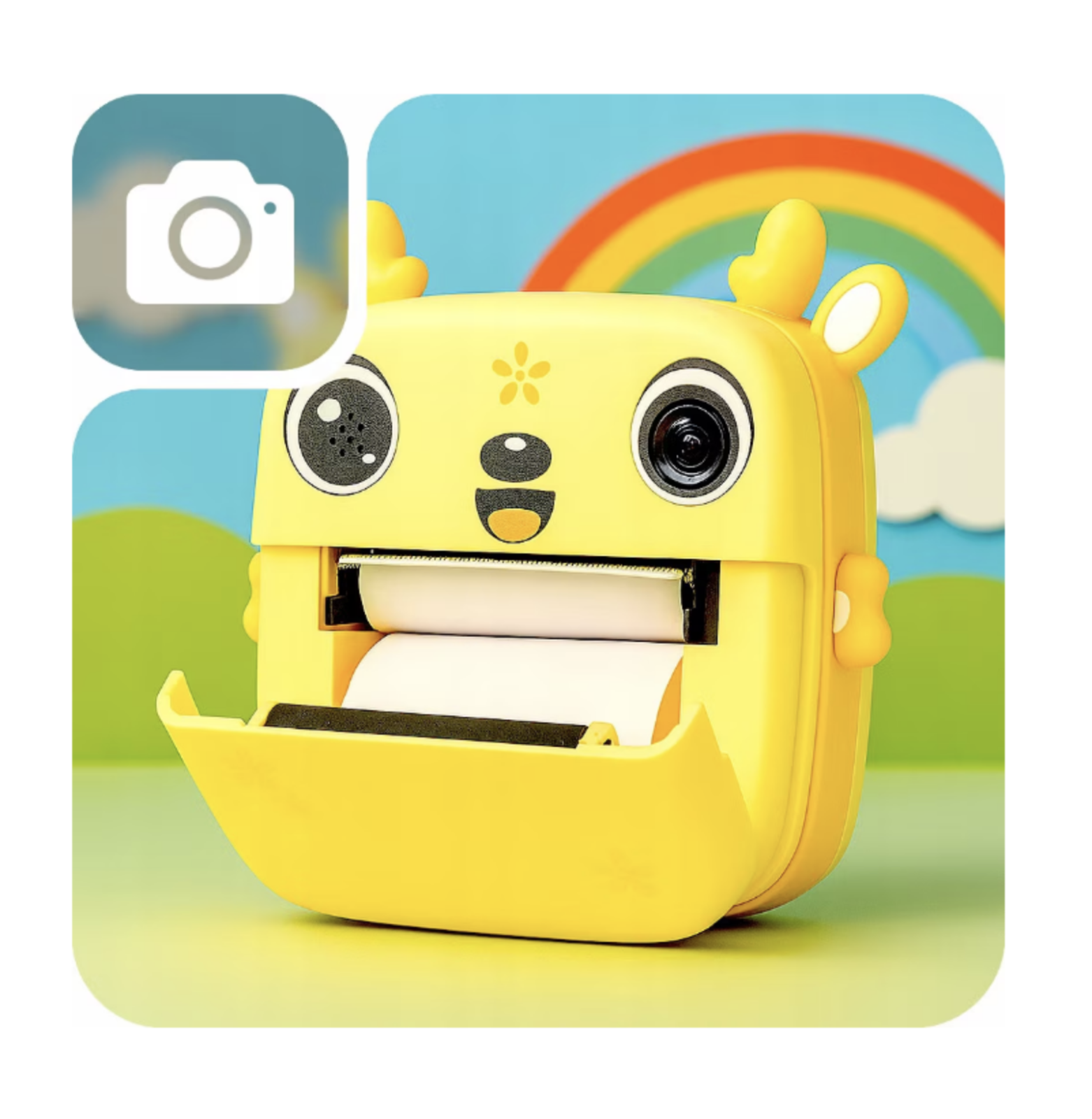 Camera foto copii cu imprimare instant, HD, video, jocuri, USB-C, 3 role, galben