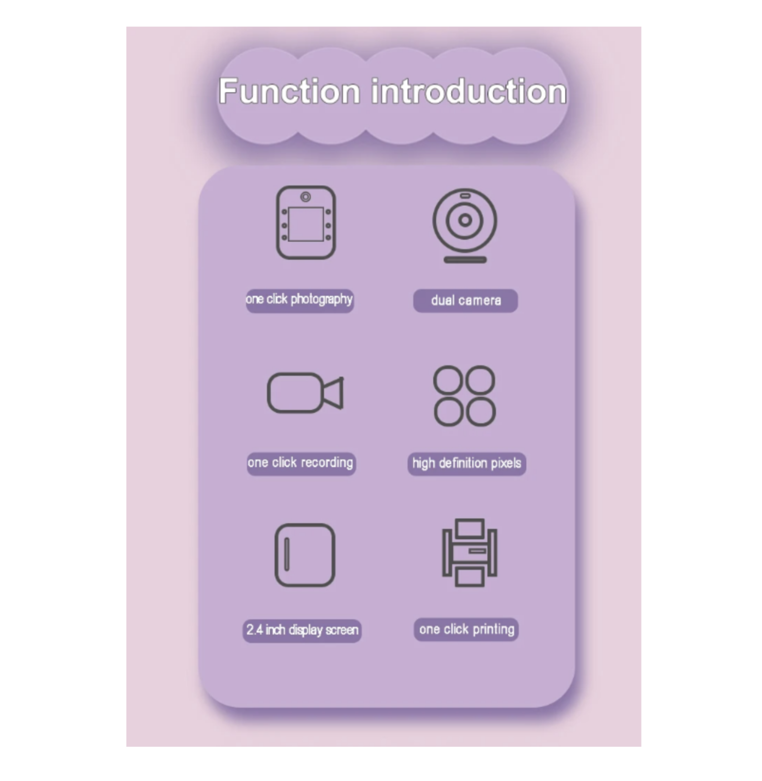 Camera foto digitala pentru copii cu imprimare instant alb-negru, ideala pentru joaca si creativitate. Permite realizarea de fotografii si videoclipuri, include jocuri si functii multimedia, fiind usor de utilizat si transportat.