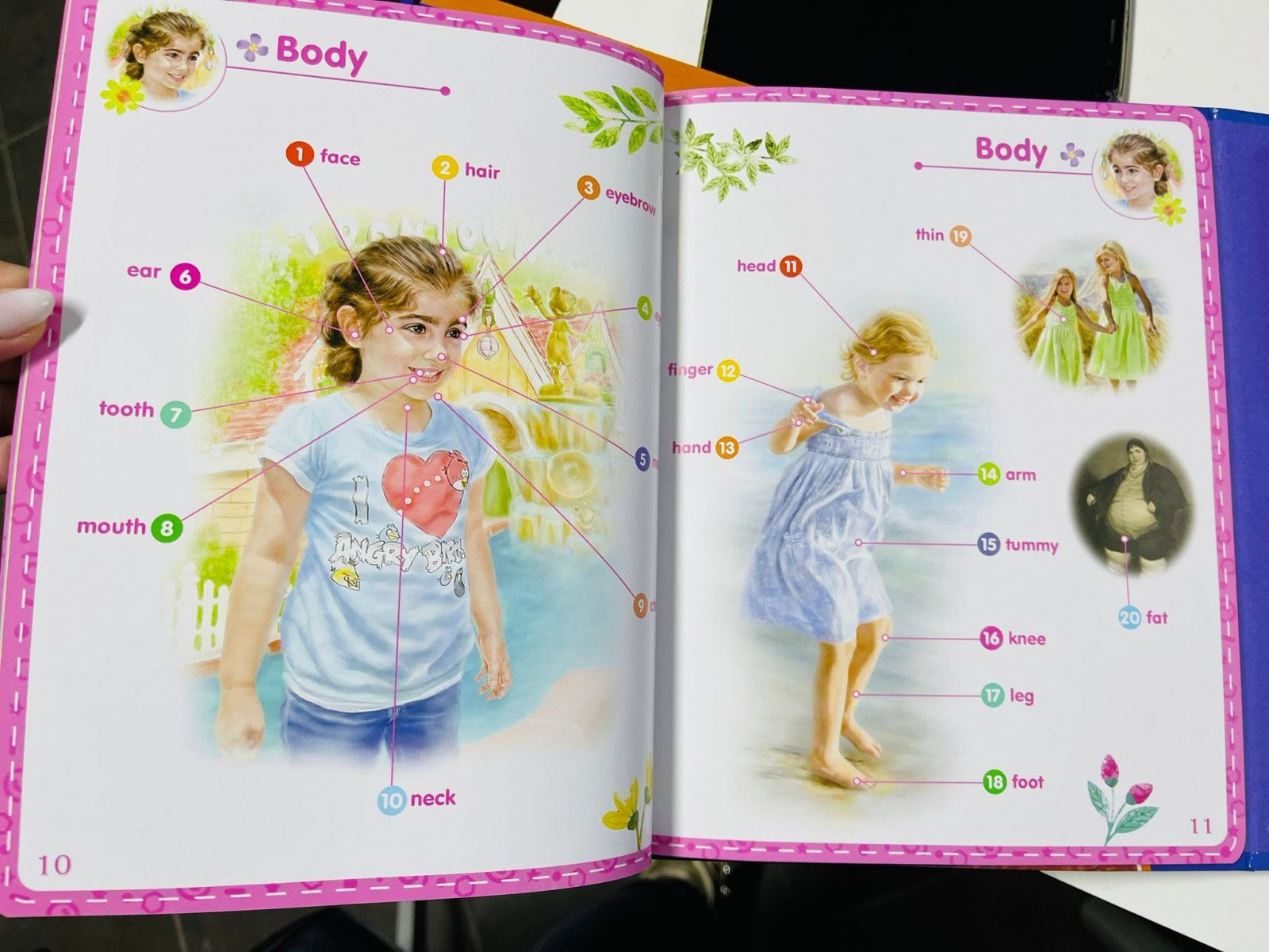 - fiecare tema este cu cate 20 cuvinte, reprezentate pe tableta cu numarul specific din carte (de ex la Body - nr 5 este pentru nose, iar prin apasarea pe tableta a tastei 5, aceasta va rosti cuvantul in engleza specific pentru nas)