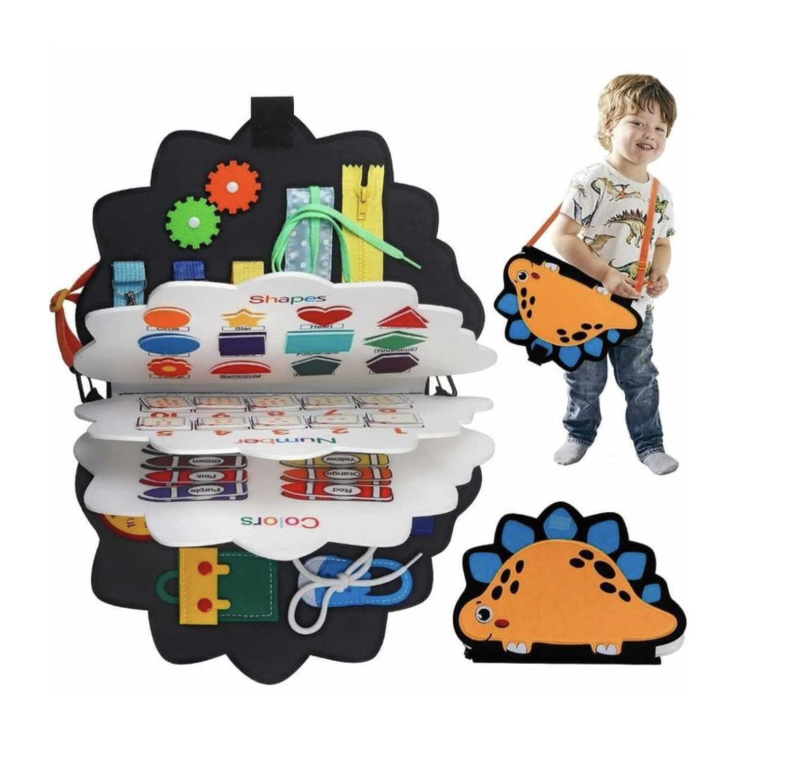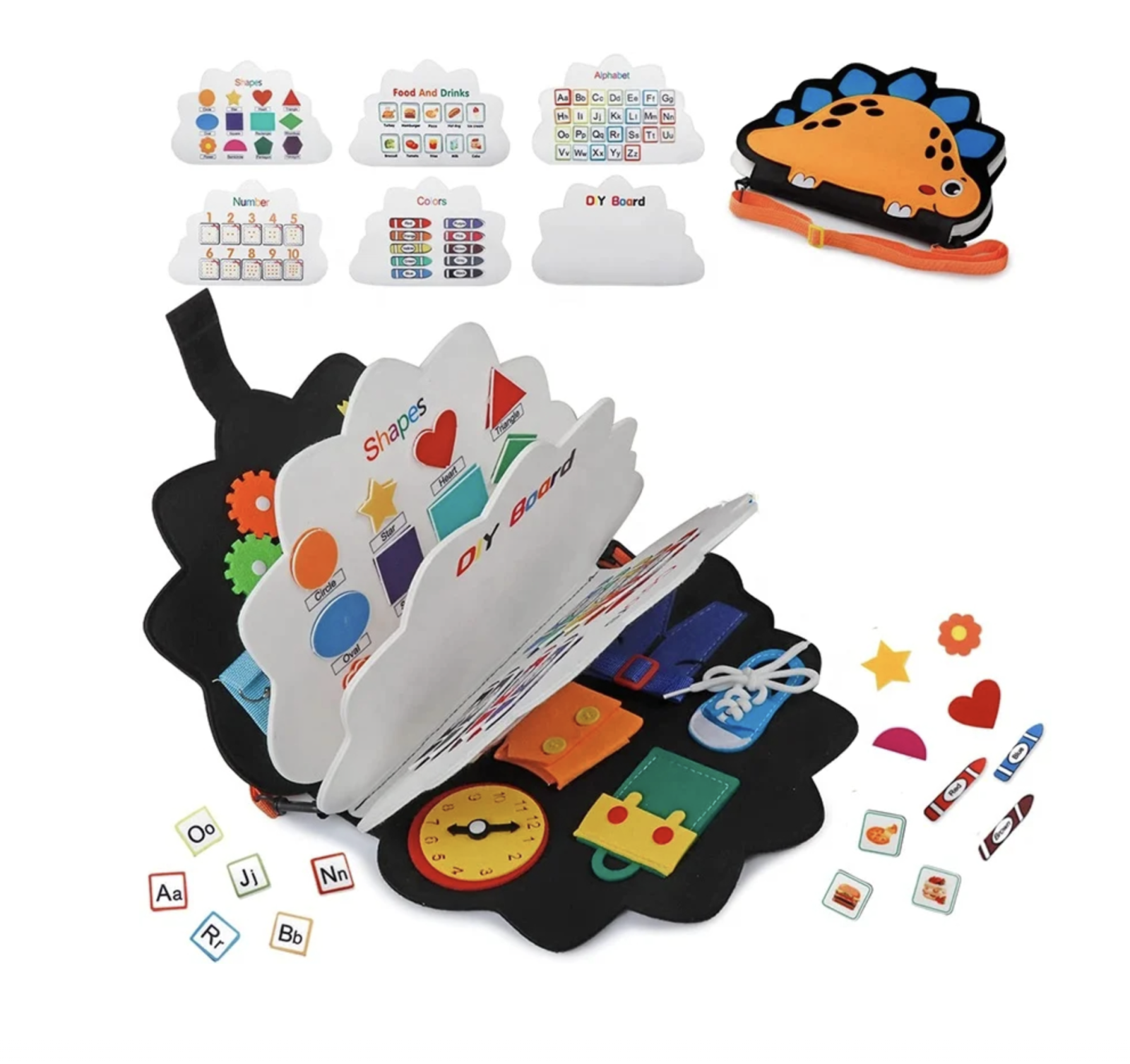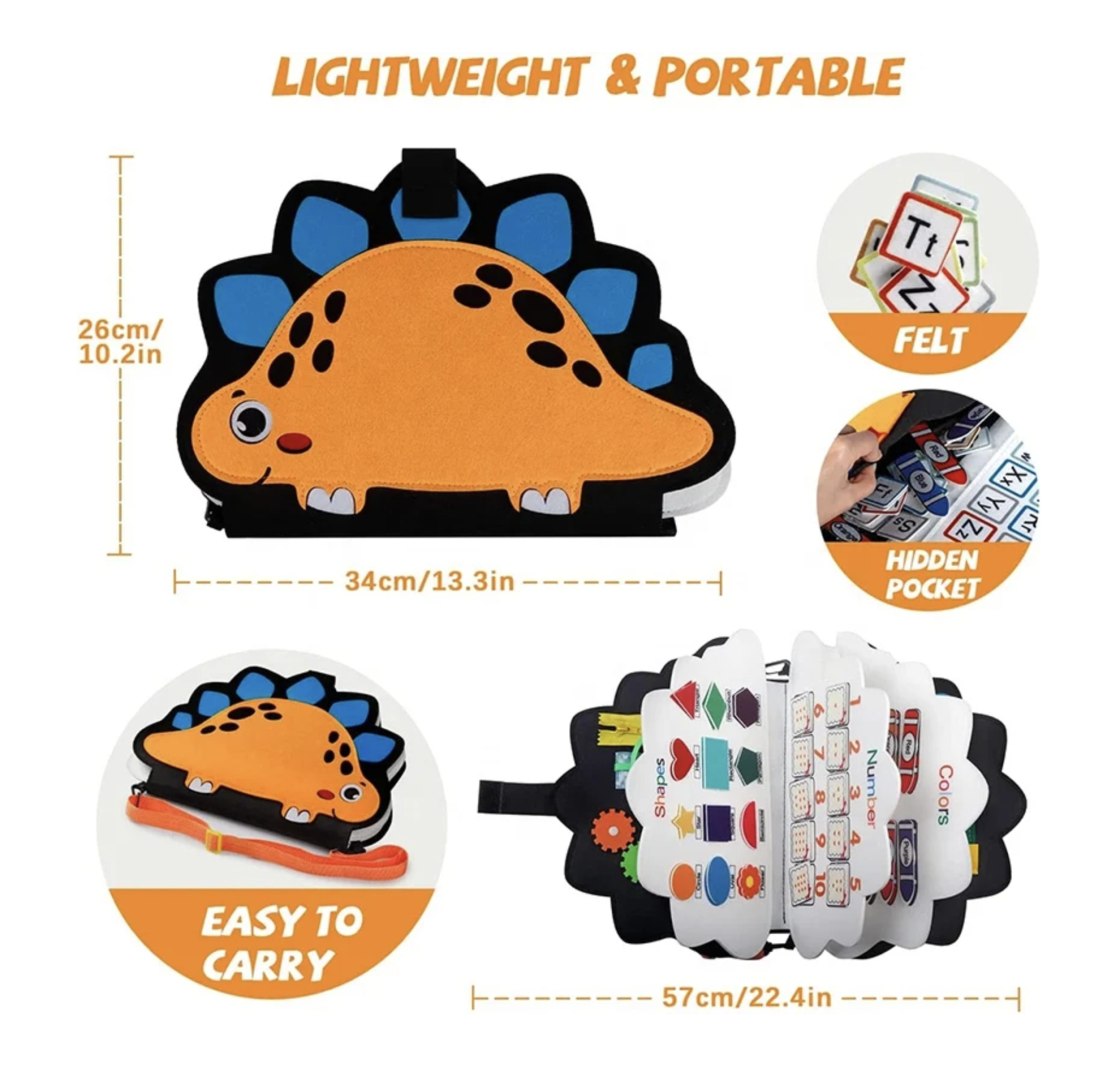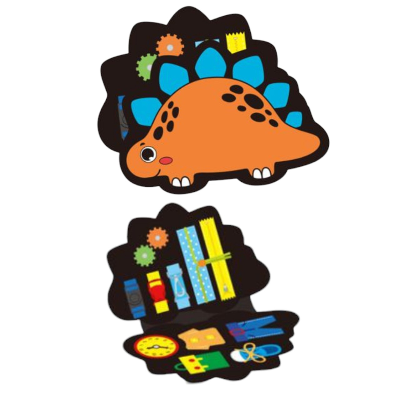 1 x Busy Board Interactiv Dinozaur cu multiple sisteme de inchidere/deschidere (fermoar, nasturi, catarame, sireturi)