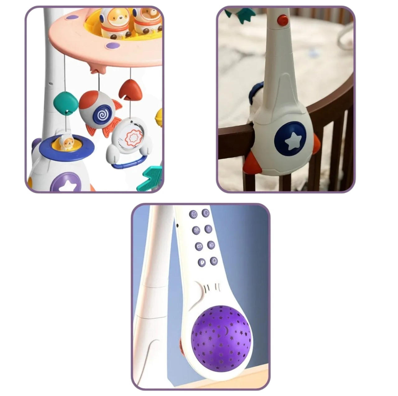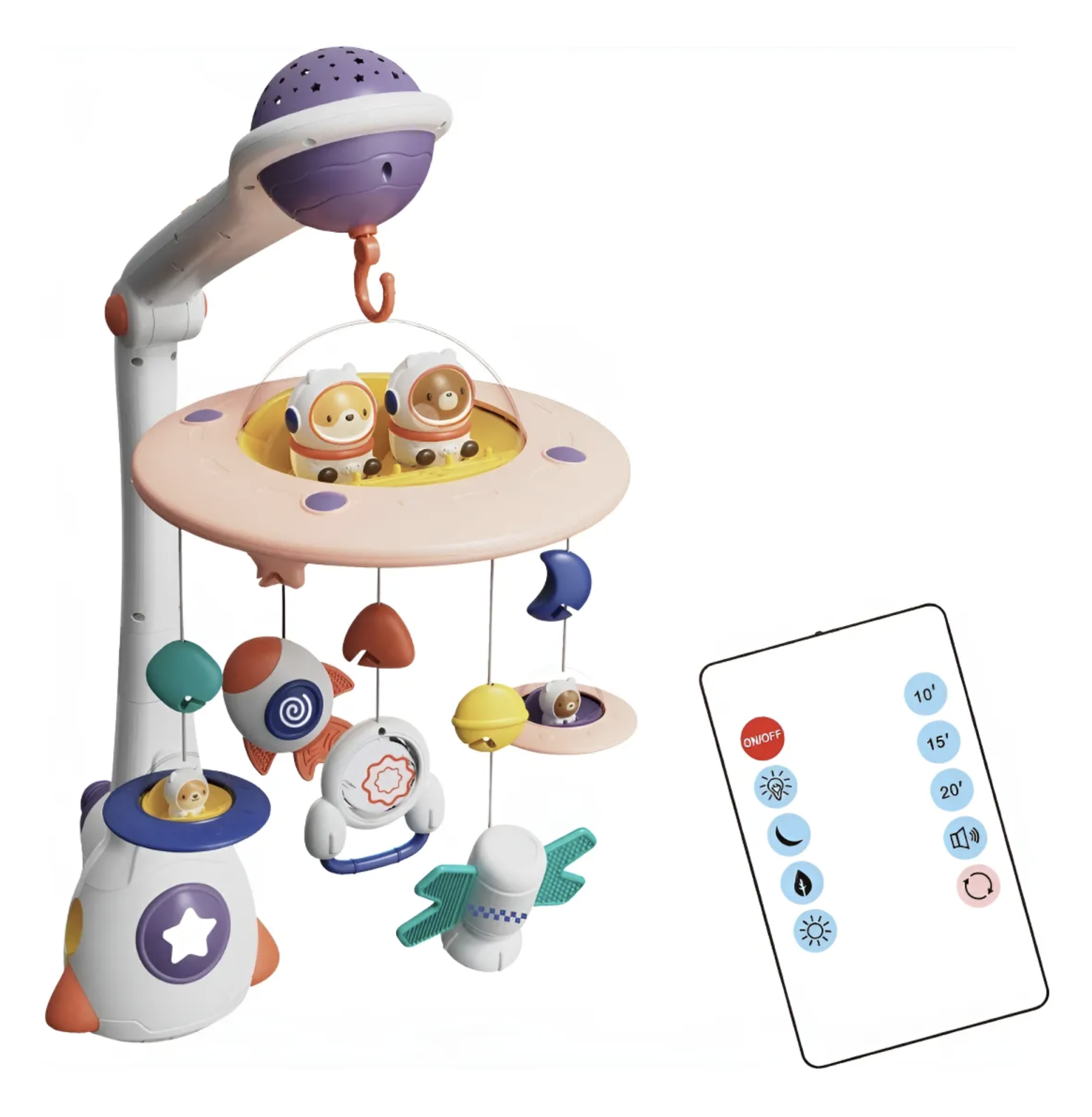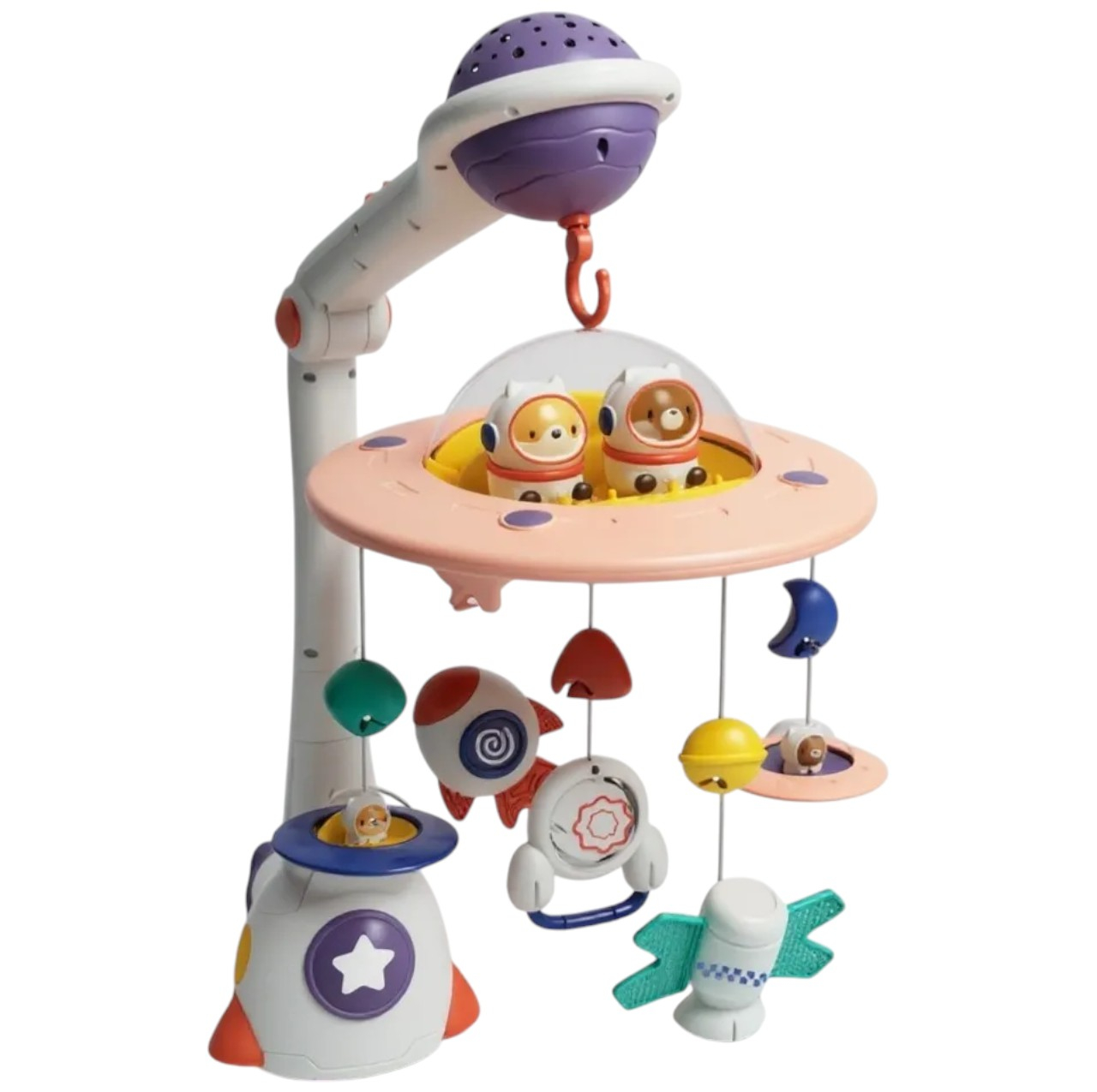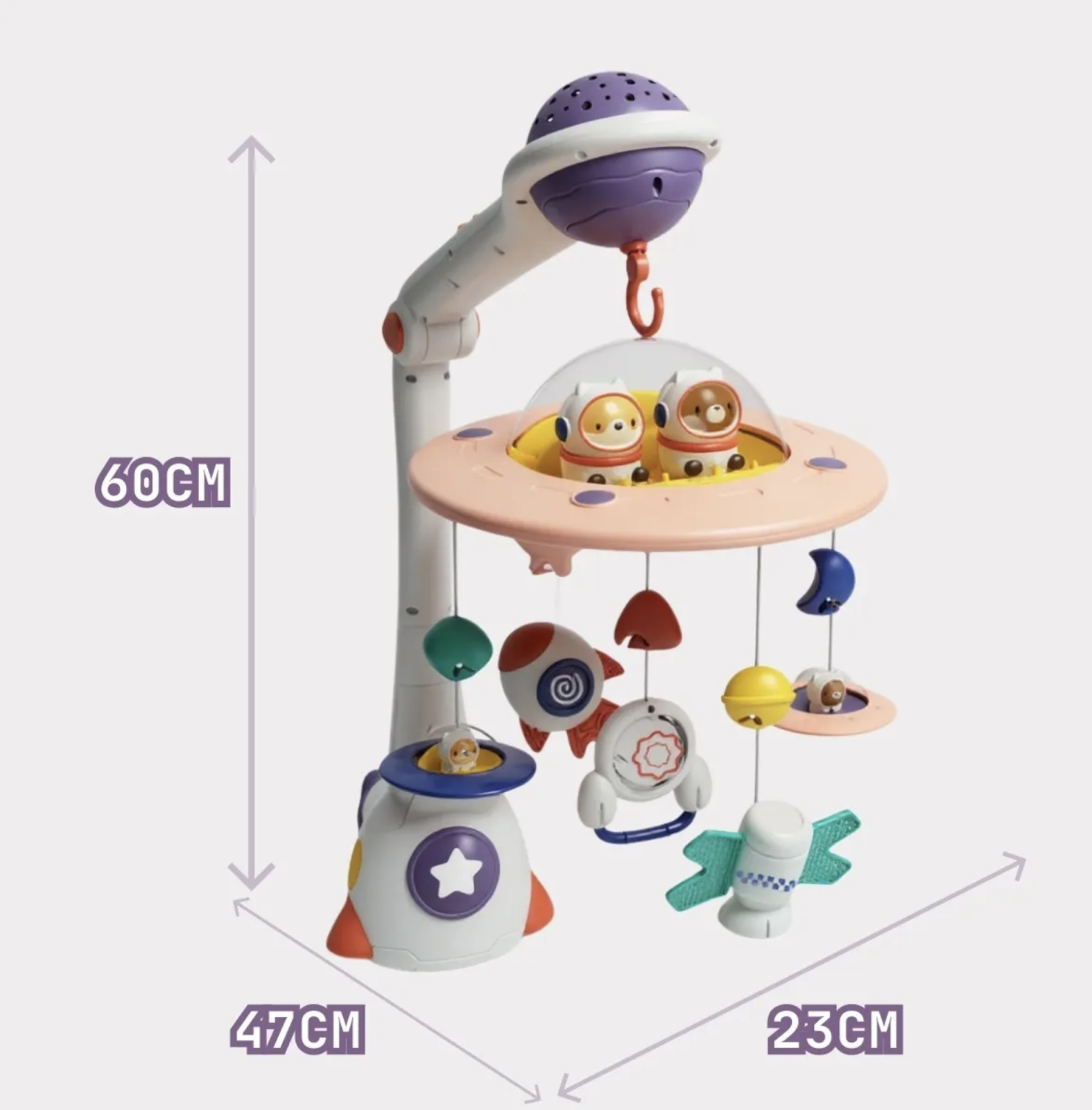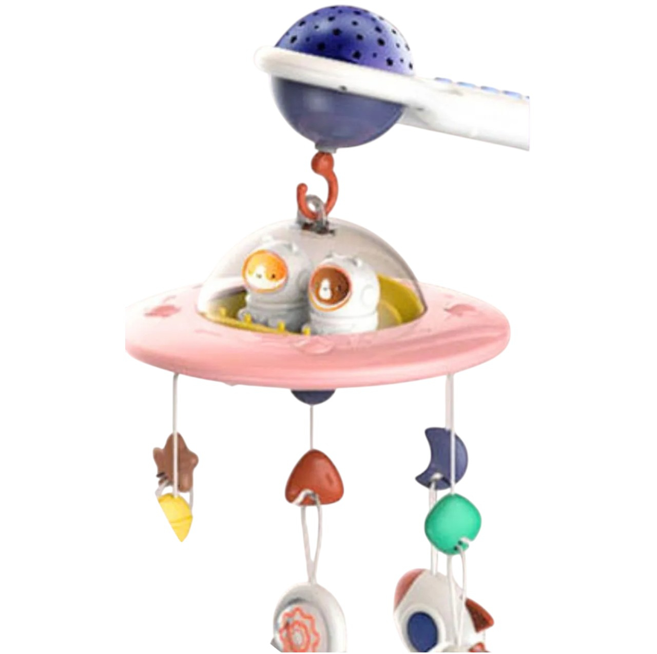 Transforma momentul de somn intr-o calatorie printre stele cu Mobile-ul Muzical cu Tema Spatiala. Conceput pentru a captiva atentia bebelusilor si a crea o atmosfera calma si relaxanta, acest mobile proiecteaza cerul instelat, emite sunete linistitoare si lumini blande. Designul sau in forma de nava spatiala si elementele suspendate care se rotesc 360° aduc un plus de magie in camera copilului.