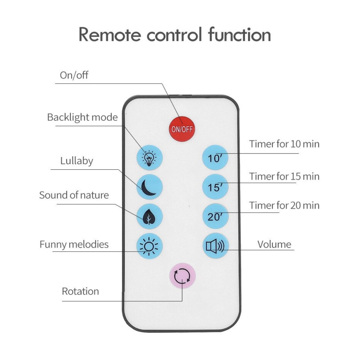 Telecomanda inclusa – permite control de la distanta asupra muzicii, volumului si proiectiei, fara a trezi bebelusul
