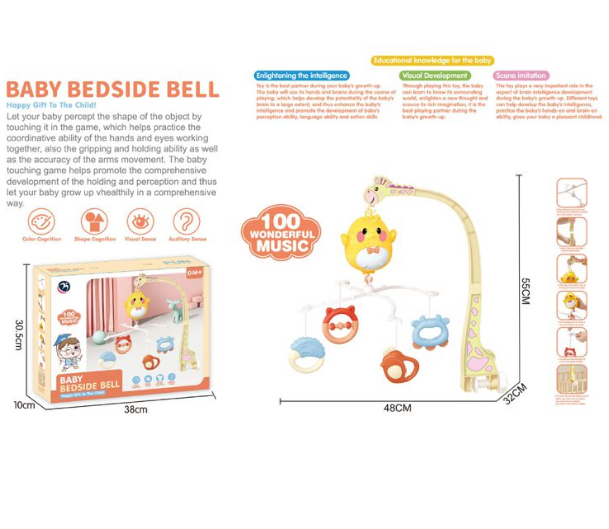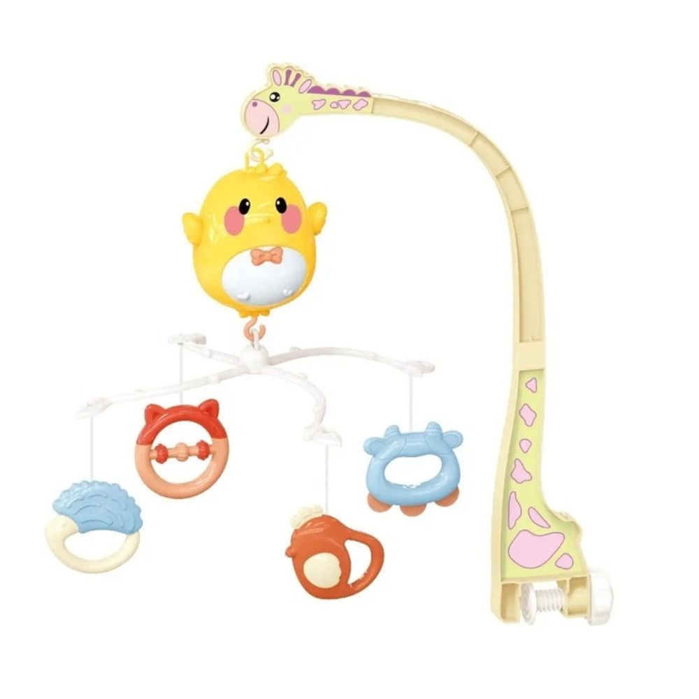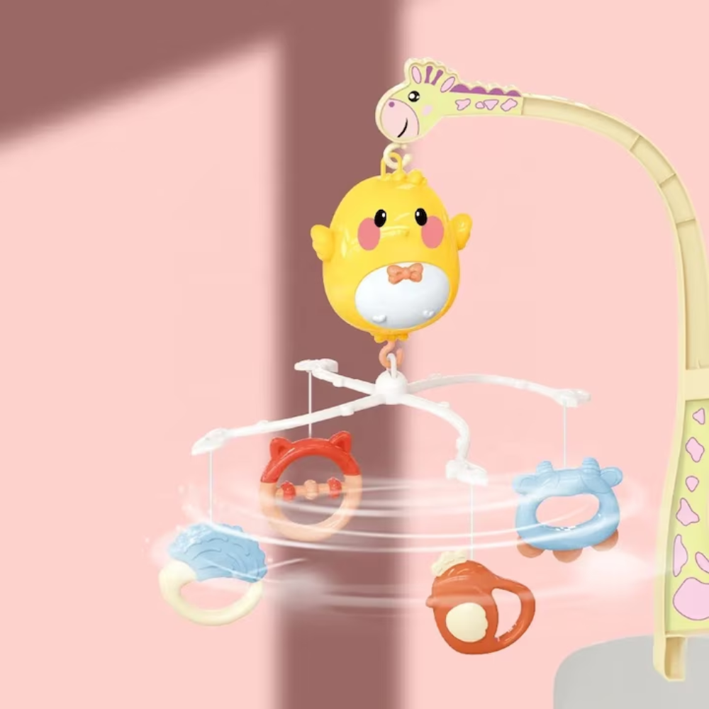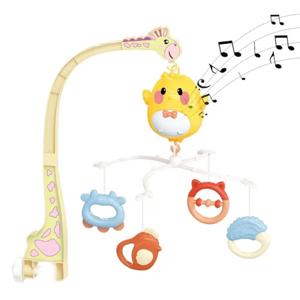 Caruselul muzical Girafa este un accesoriu distractiv si educational pentru patutul bebelusului, conceput pentru a stimula simturile si curiozitatea celor mici. Cele 4 jucarii zornaitoare detasabile se rotesc lent, iar figurina cu forma de puisor reda melodii placute atunci cand se apasa butonul, oferind o experienta multisenzoriala completa.