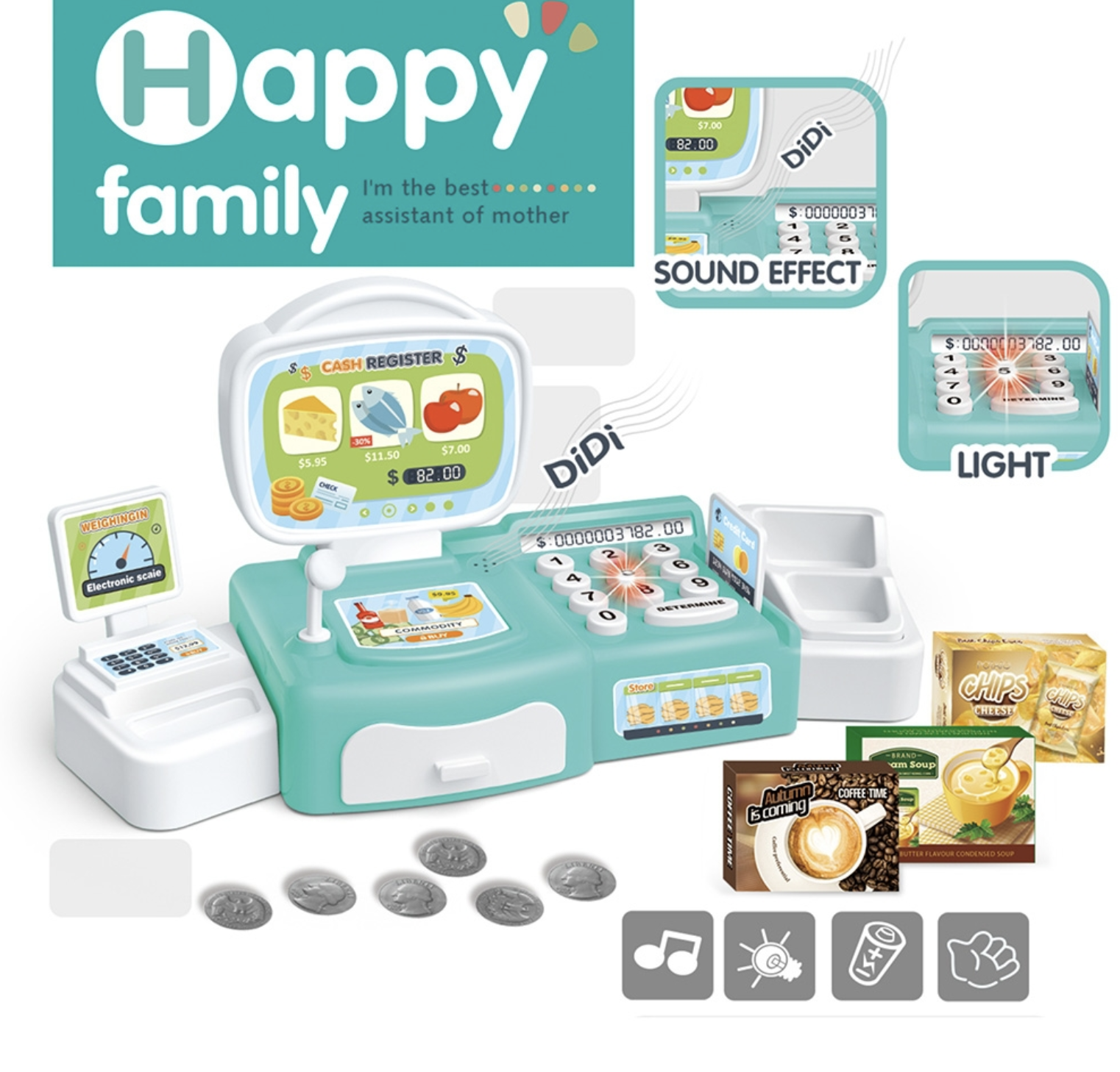 Casa de marcat cu sertare laterale Happy Family, cu sunete si lumini, vernil