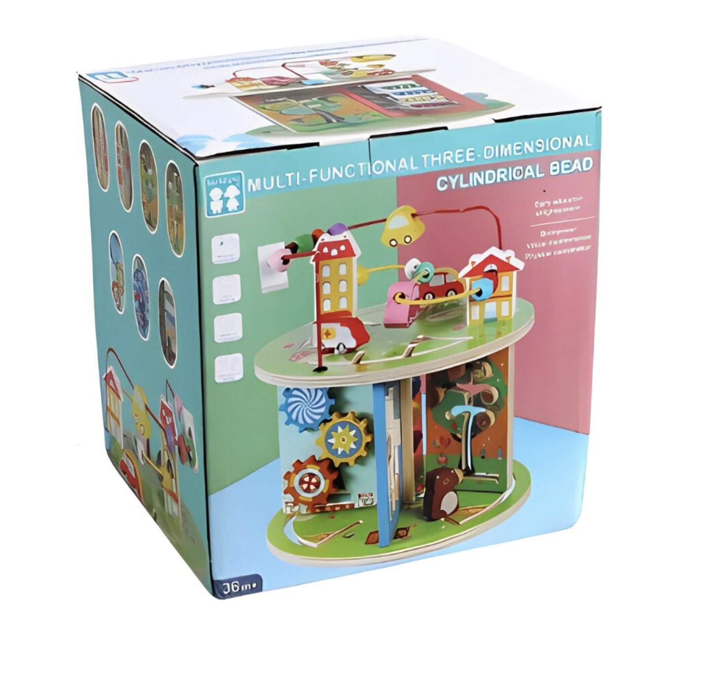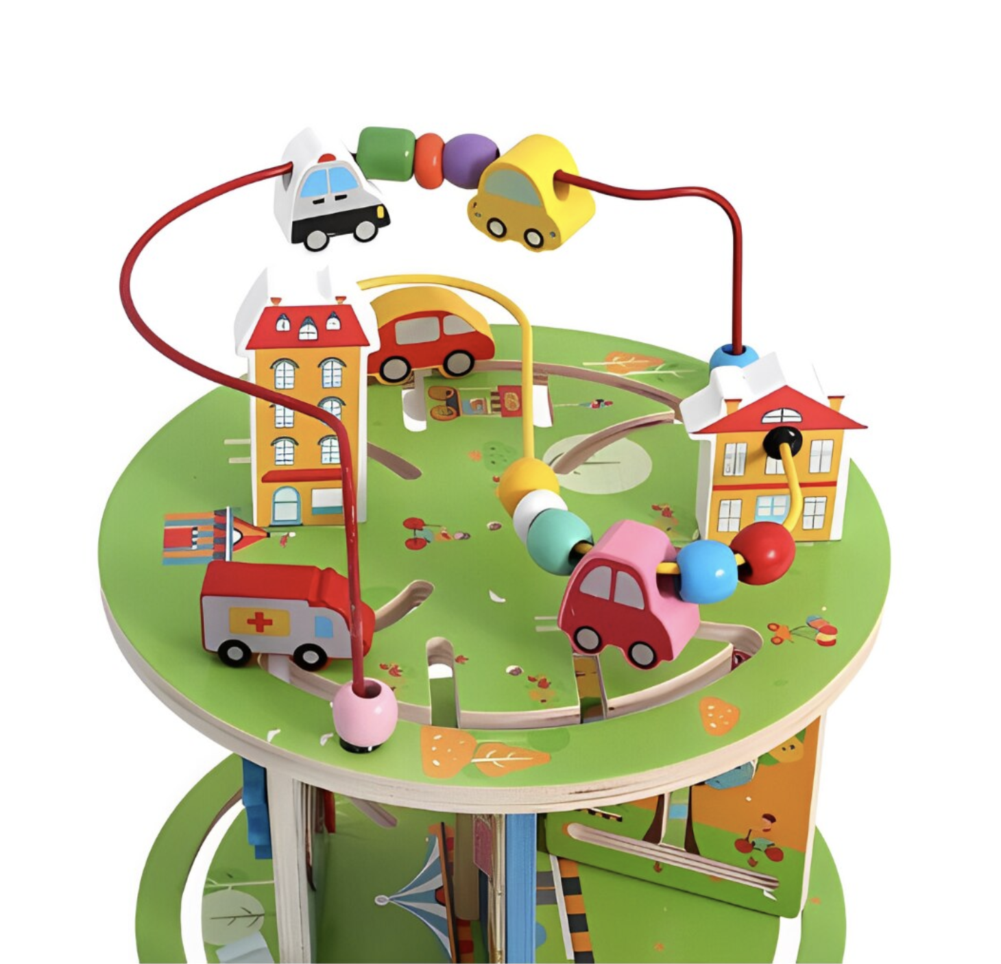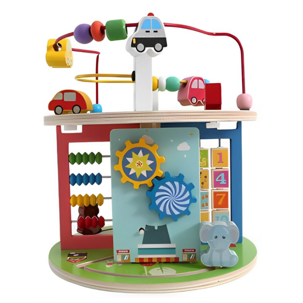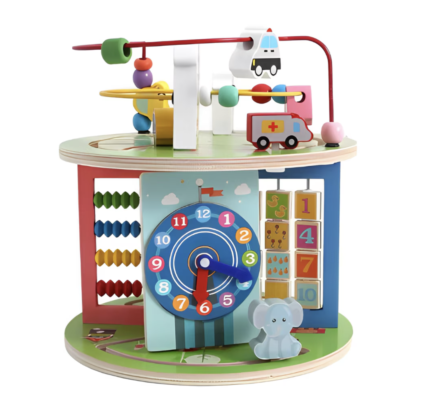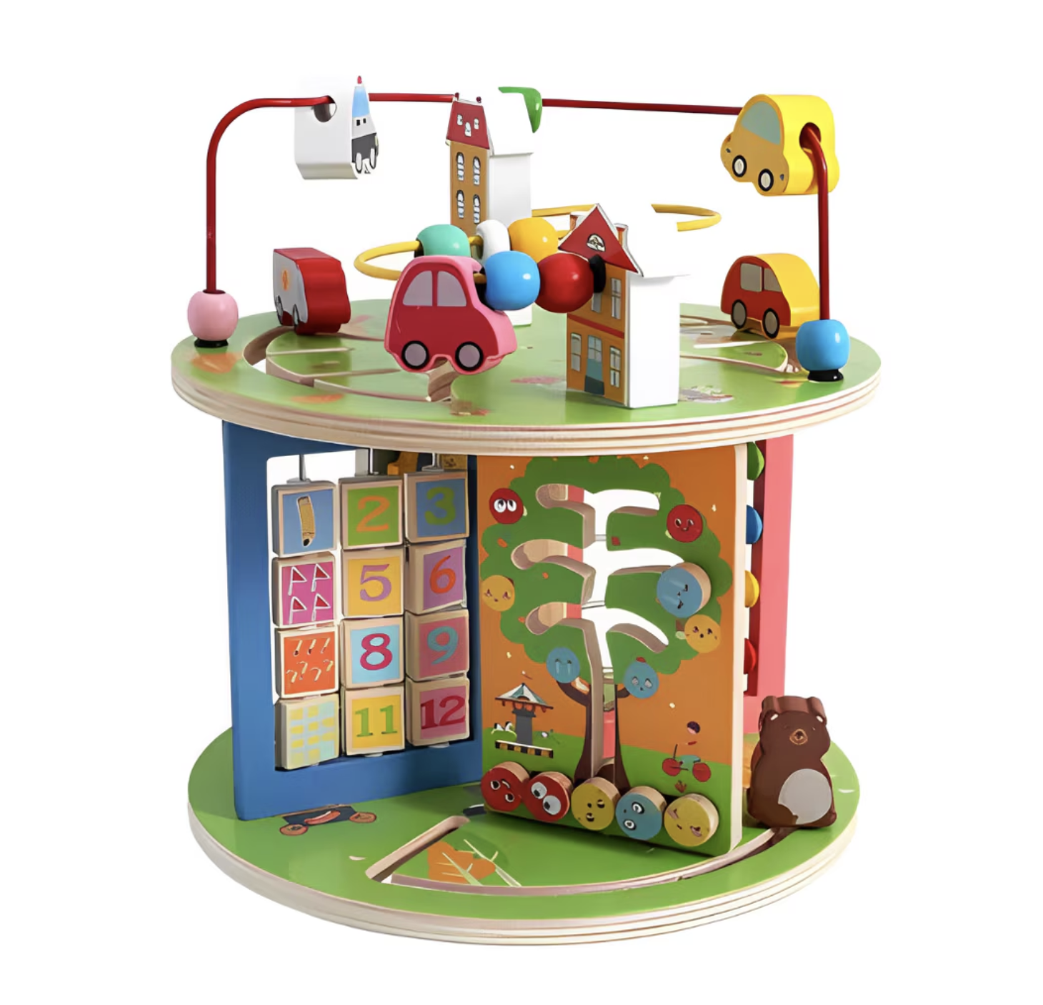 Cu un design atractiv, din lemn vopsit in culori vii, centrul include labirinte, abac, ceas, roti zimtate si multe alte activitati care vor tine copilul ocupat ore intregi. Este perfect pentru acasa, gradinite sau spatii de joaca.