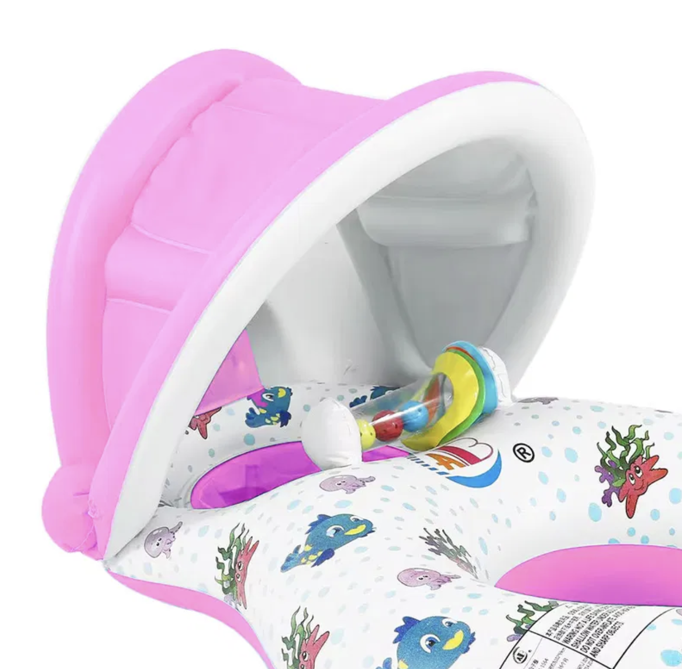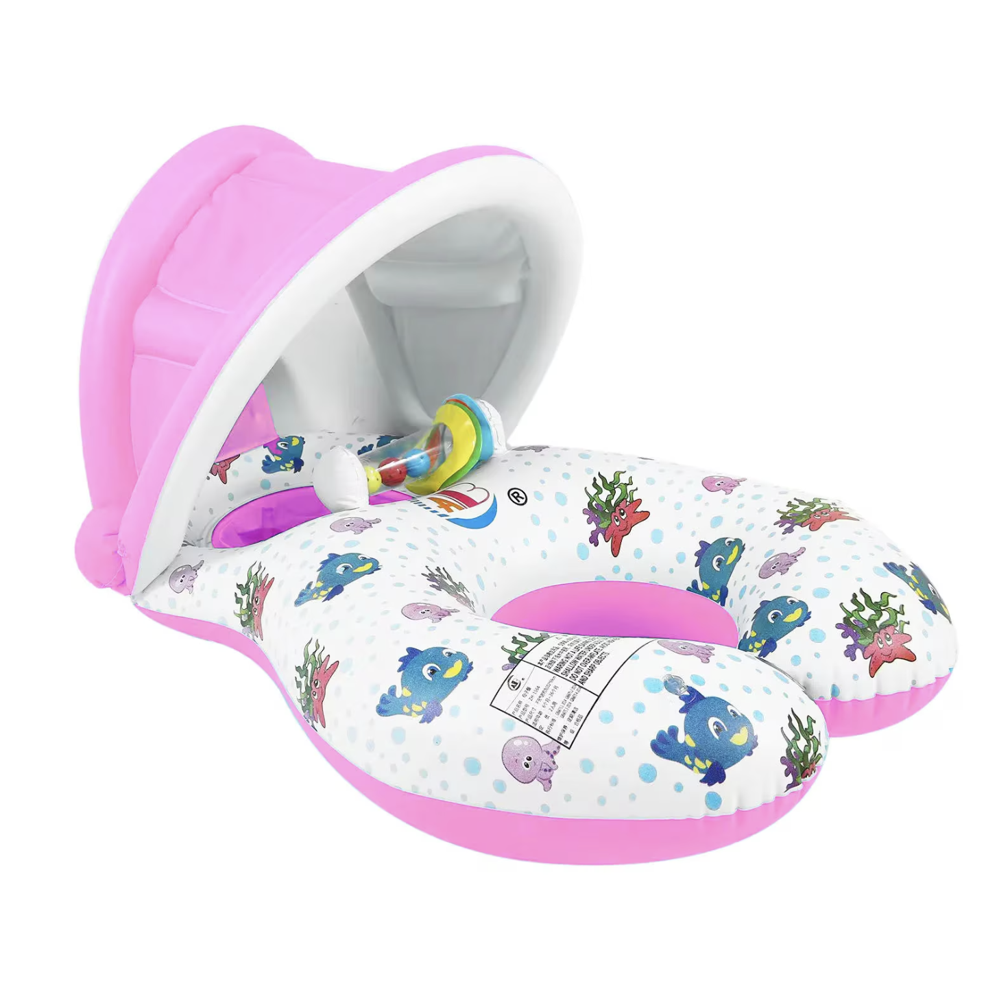 Colac gonflabil dublu proiectat pentru interactiune directa intre parinte si copil in timpul inotului. Modelul faciliteaza acomodarea bebelusului cu apa intr-un mod sigur si distractiv, oferind suport ergonomic si protectie solara.