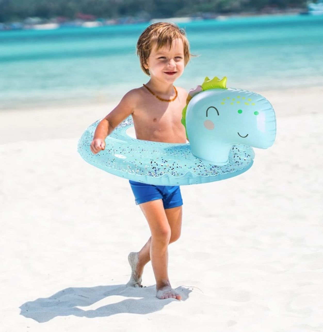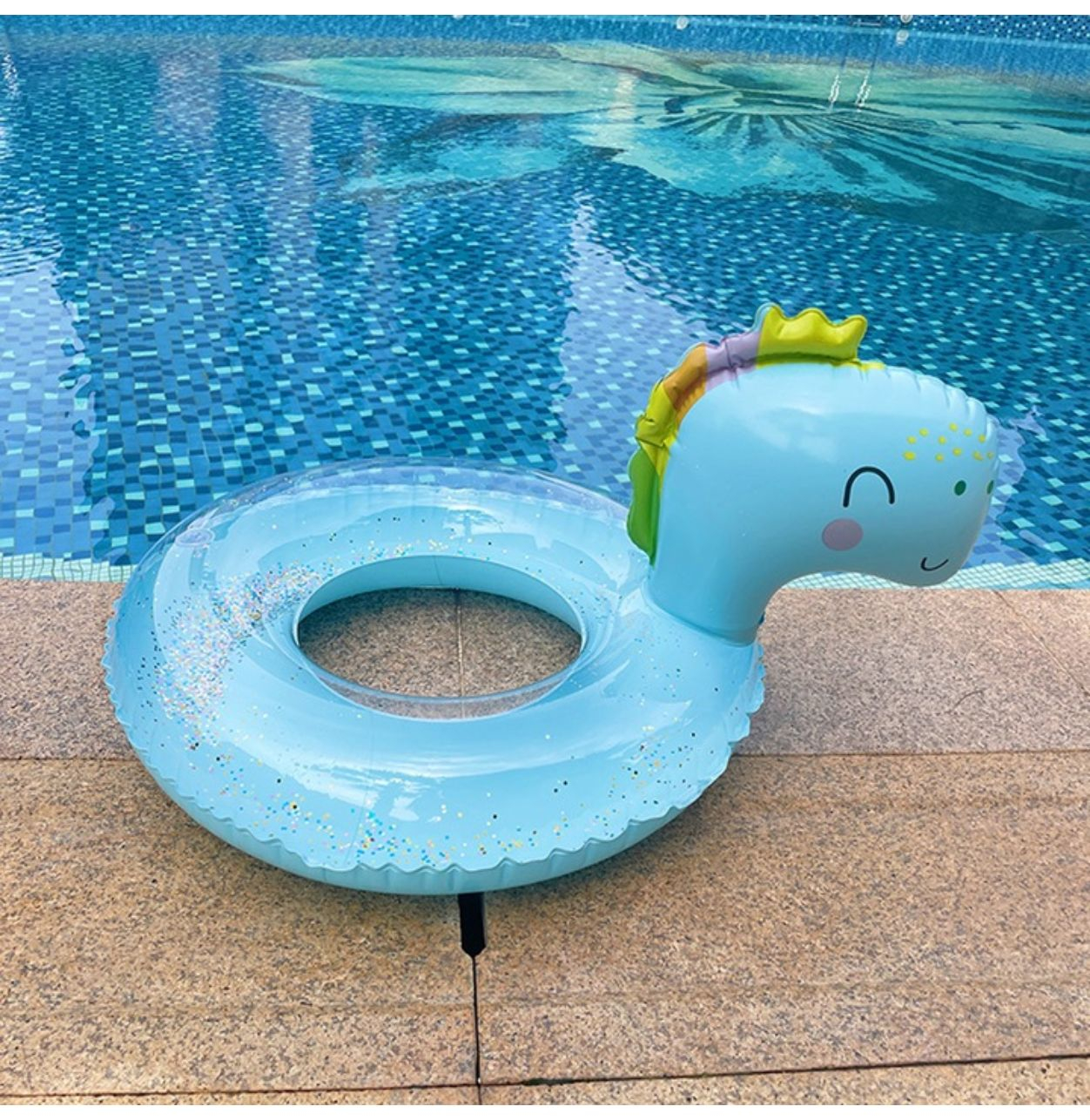 Colacul gonflabil in forma de dinozaur este ideal pentru distractia copiilor in apa, oferind un design atractiv si modern. Realizat din PVC rezistent, colacul are sclipici in interior, care creeaza un efect vizual placut si captivant in timpul utilizarii.