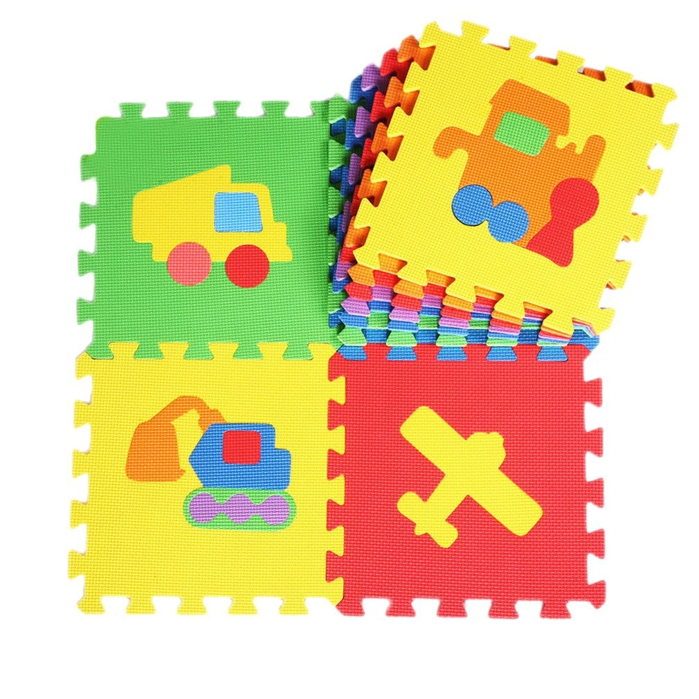 Conţine 9 piese din spumă buretata de dimensiune 30x30 cm şi 1 cm grosime si include mijloace de transport decupate, care pot fi scoase si repuse de catre cei mici.