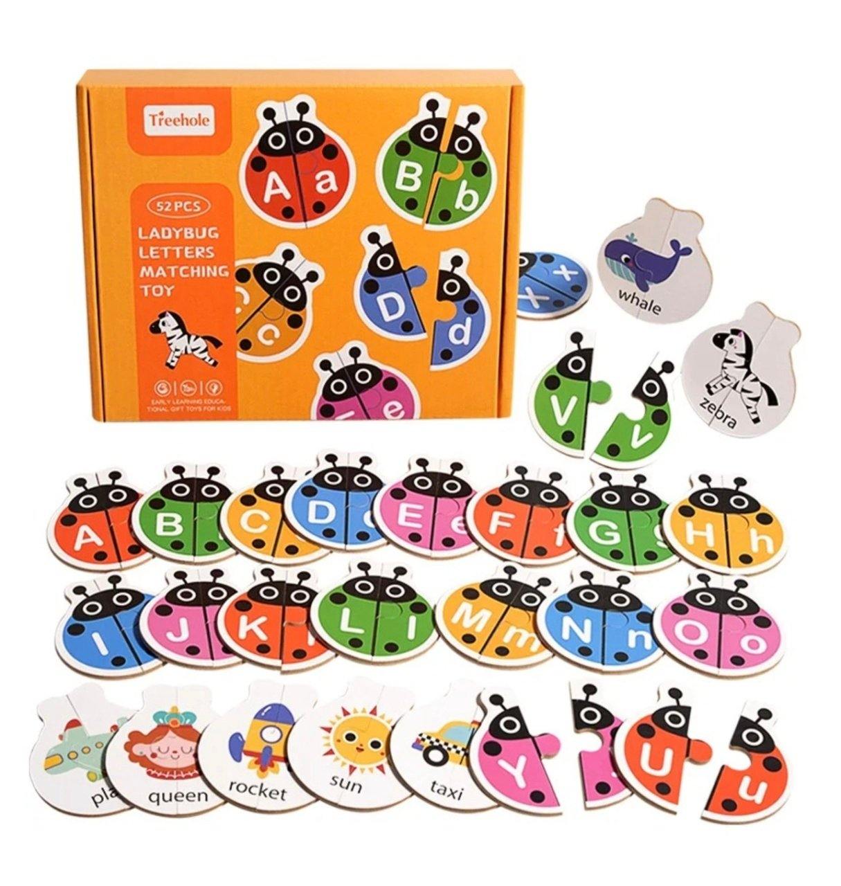 Descopera un mod interactiv si captivant de a invata alfabetul cu puzzle-ul tip gargarite! Acest joc educativ contine 52 de piese colorate, perfect pentru copiii care doresc sa asocieze literele mari cu cele mici si sa invete vocabularul intr-un mod vizual si atractiv. Fiecare piesa este o jumatate de gargarita, avand pe o parte litera mare si pe cealalta litera mica, iar pe verso se afla ilustratii simpatice ce ajuta la intelegerea relatiei dintre litera si cuvinte (ex: „R” – „rocket”).