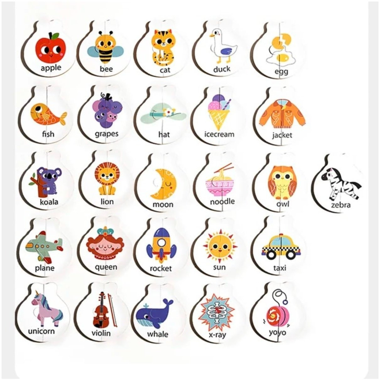 Asociere litera-cuvant: Intoarce piesele si incurajeaza copilul sa recunoasca ilustratia si cuvantul in limba engleza, exersand astfel vocabularul si memoria vizuala.
