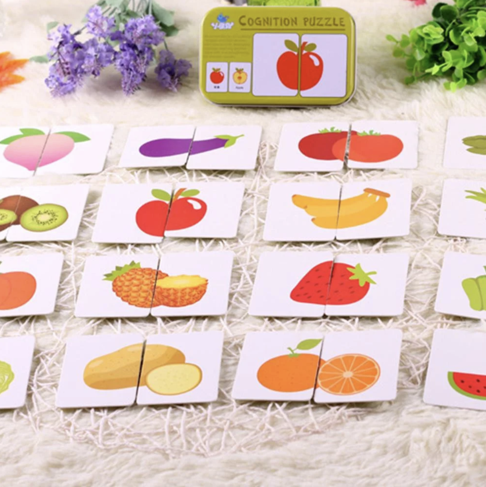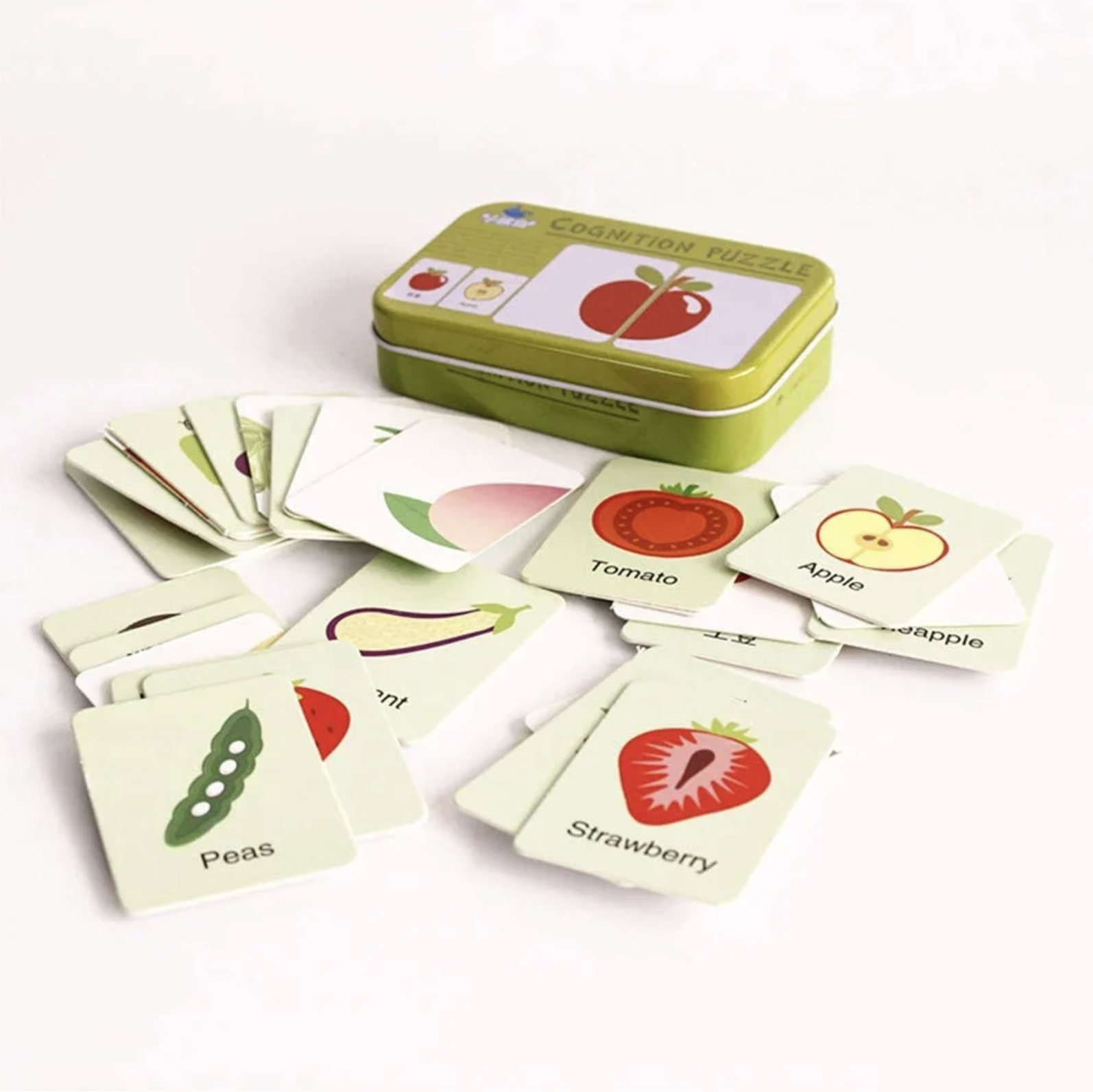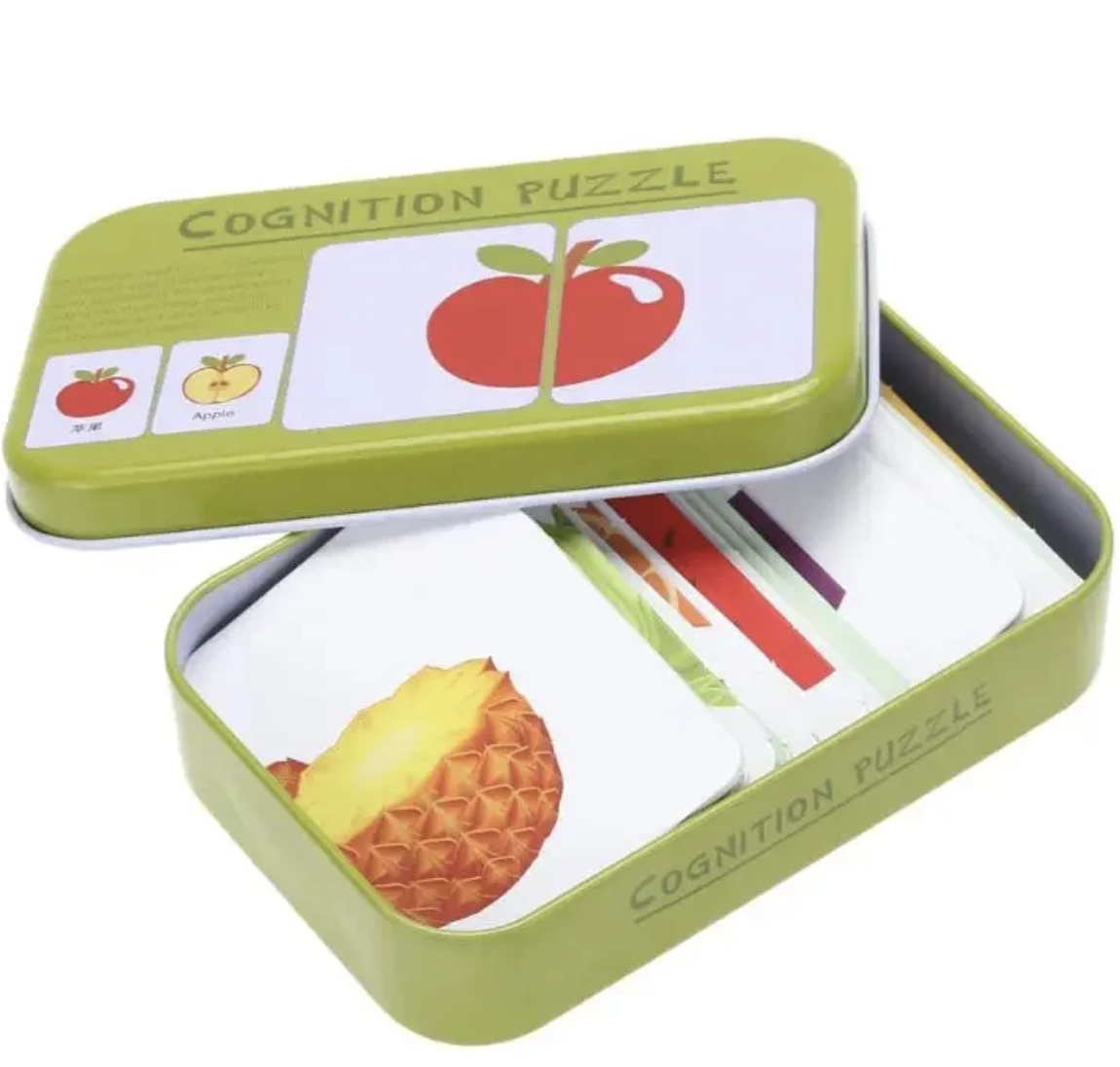 Joc cognitiv de asociere imagini Fructe, in cutie metalica verde