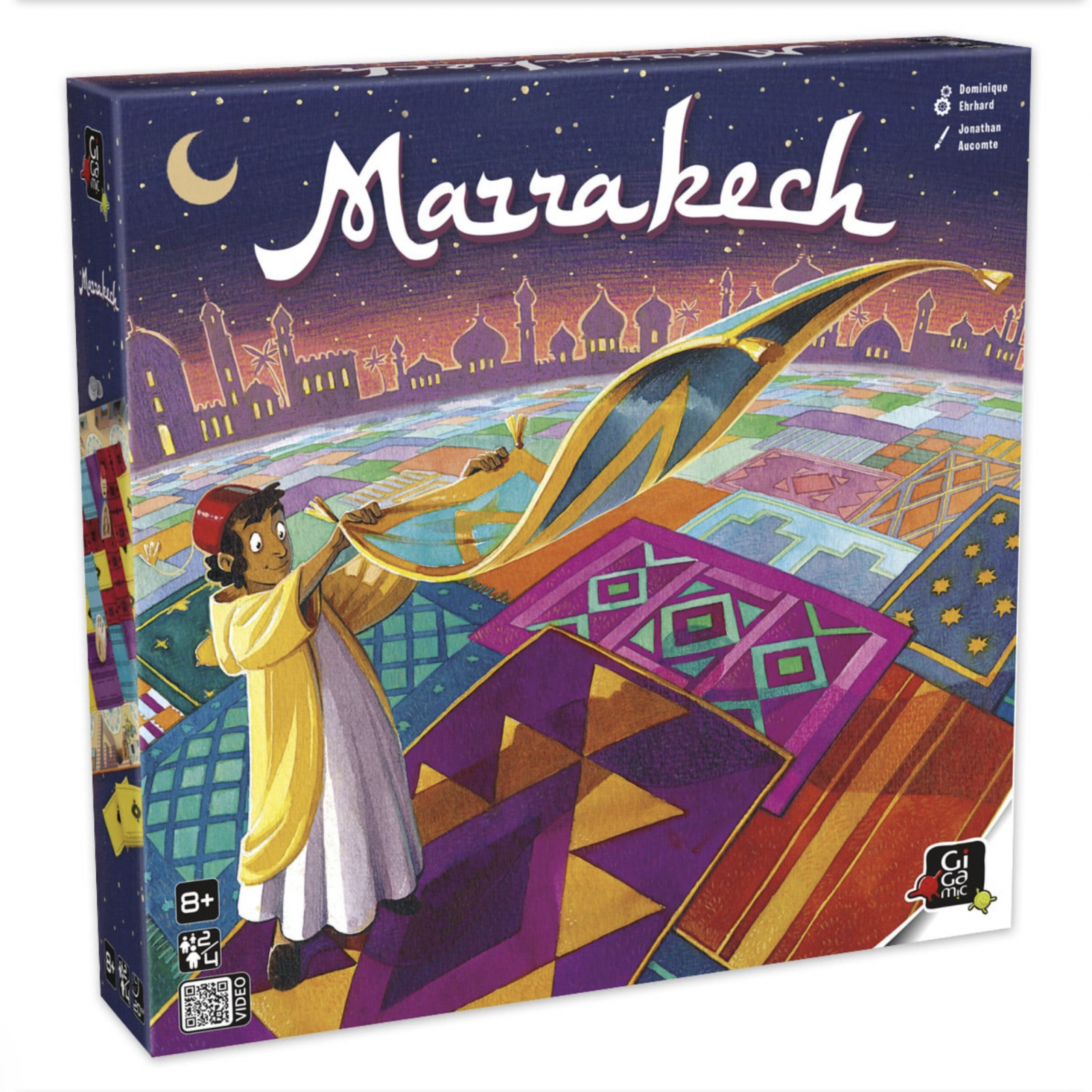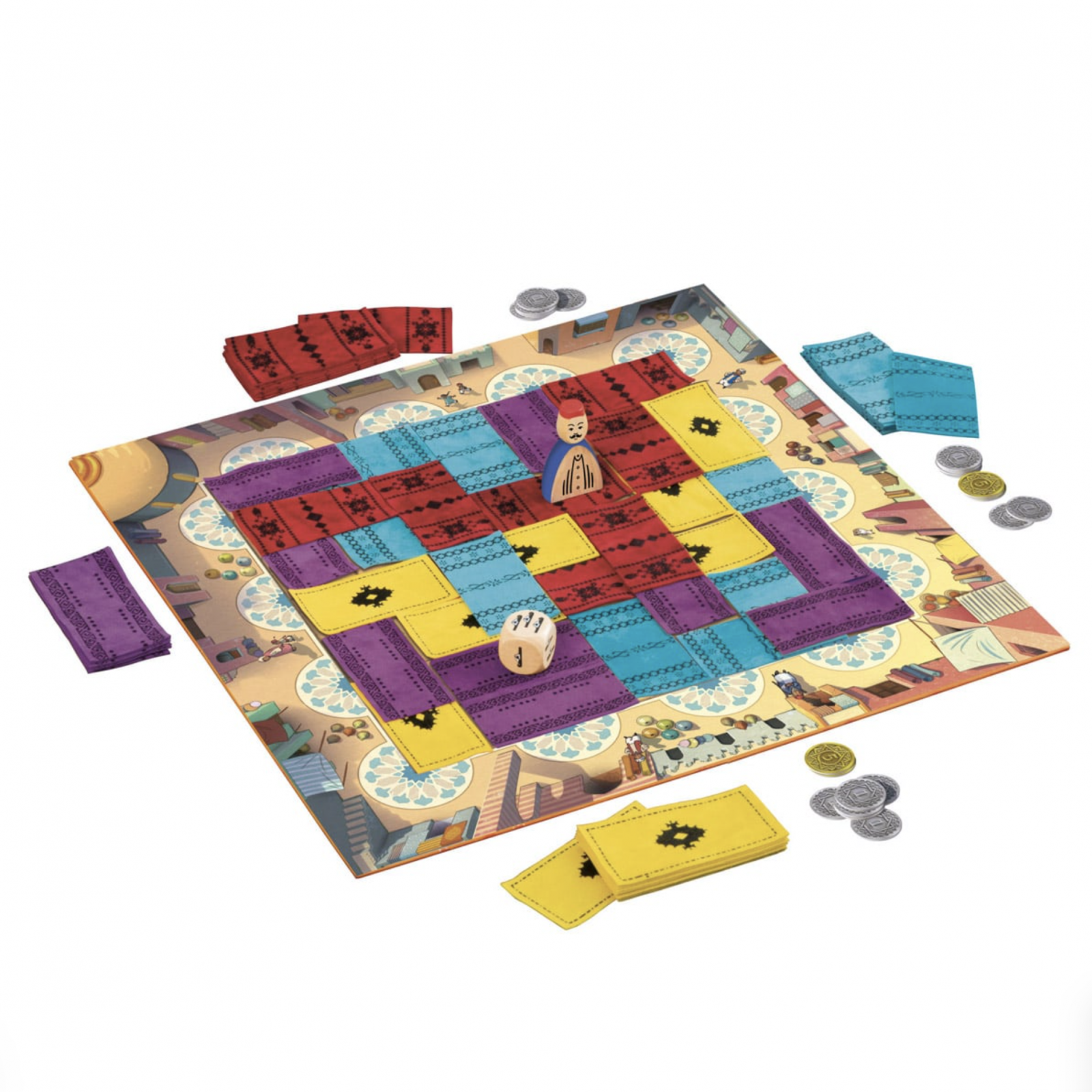 Bazarul este plin de viata! Ai grija unde iti lasi papucii – in aglomeratia pietei din Marrakesh, orice pas conteaza! Acest joc premiat de strategie si planificare transforma jucatorii in negustori iscusiti de covoare, fiecare incercand sa devina cel mai bogat si respectat comerciant din piata faimoasa a Marocului.