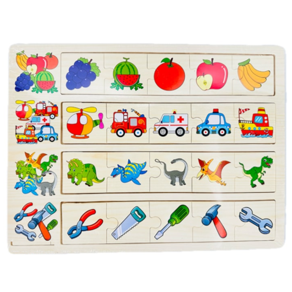 Plansa din lemn cu 4 categorii de puzzle de asociere – joc educativ pentru copii