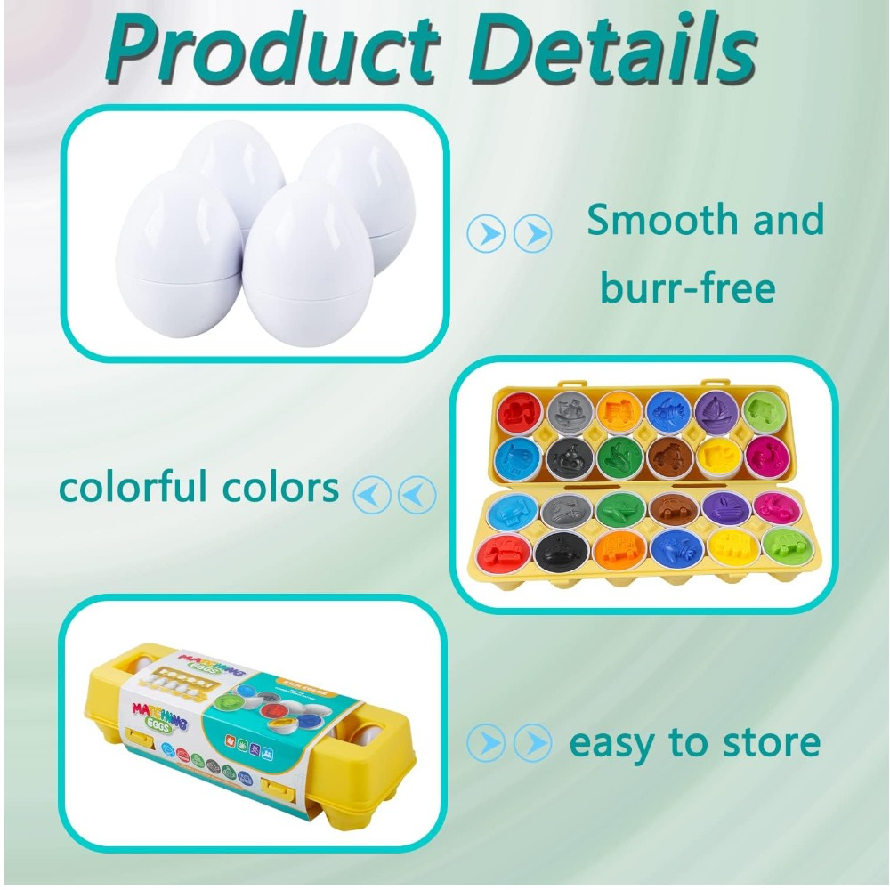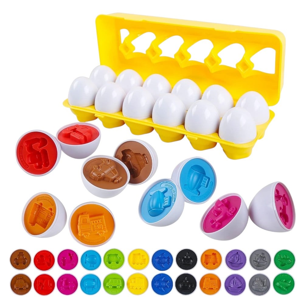 Joc de potrivire tip “oua” pentru invatare prin joaca: fiecare ou are 2 jumatati care se imbina perfect, avand in interior aceeasi culoare si aceeasi forma (masinute/vehicule) sau cifra. Copilul potriveste piesele, invata culorile, recunoaste vehiculele si exerseaza numararea 1-12.