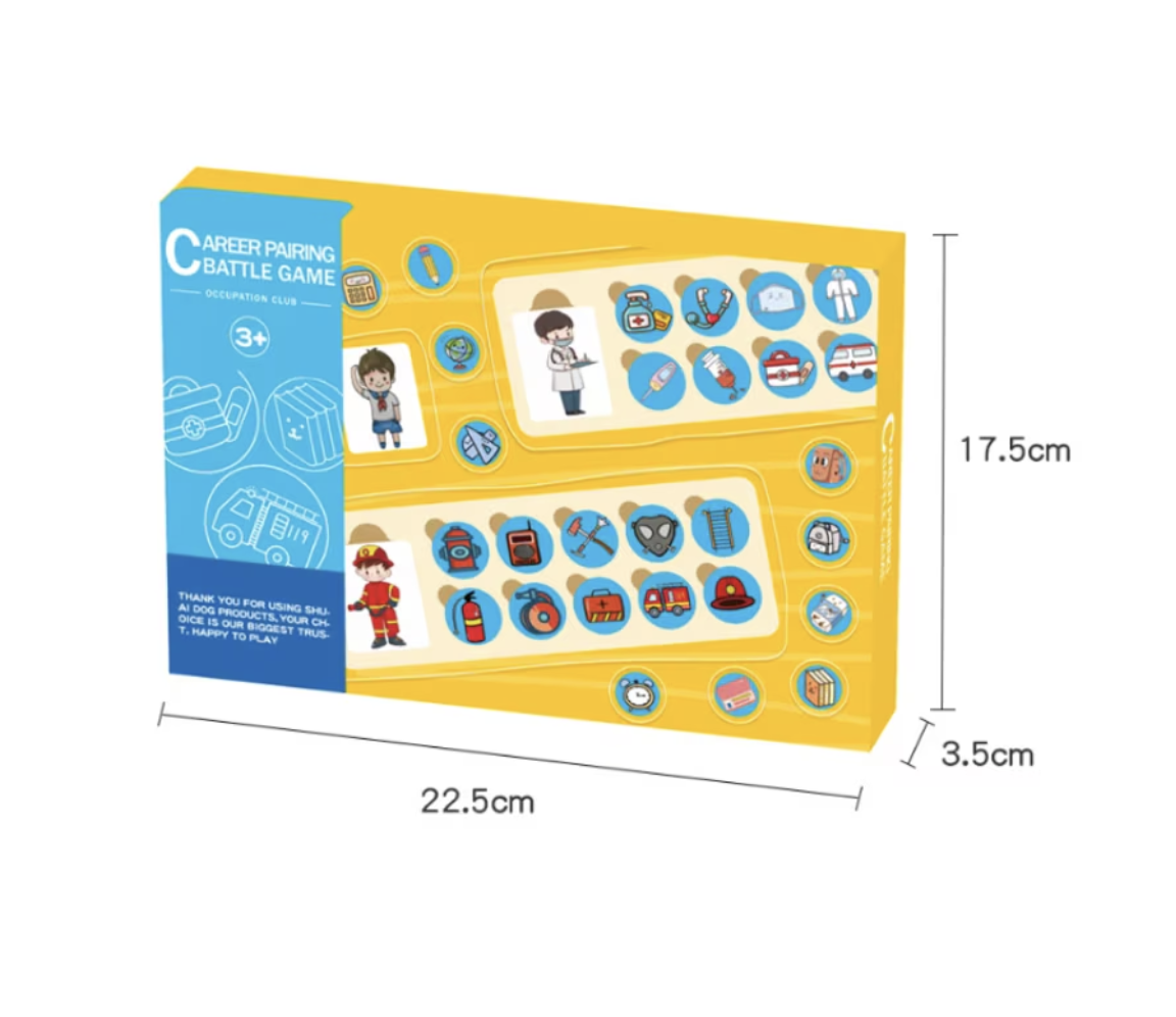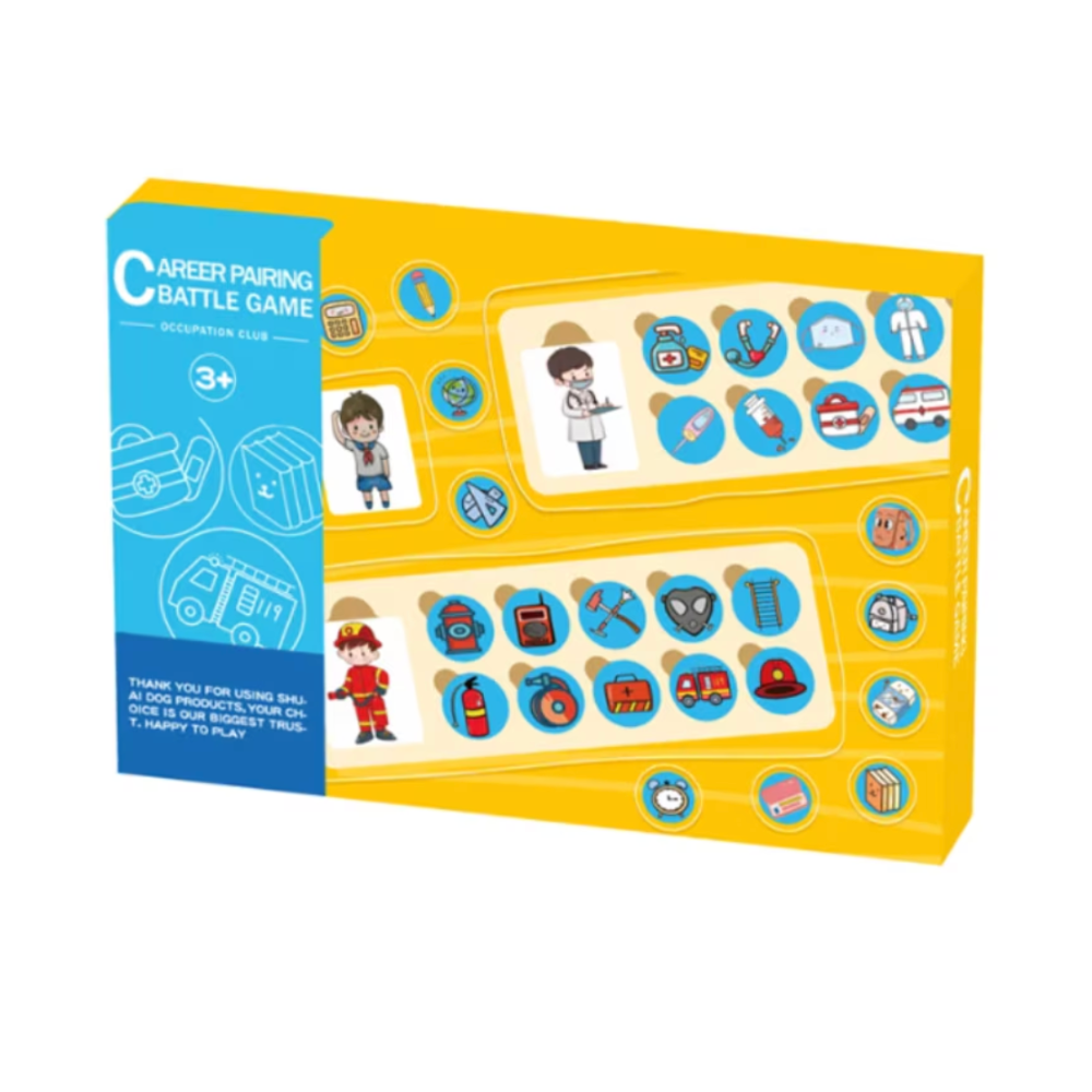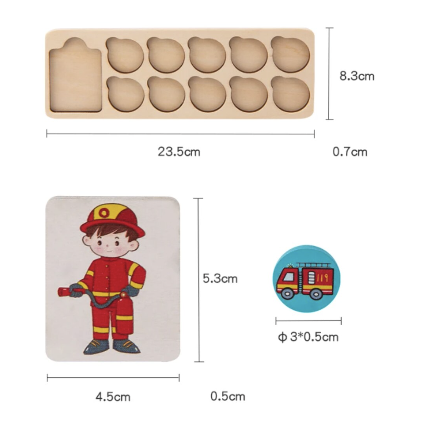 Un joc educativ interactiv, special creat pentru a-i ajuta pe cei mici sa invete despre meserii si obiectele folosite in diverse profesii. Cu ajutorul acestui puzzle din lemn, copiii vor asocia corect personajele cu obiectele care le definesc meseria, dezvoltandu-si astfel gandirea logica si vocabularul.