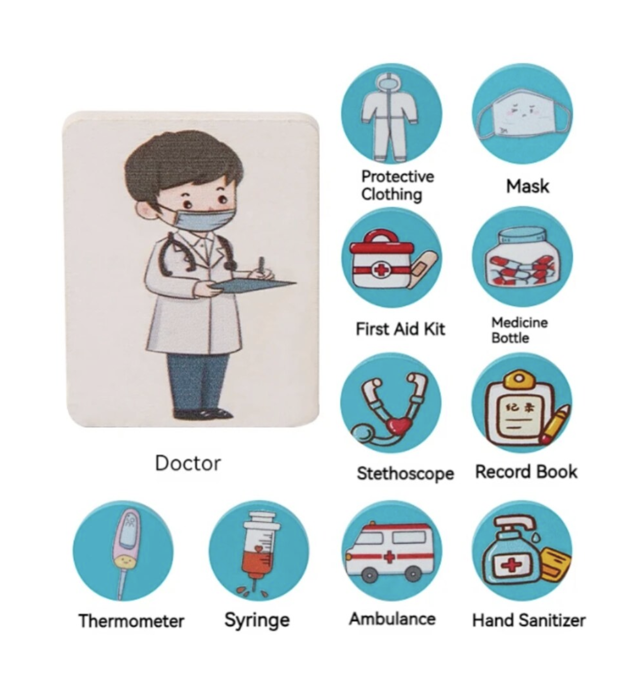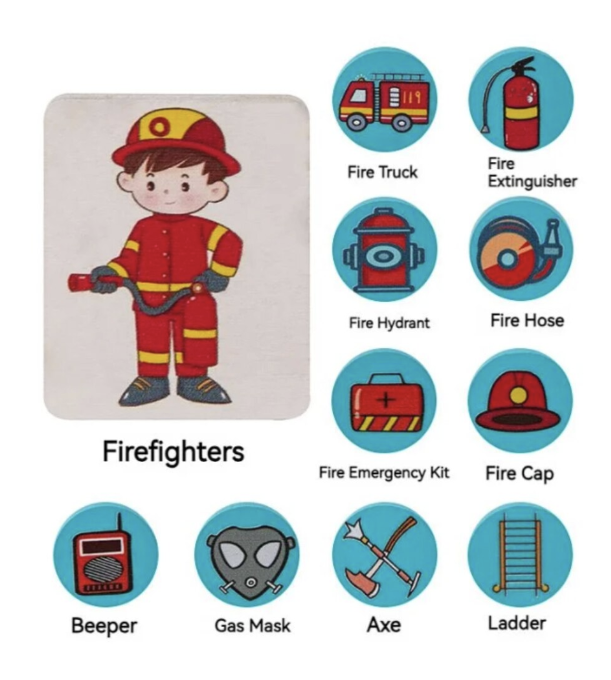 Setul contine 3 panouri cu ilustratii colorate (pompier, doctor, elev) si 30 de piese cu obiecte specifice fiecarui rol. Copilul trebuie sa aleaga piesele potrivite pentru fiecare meserie, formand astfel conexiuni vizuale si logice.