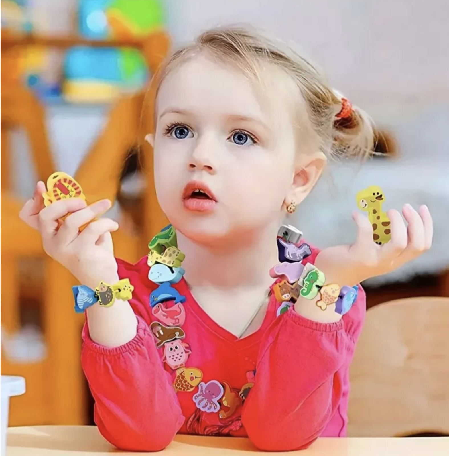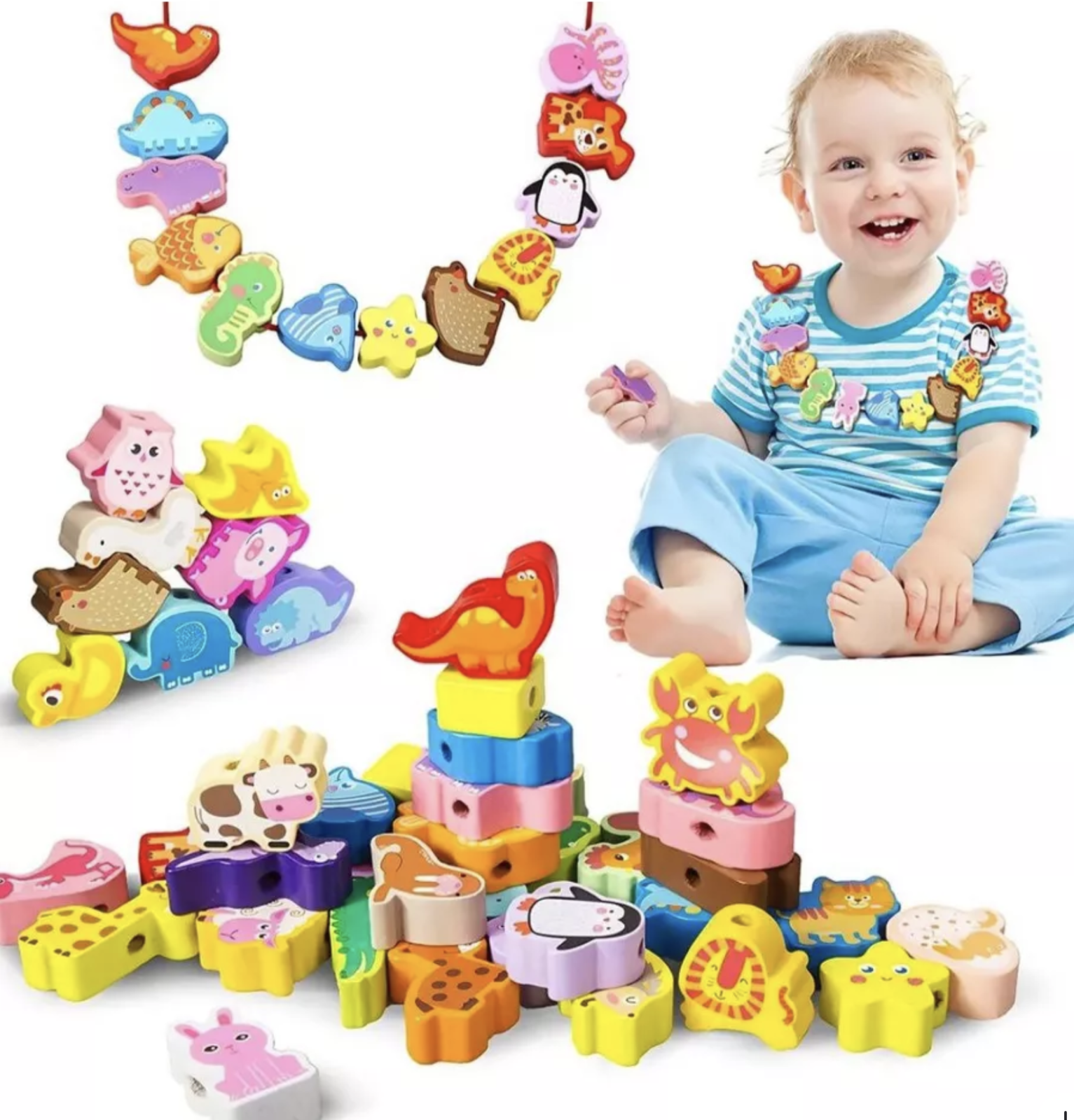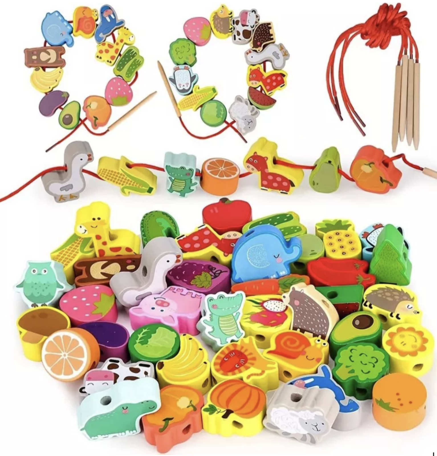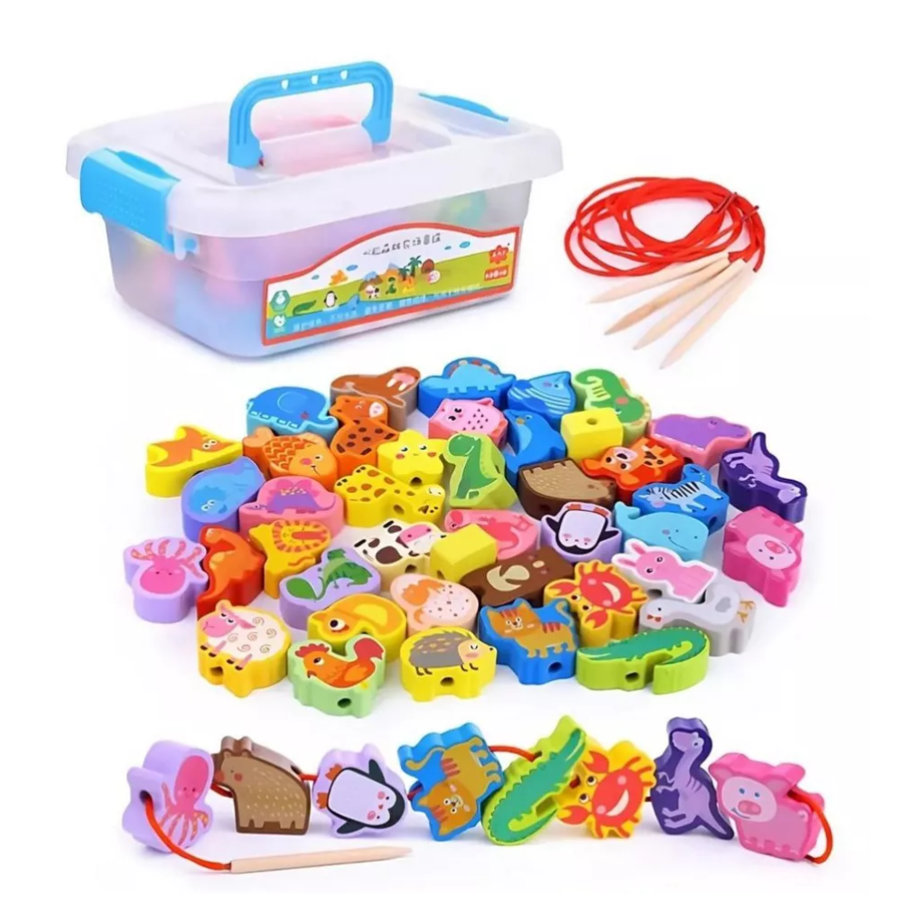 Transforma invatarea intr-o activitate distractiva si creativa cu acest joc Montessori de siretuit, ideal pentru dezvoltarea abilitatilor motorii fine si a rabdarii. Setul contine 42 de piese colorate din lemn, reprezentand diferite animale, si 2 snururi rezistente cu capete din lemn in forma de ac pentru o manevrare usoara.
