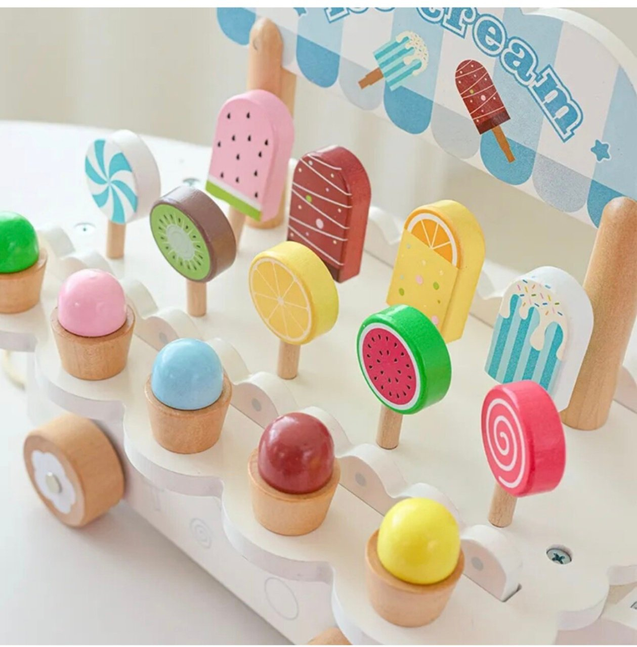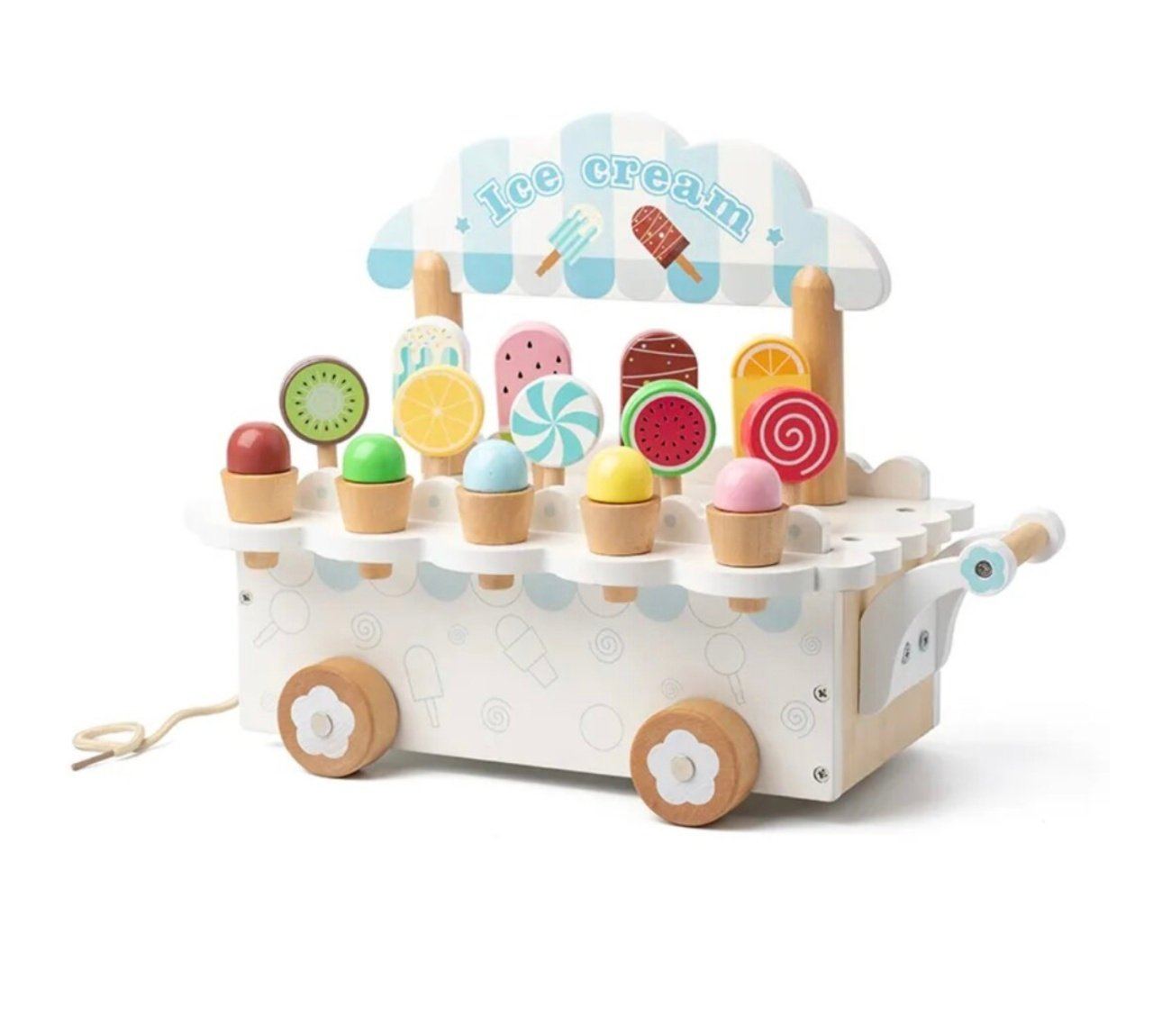 Caruciorul cu Gelaterie din Lemn este jucăria ideală pentru micii iubitori de jocuri de rol, oferindu-le oportunitatea de a învăța prin joacă și interacțiune socială. Realizat din lemn de înaltă calitate, acest carucior cu înghețată este robust și durabil, având un design simplu și frumos, cu culori vesele de roz și alb. Acesta îi ajută pe copii să-și dezvolte abilități esențiale, cum ar fi coordonarea mână-ochi, gândirea logică și abilitățile sociale.