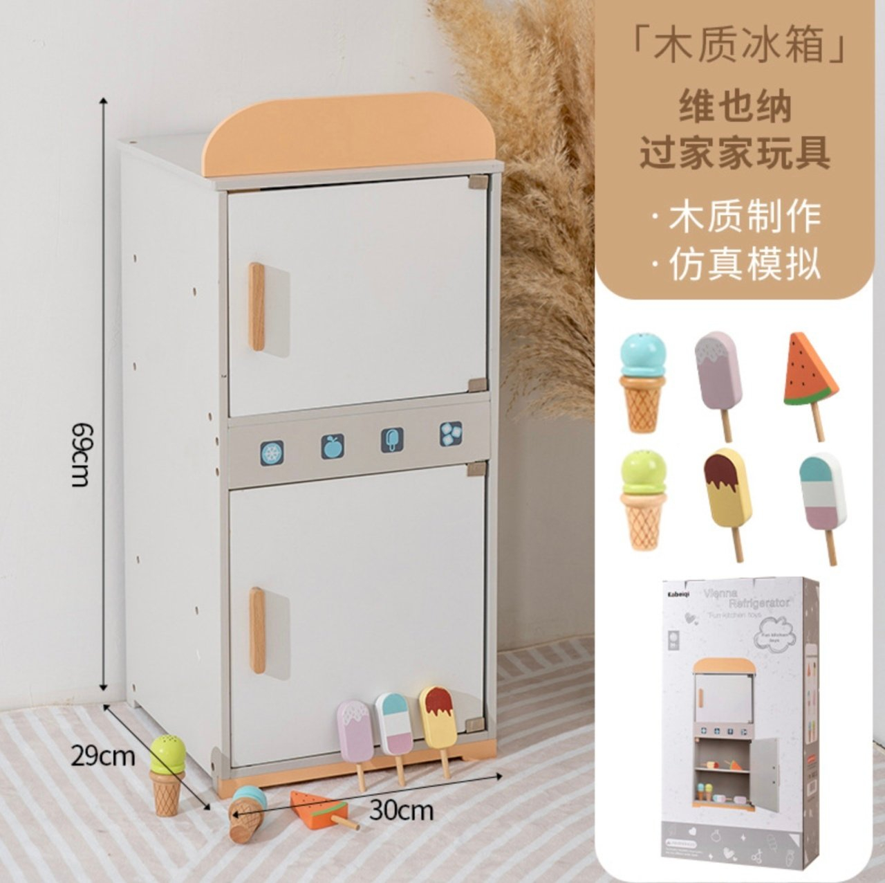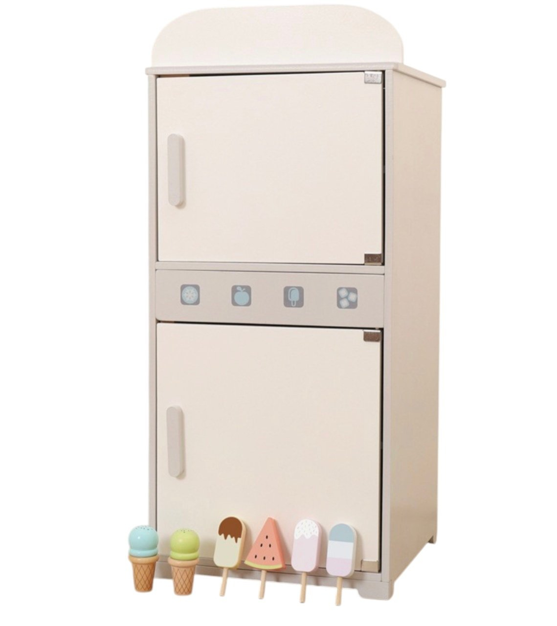Un frigider de jucarie din lemn care aduce jocurile de rol la un alt nivel! Acest frigider pentru copii este perfect pentru micii bucătari care își doresc să simuleze gătitul și depozitarea alimentelor într-un mod creativ și educativ. Cu 6 accesorii incluse, acest frigider este ideal pentru jocuri de tipul "magazinul de inghetata" sau "gospodăria de acasă", stimulând imaginația și dezvoltarea socială.