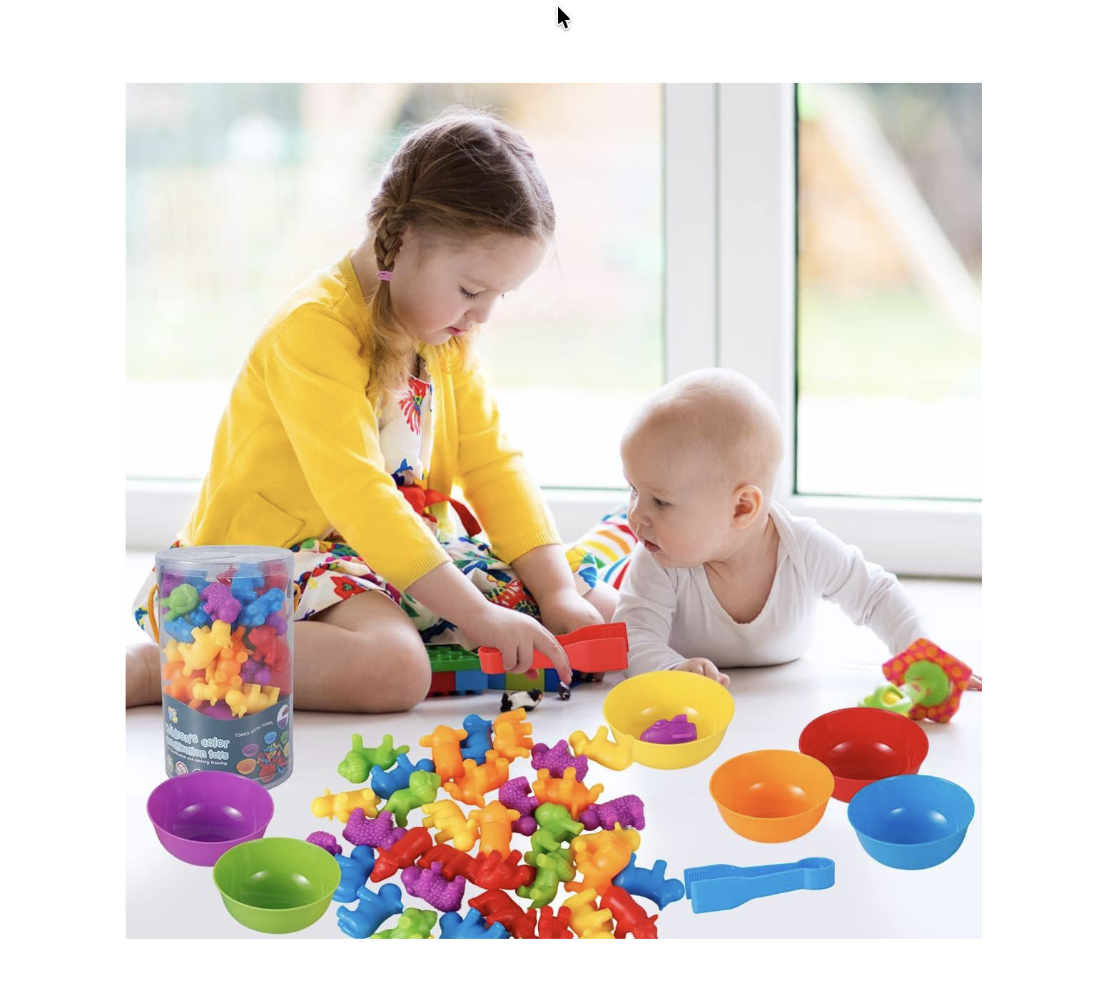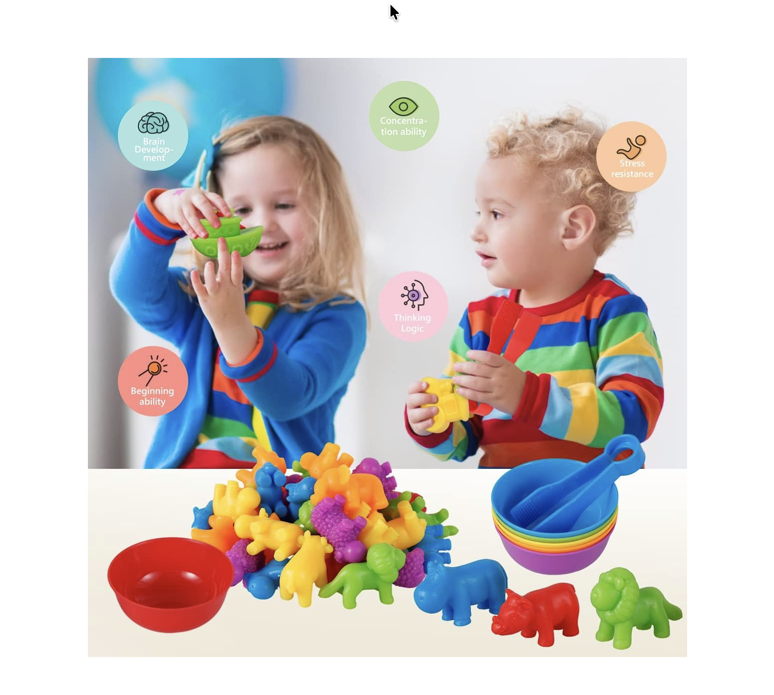 Copiii se pot juca astfel: varsa jucariile, simti textura, invata culorile, sorteaza dupa culori.