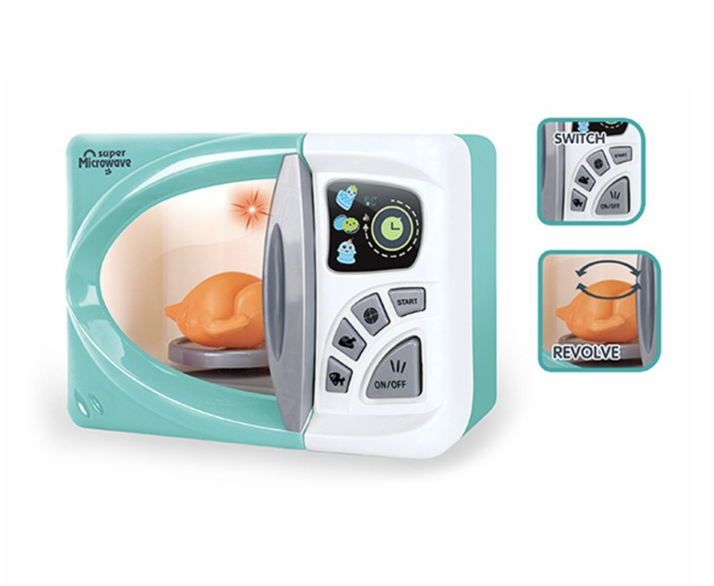 Aceasta jucarie dispune de efecte sonore si luminoase, iar farfuria cu puiul de jucarie din interiorul cuptorului se roteste dand astfel un aspect mai realist. Are buton de start/stop si se poate seta timpul in secunde, cat sa functioneze dupa care se opreste si produce un sunt ca la un cuptor real.