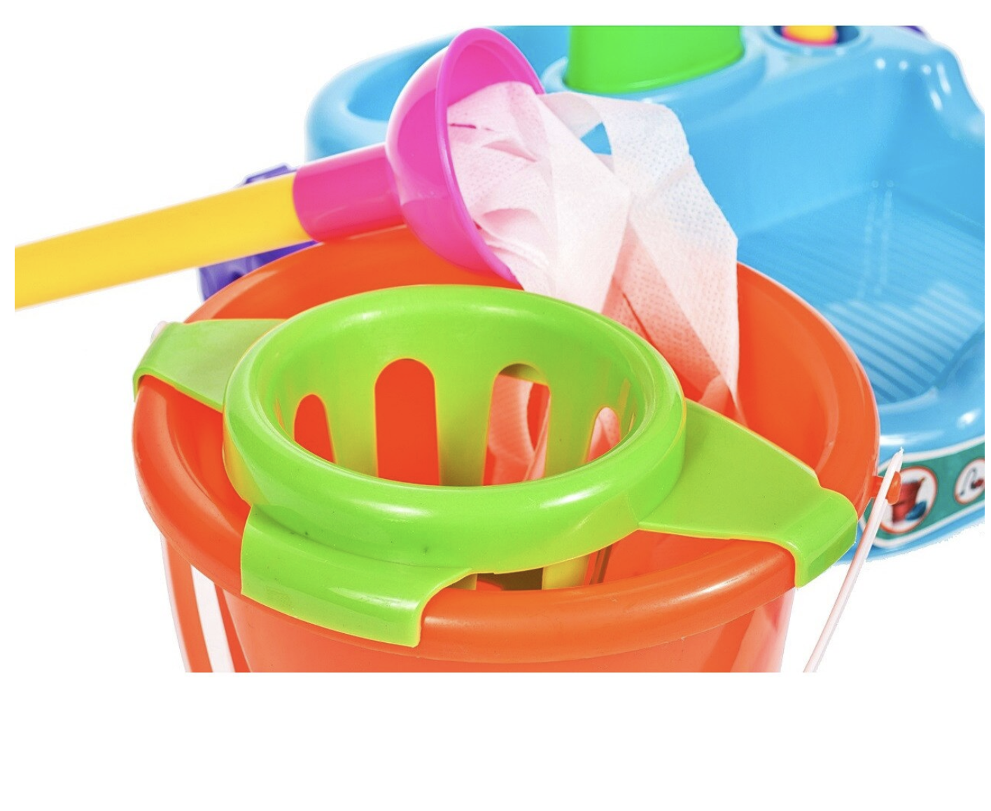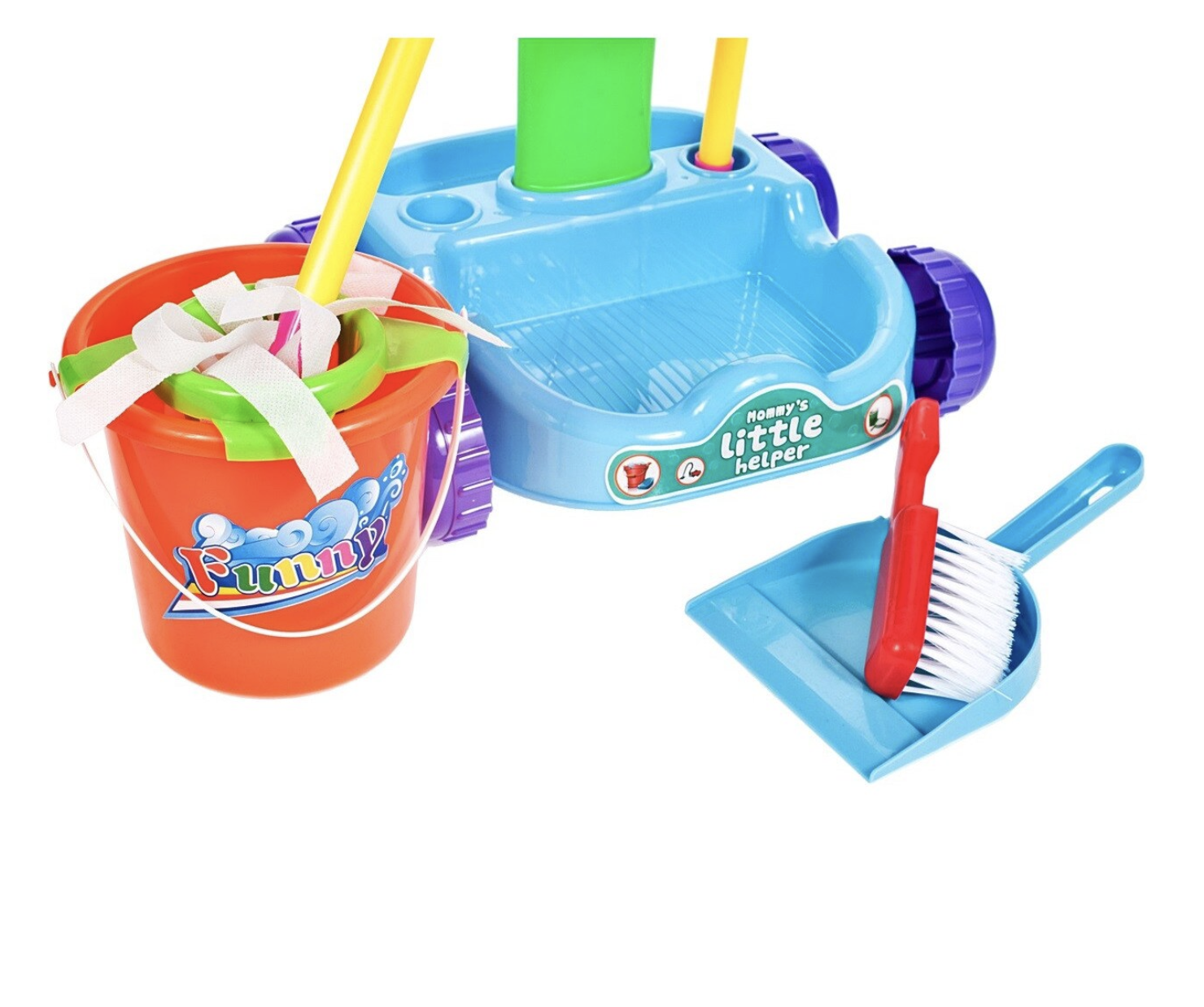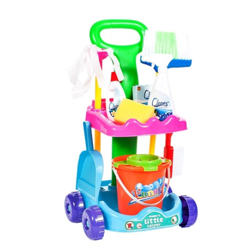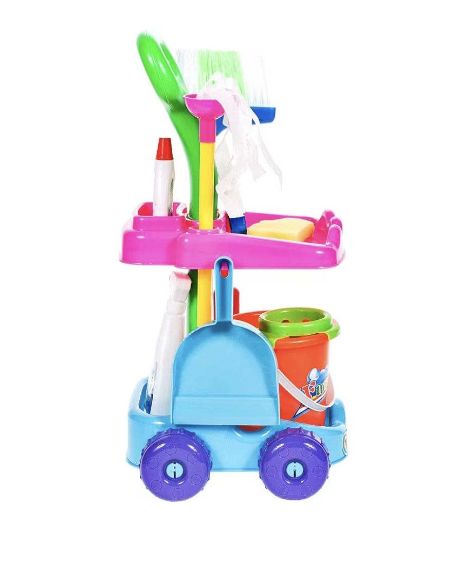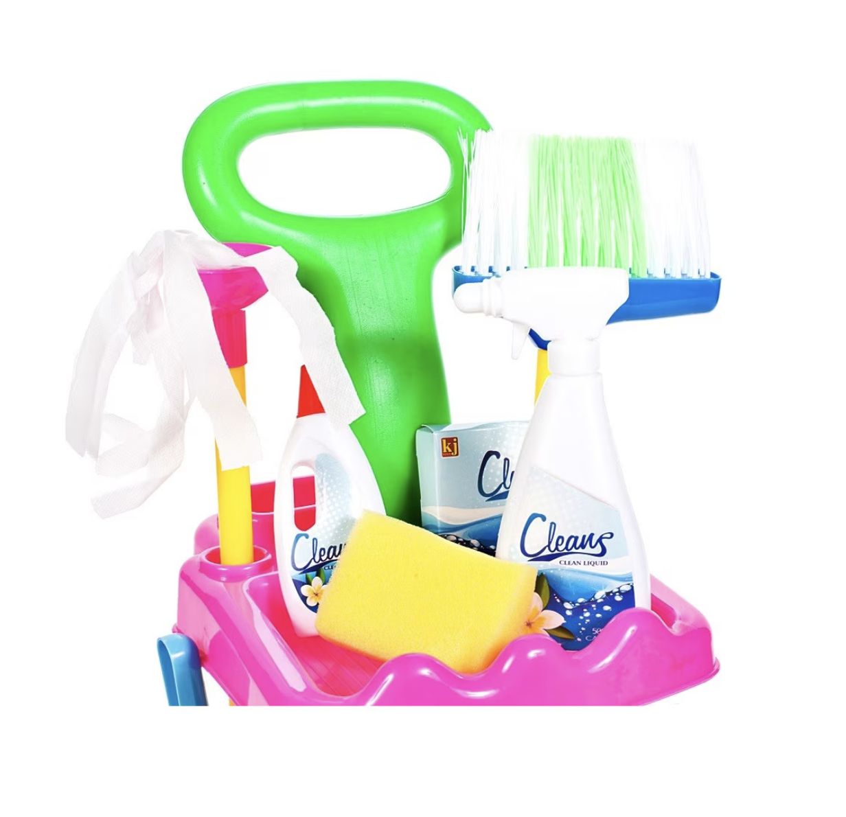 • Carucior cu Roti: Caruciorul este usor de impins si ideal pentru transportul tuturor accesoriilor de curatenie. Are roti rezistente, iar copiii pot sa-l traga dupa ei in timp ce se joaca.