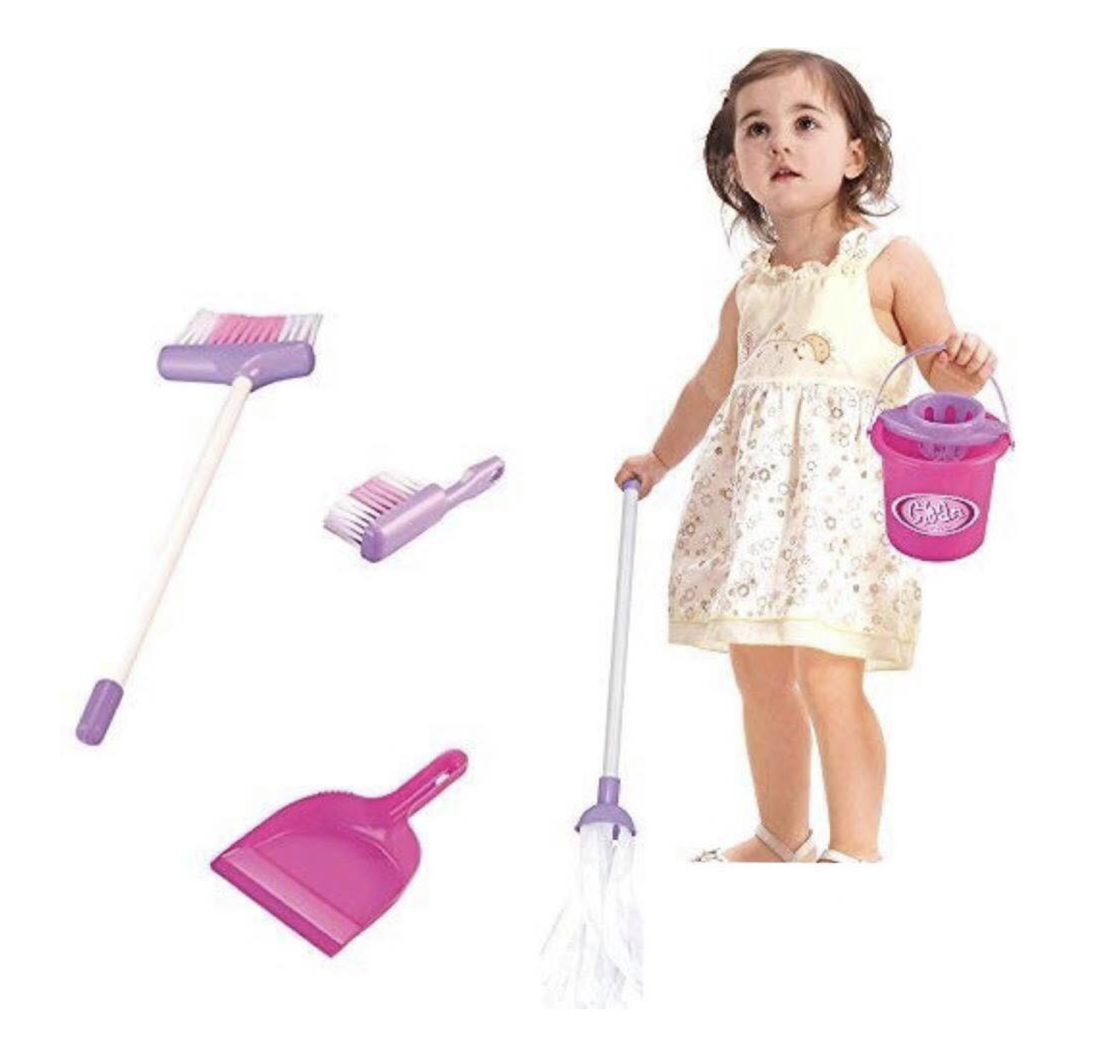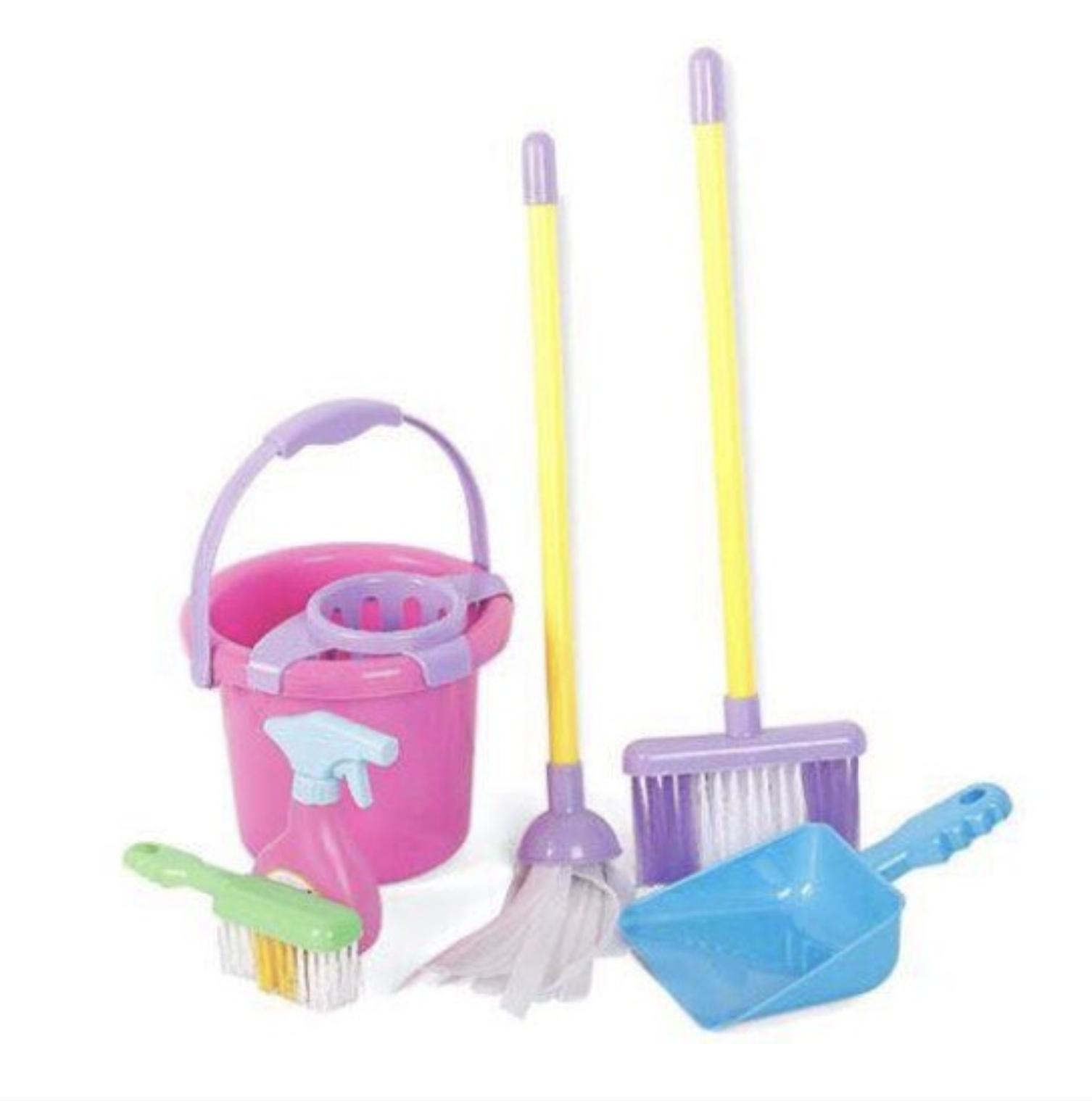 Accesorii Complete de Curatenie: Setul include mop, galeata cu storcator, lavete, matura, faras si multe altele, toate pentru a imita activitatile de curatenie ale adultilor.