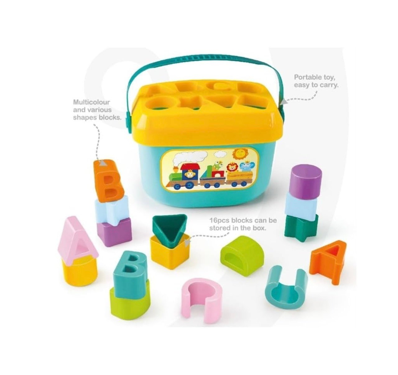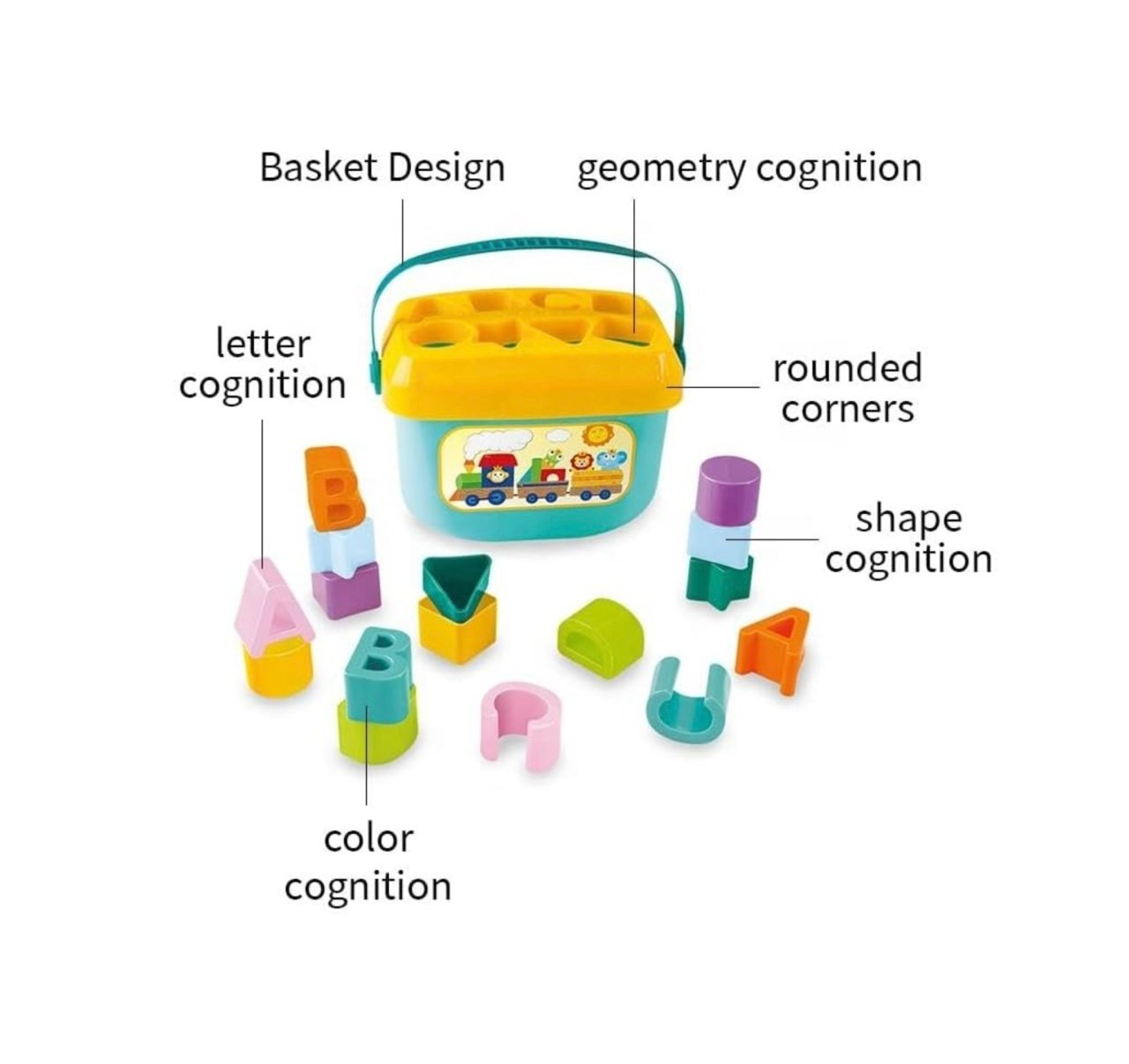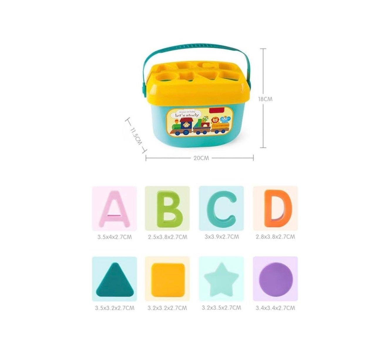 Set complet de 18 piese: Include o găletușă de depozitare și 16 cuburi colorate de sortat, în forme și culori diferite.