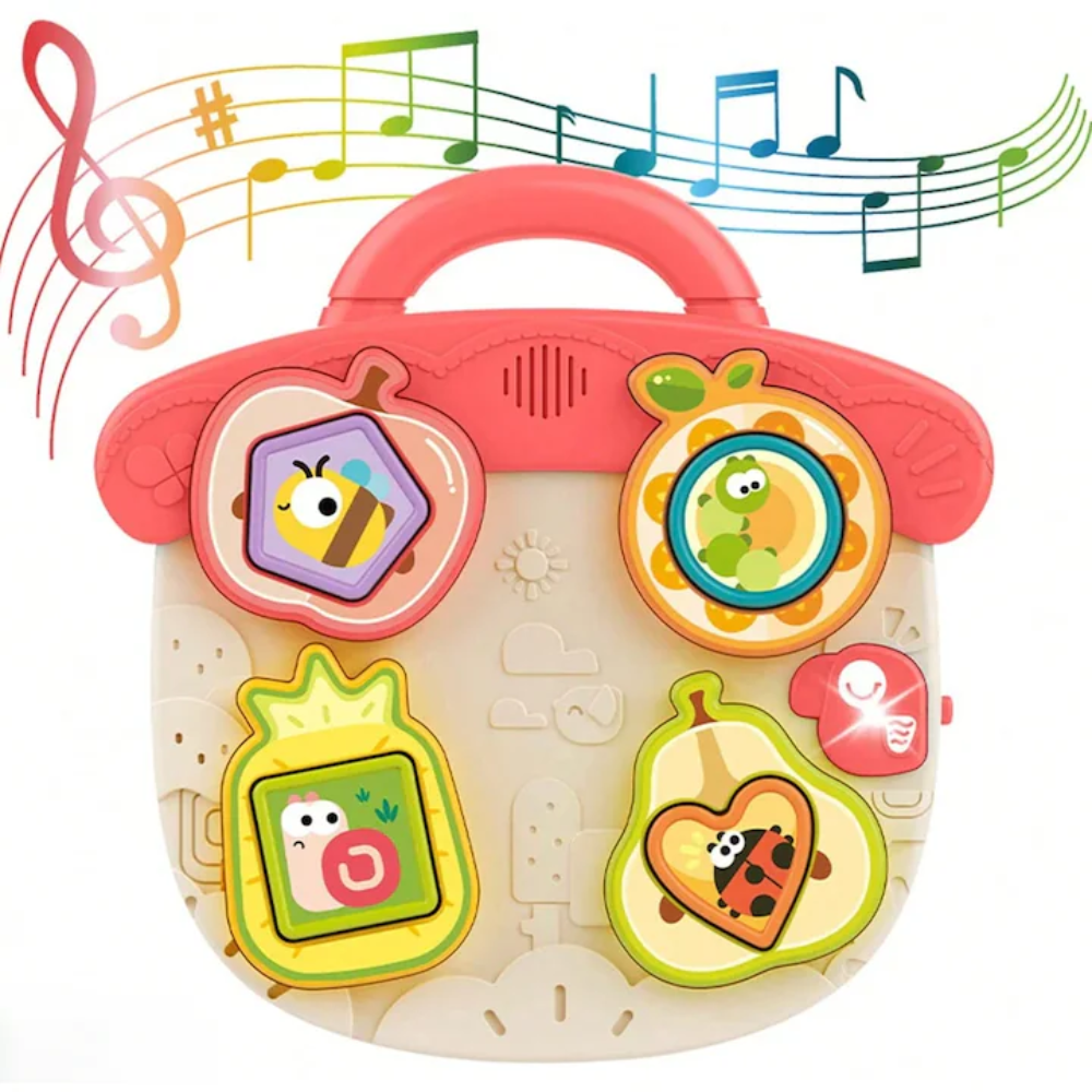 Panou Interactiv Baby BusyBoard – Centru Educativ cu Sunete si Lumini, Forme, Culori, Animale si Fructe – Roz, 18 luni+