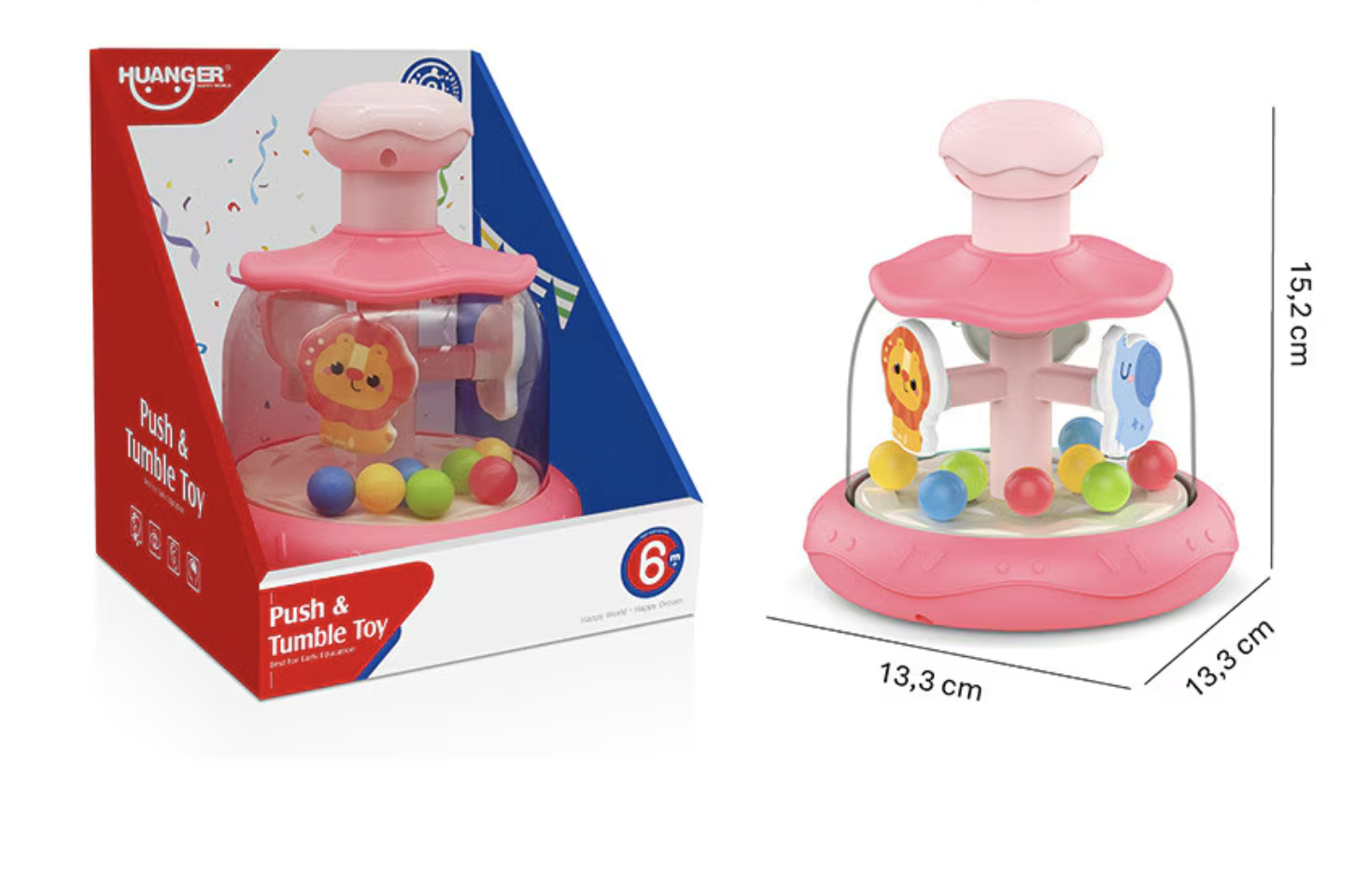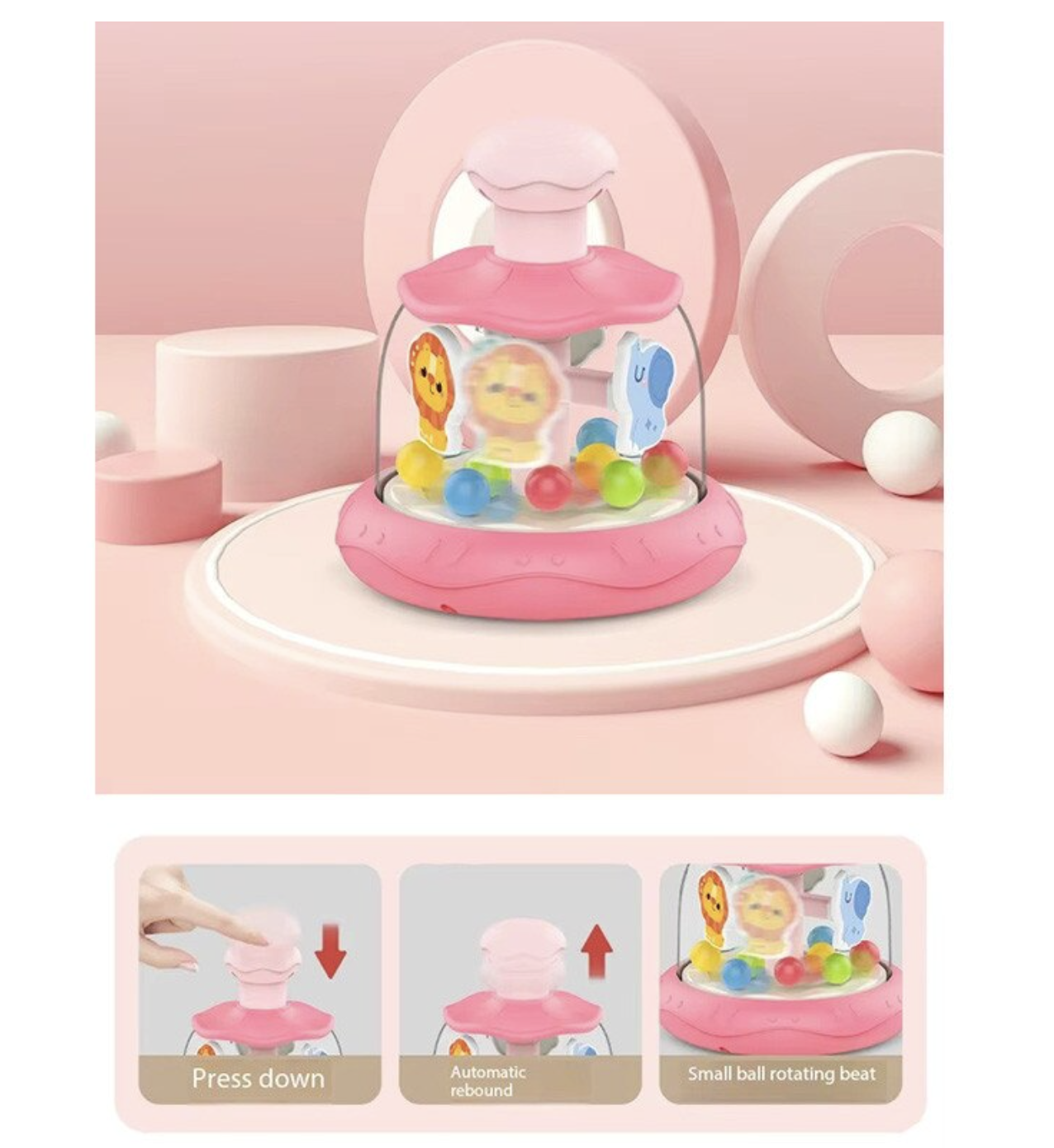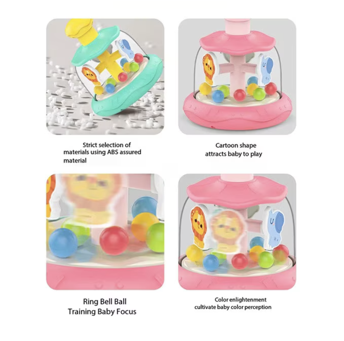Animale si bile in miscare – Cand bebelusul apasa butonul din partea superioara, animalele si bilele incep sa se roteasca, creand o miscare dinamica si fascinanta.