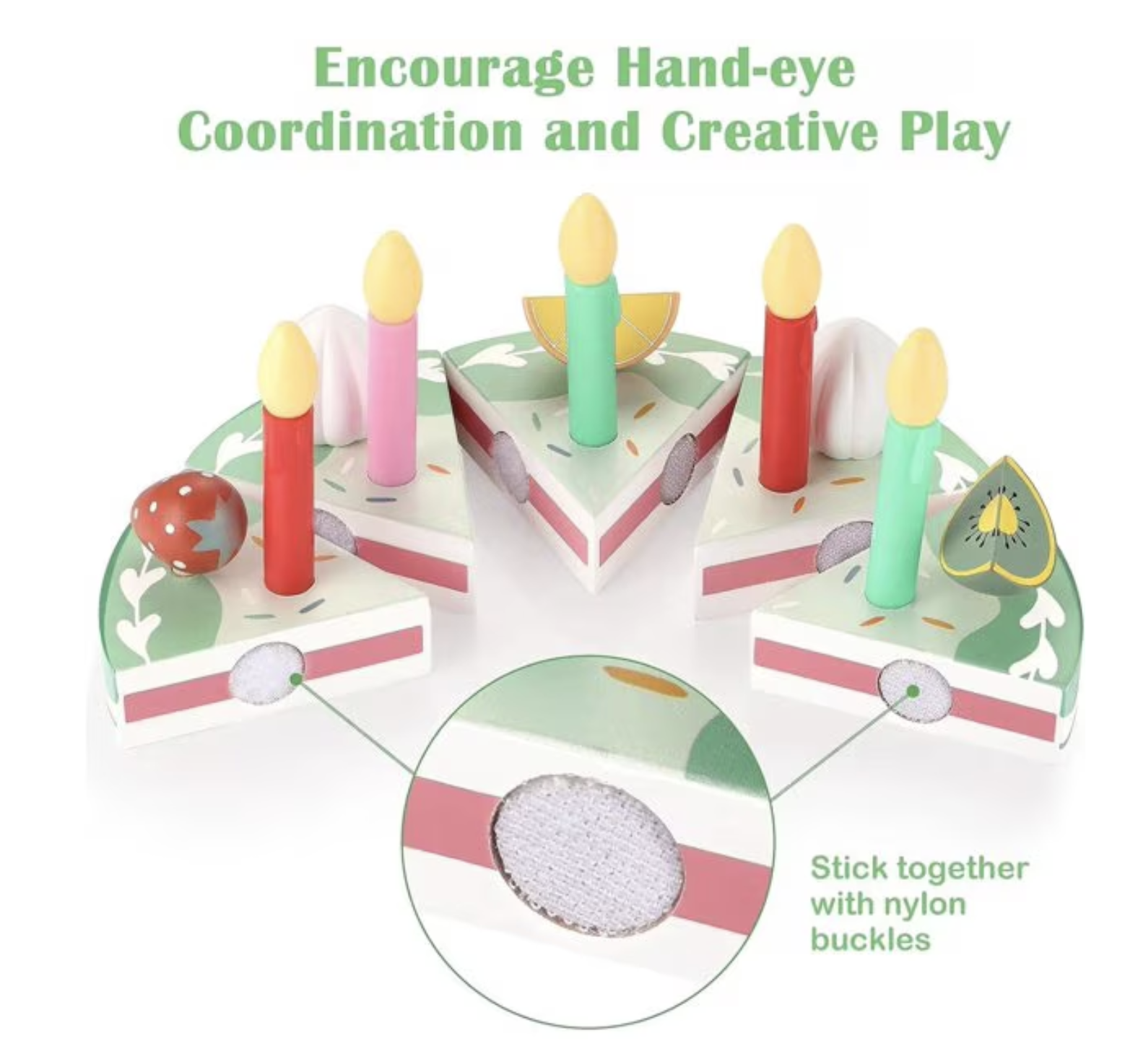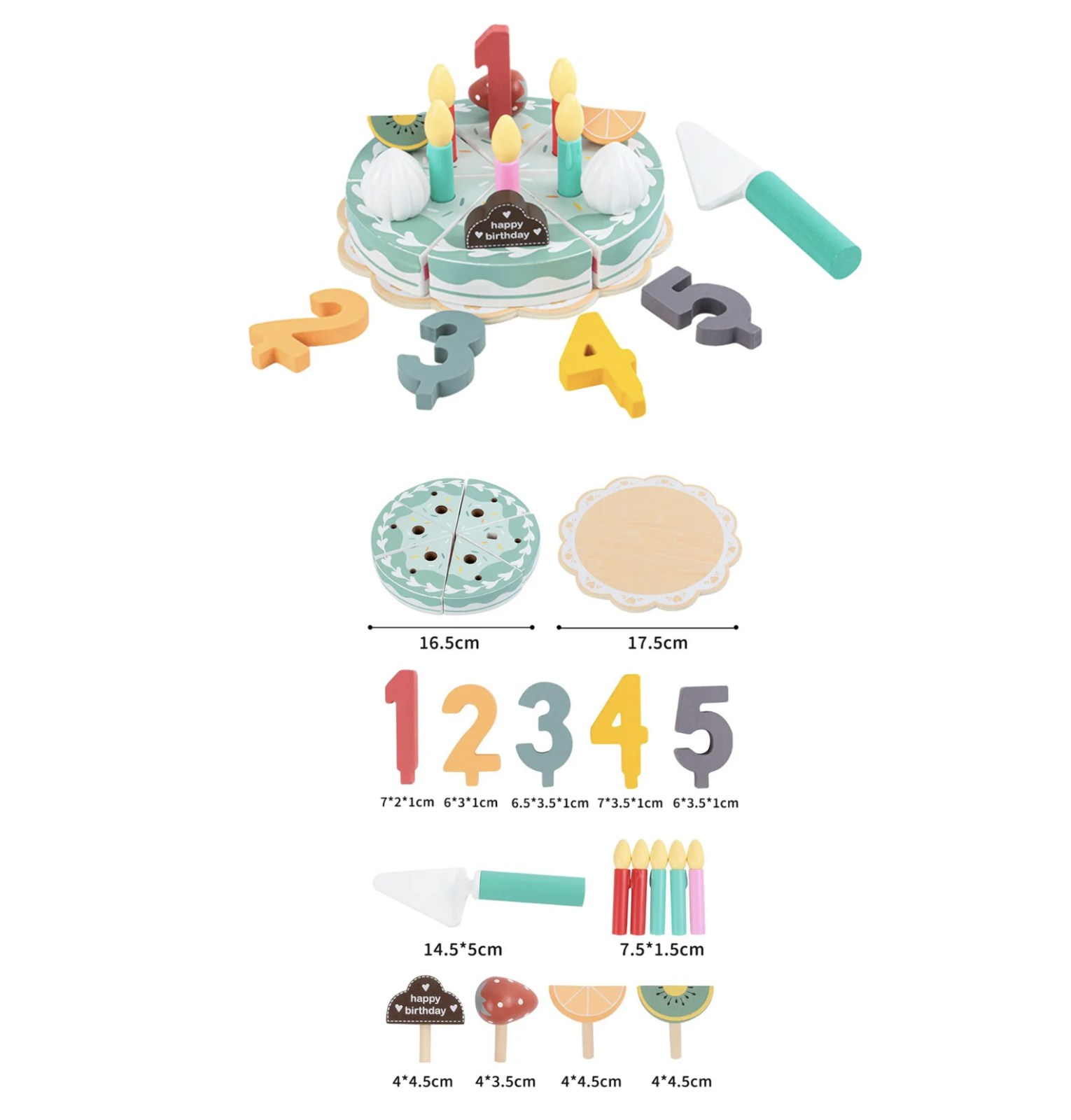 Setul include o varietate de accesorii, toate realizate din lemn de inalta calitate, care ii permit copilului sa creeze un tort aniversar complet cu decoratiuni, lumanari si cifre. Jucaria incurajeaza joaca de rol, socializarea si impartasirea cu alti copii sau membri ai familiei.