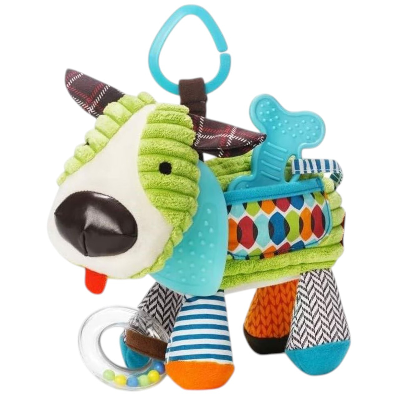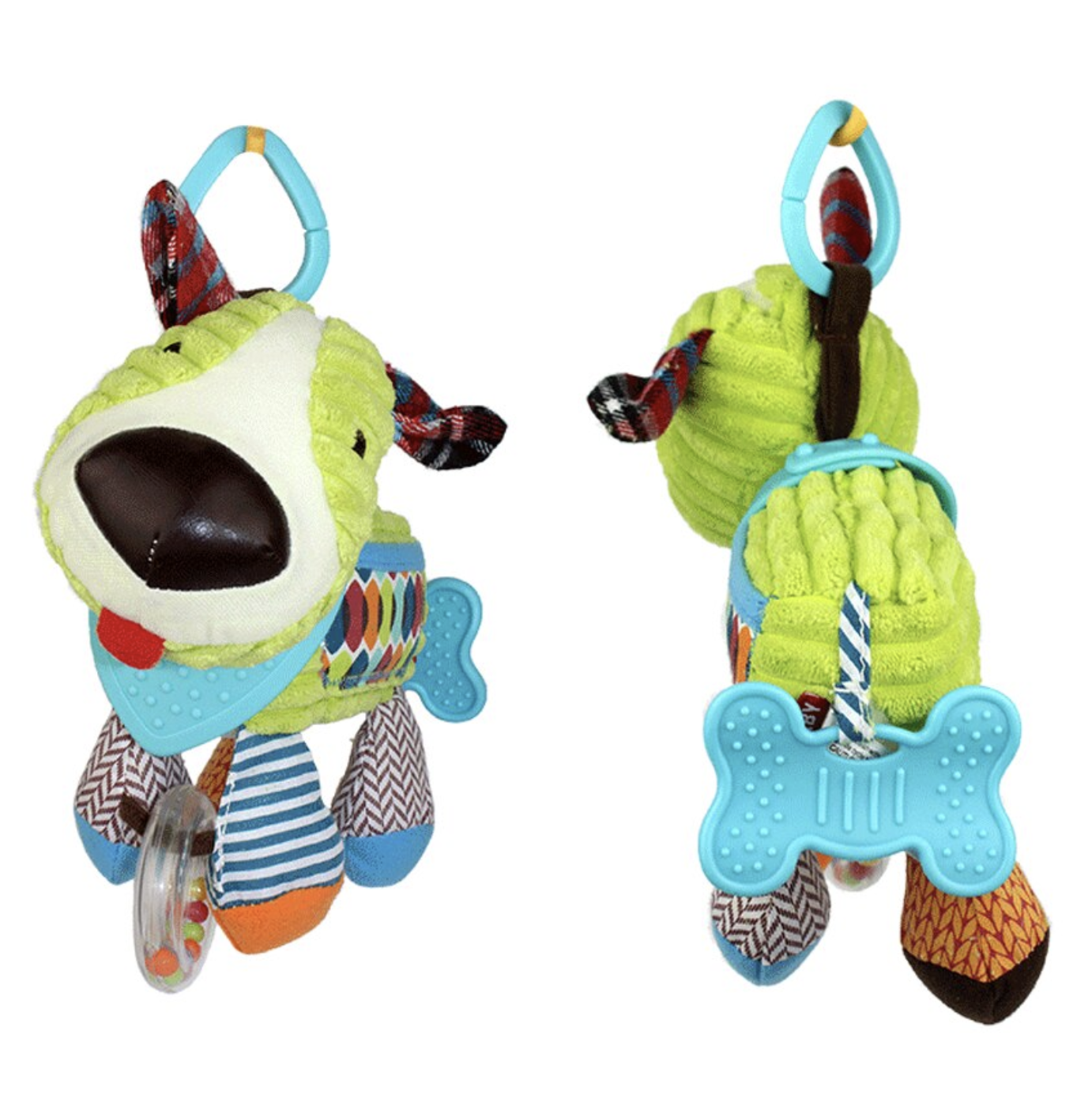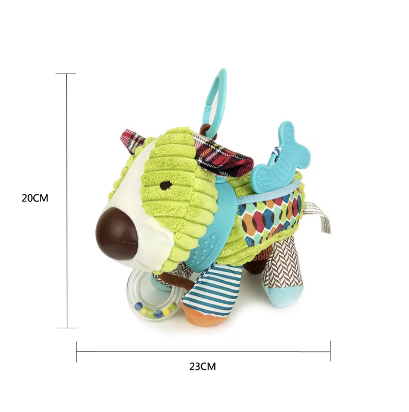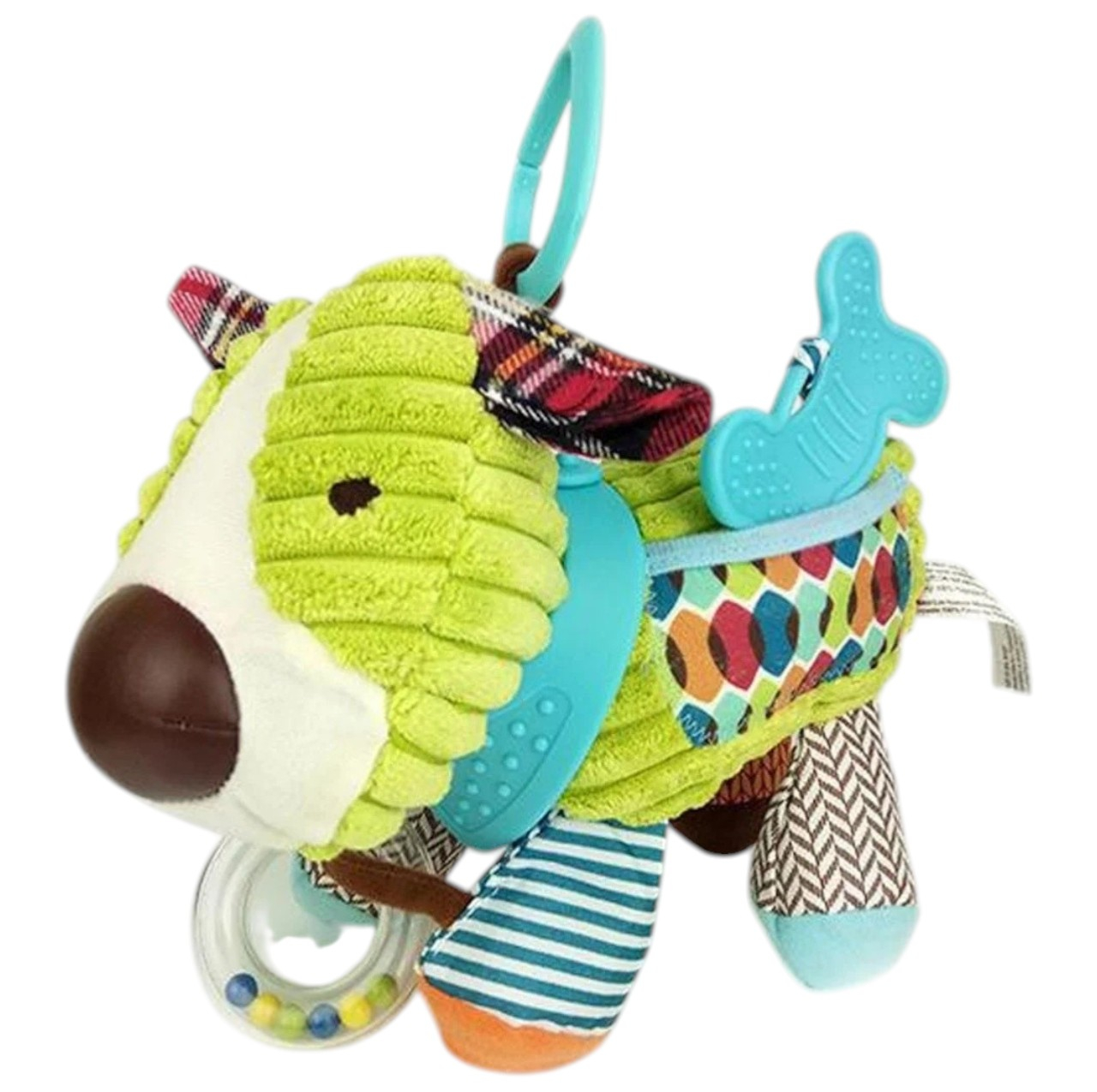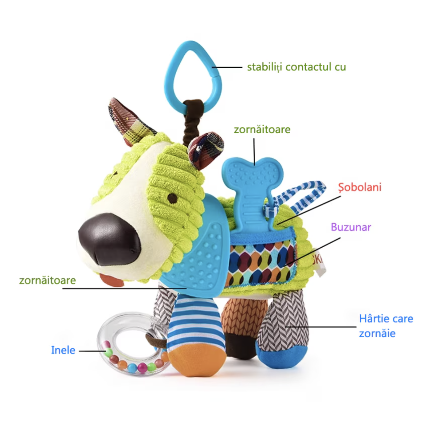 Jucaria senzoriala Catel este conceputa pentru stimularea timpurie a bebelusilor, combinand elemente zornaitoare, texturi moi si functii utile in perioada dentitiei. Realizata din plus catifelat, jucaria este placuta la atingere si usor de apucat de mainile mici. Sunetele zornaitoare, culorile vii si formele prietenoase contribuie la dezvoltarea senzoriala si la mentinerea atentiei copilului, iar partile destinate dentitiei pot ajuta la calmarea disconfortului gingival.