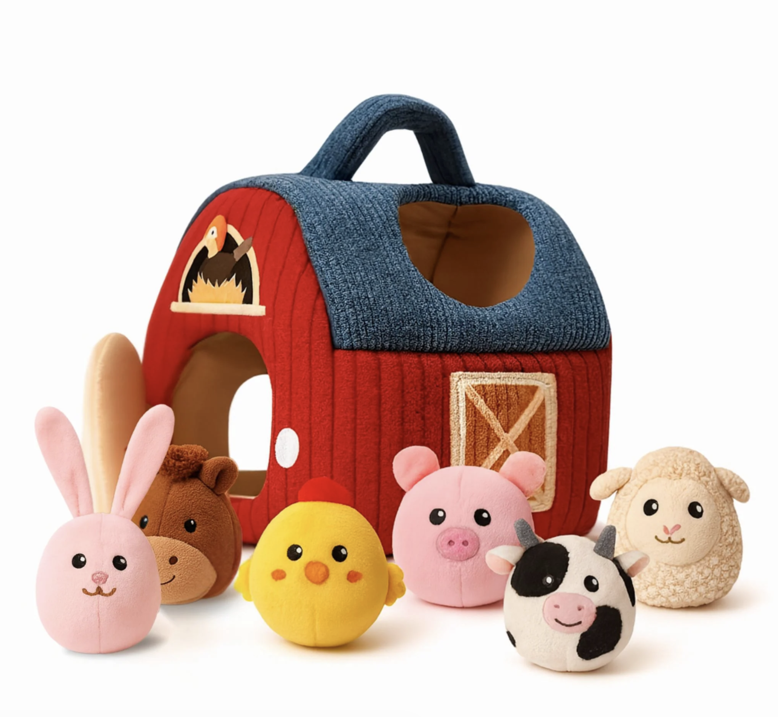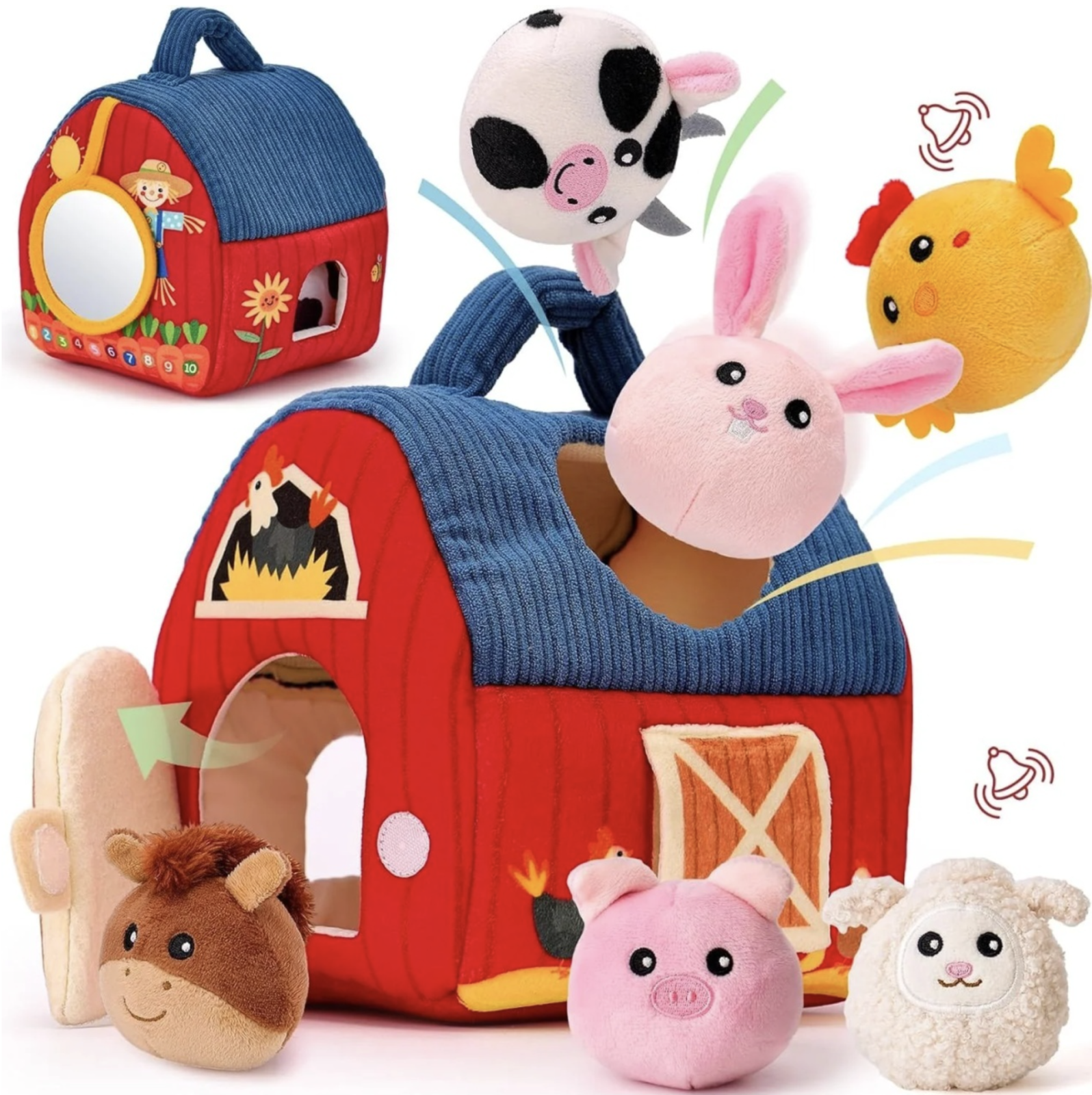 Jucarie senzoriala textila Ferma cu hambar si 6 animalute pentru bebelusi 6 luni+