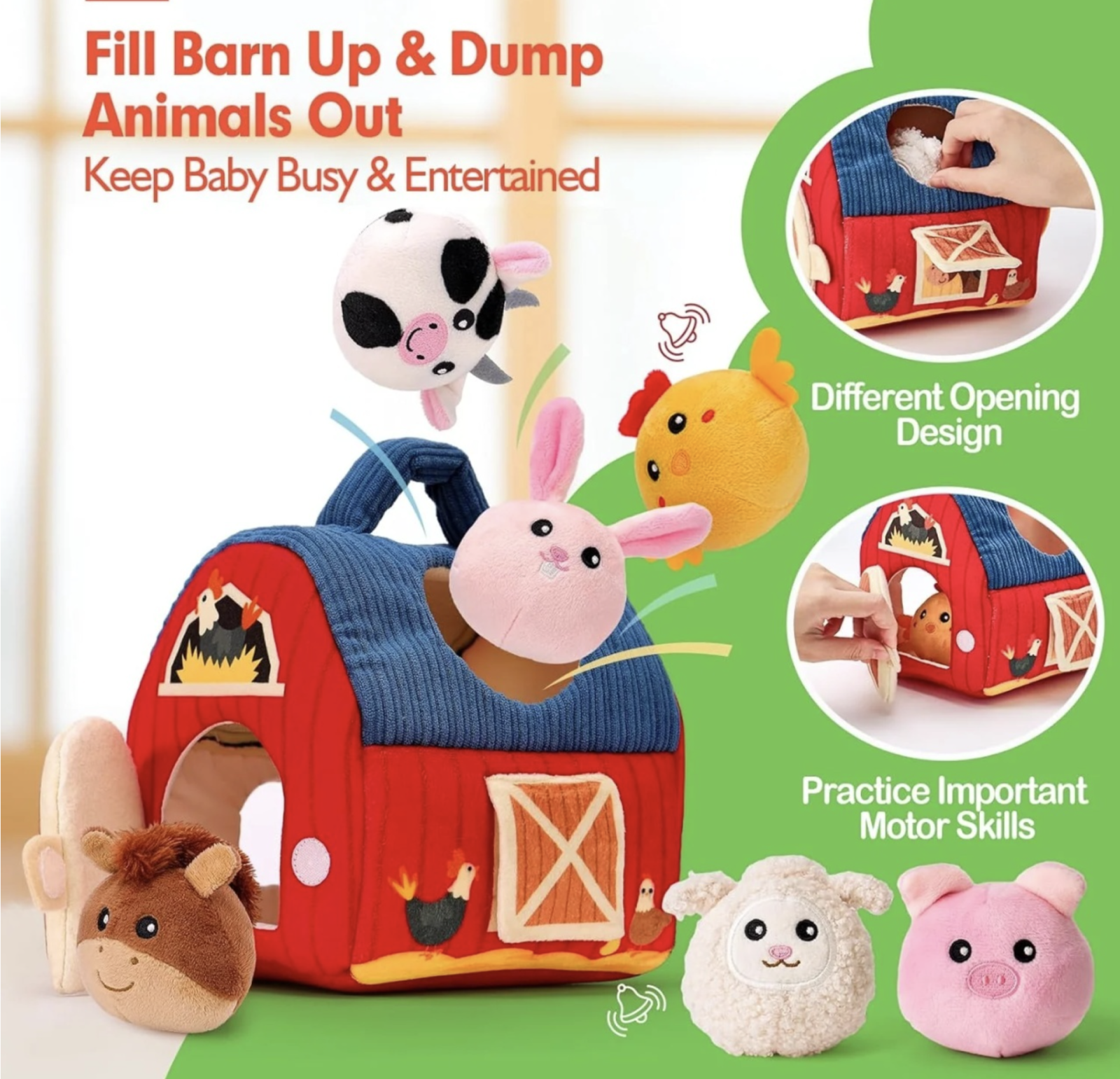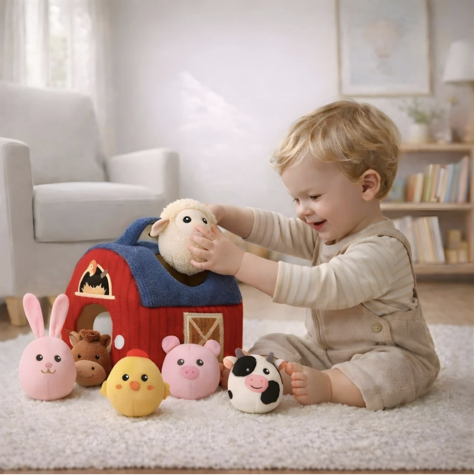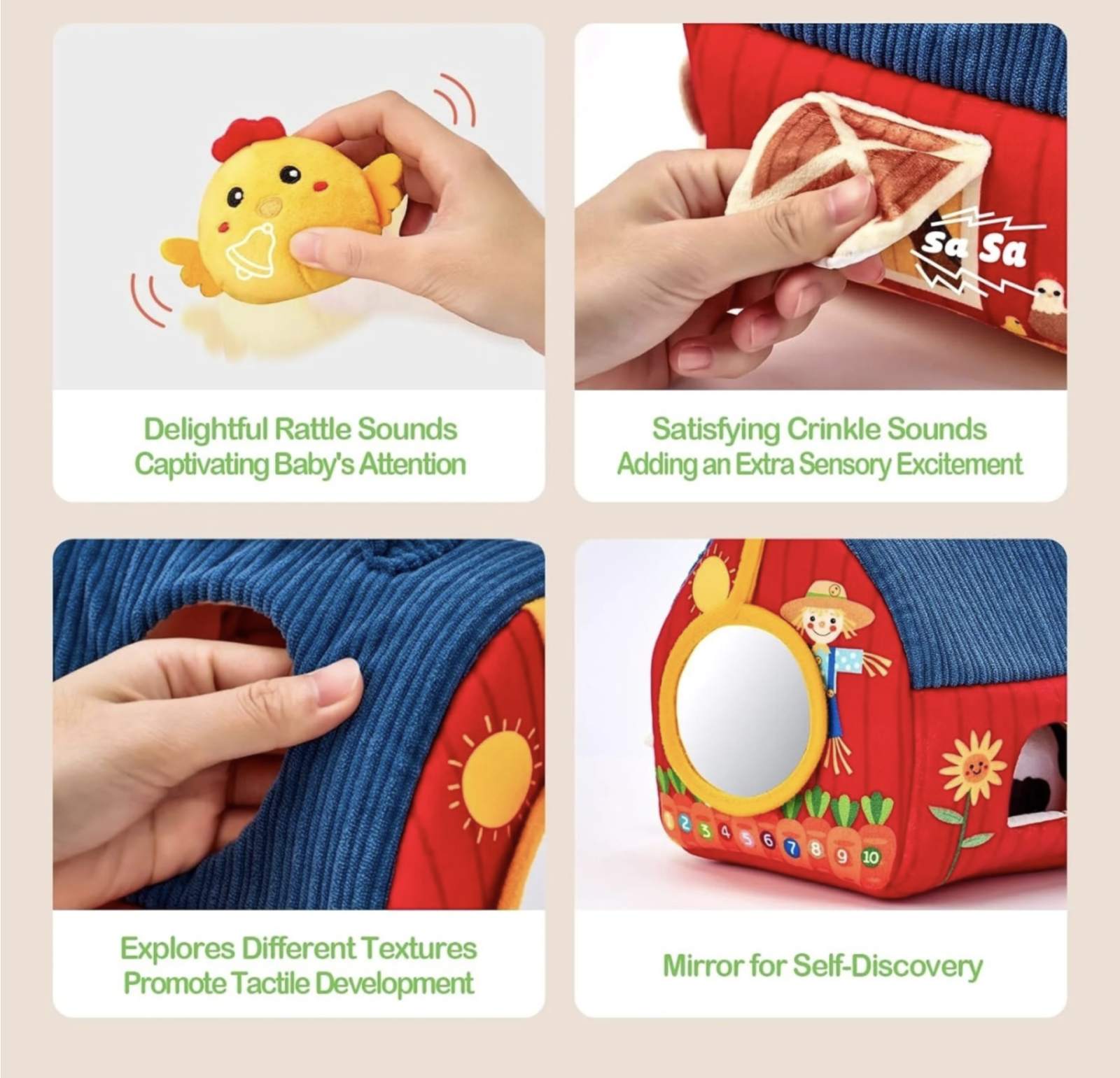 Jucaria senzoriala textila Ferma este conceputa pentru joaca linistita, explorare tactila si dezvoltare timpurie. Setul include un hambar moale din plus si 6 animalute de ferma care pot fi scoase si introduse inapoi in interior. Prin culori, texturi si efecte sonore discrete, jucaria incurajeaza manipularea, curiozitatea si invatarea prin joaca. Copiii pot apuca, scutura si ascunde animalutele, dezvoltand coordonarea mana-ochi, motricitatea fina si familiarizarea cu animalele de ferma.