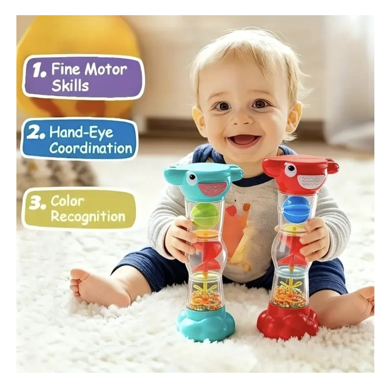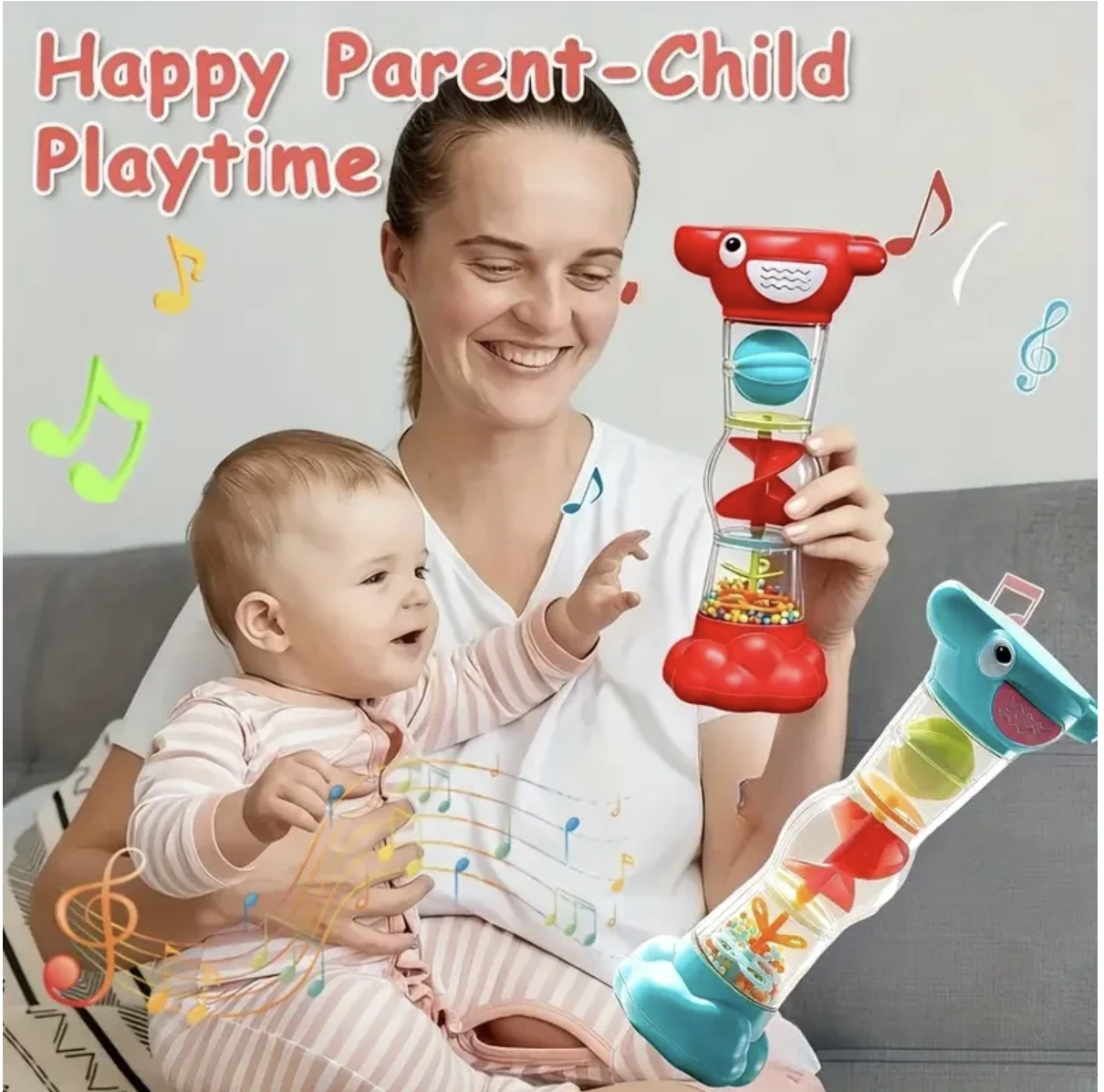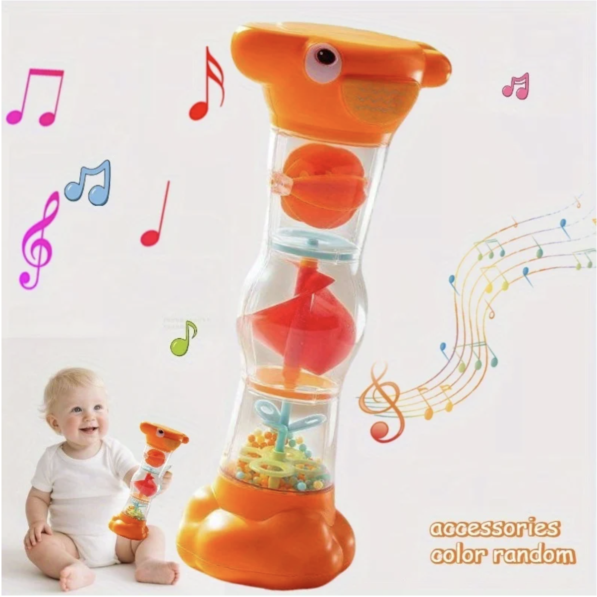 Jucaria zornaitoare tip clepsidra este o jucarie senzoriala pentru bebelusi, conceputa pentru explorare prin miscare, sunet si observatie vizuala. Are forma ergonomica, usor de prins de mainile mici, iar in interior include bilute colorate si elemente rotative care se misca atunci cand jucaria este intoarsa sau agitata. Sunetul placut de tip ploaie si partile transparente transforma joaca intr-o experienta captivanta, potrivita pentru stimularea atentiei, coordonarii mana-ochi si motricitatii fine. Specificatiile de baza, inclusiv materialul ABS si varsta recomandata 6 luni+, apar in listari online ale acestui model.