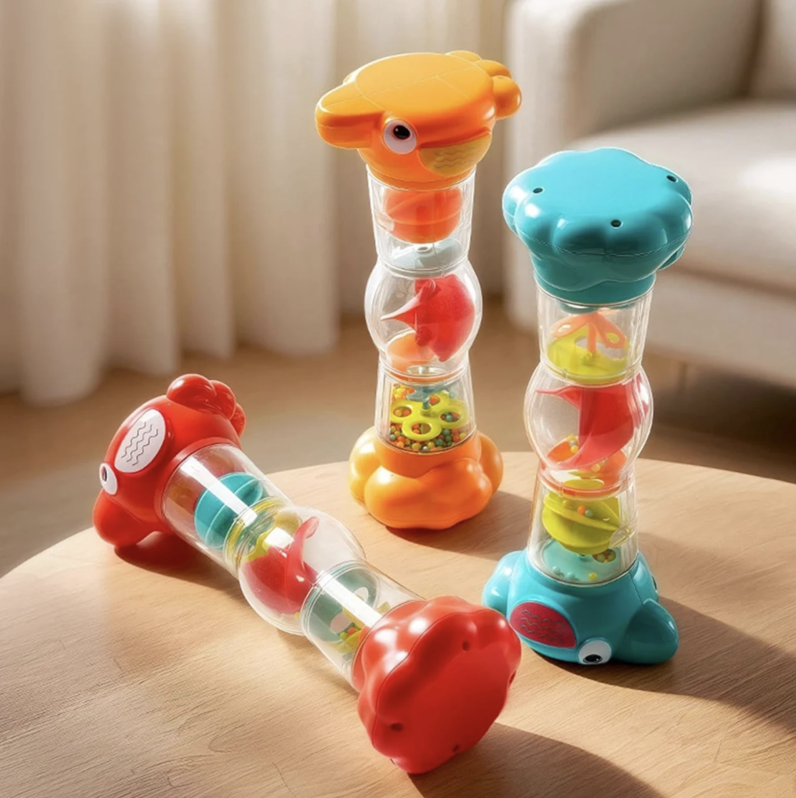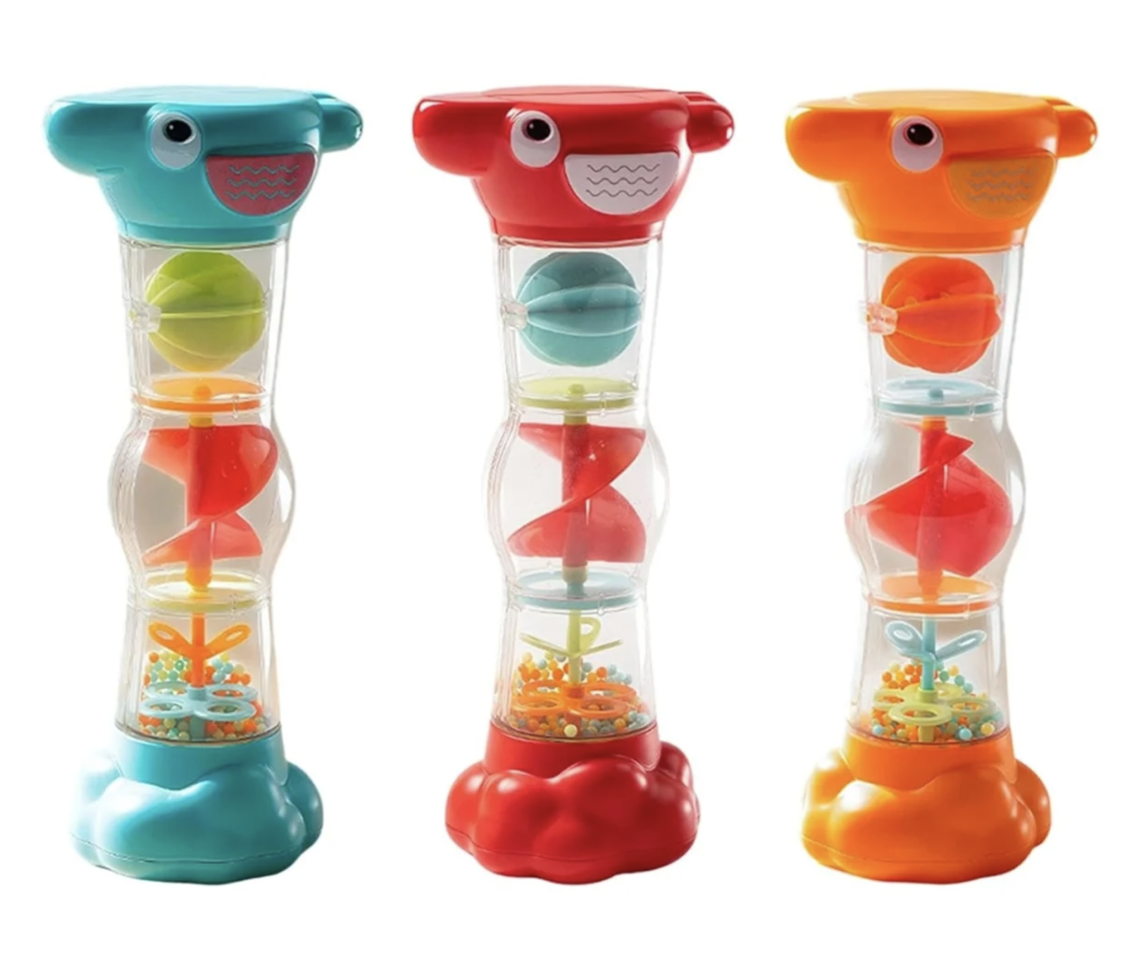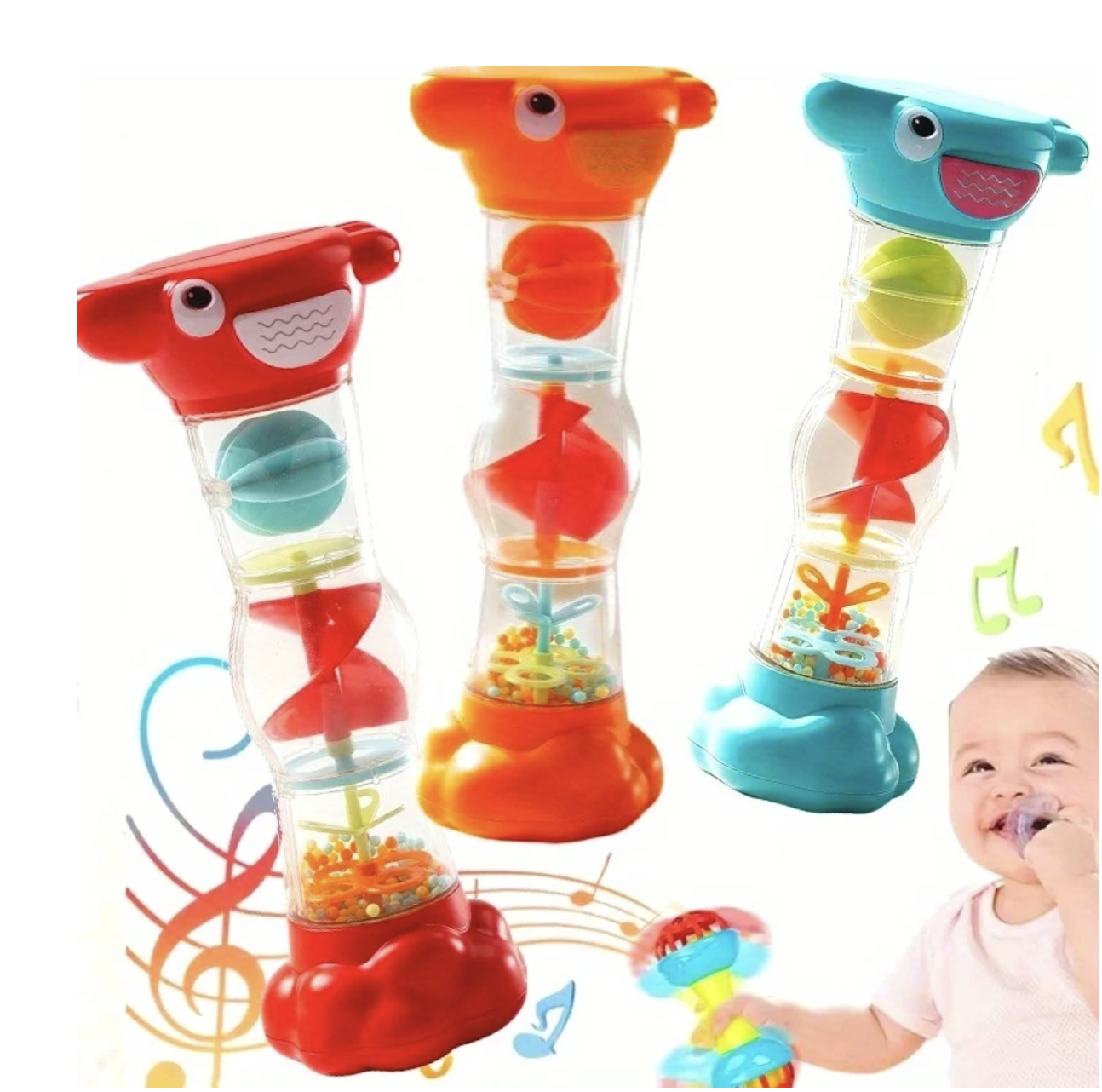 Jucarie zornaitoare tip clepsidra cu bilute si sunet de ploaie pentru bebelusi 6 luni+