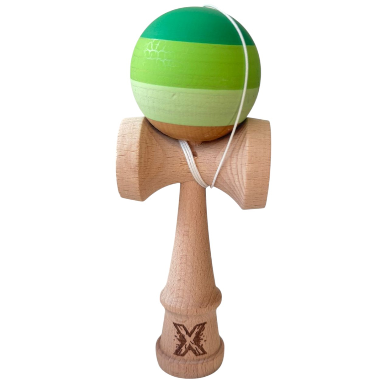 Kendama X Original Rubber Grip 18 cm, natur-verde deschis-verde inchis, din lemn este un joc clasic de indemanare, realizat integral din lemn rezistent, perfect pentru pasionatii de trick-uri, freestyle si competitii. Designul cu model colorat ii ofera un aspect modern si cool, in timp ce bila cu diametru de 6 cm este acoperita cu un strat special ce asigura aderenta optima pentru manevre precise.