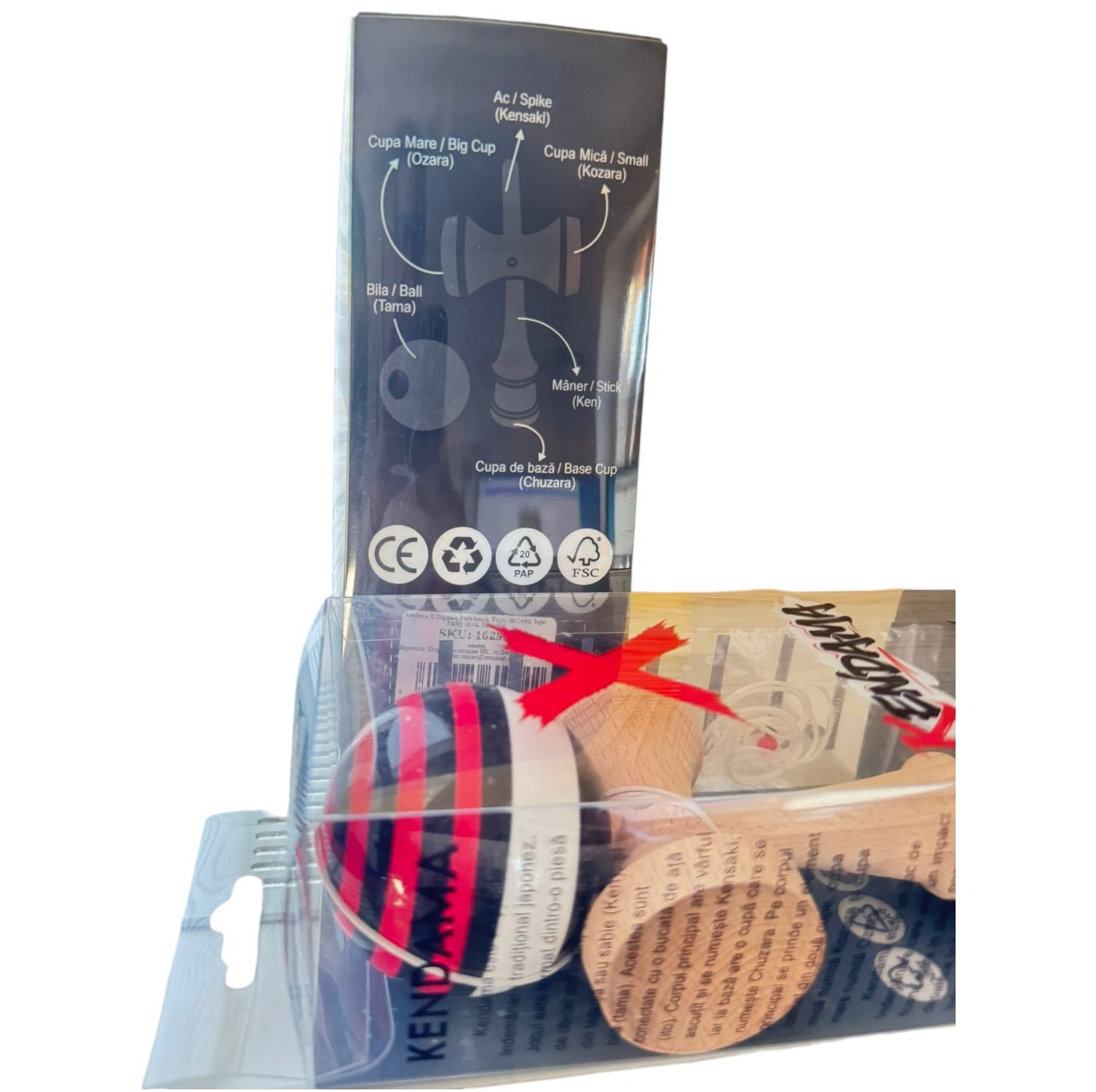 Kendama X Original Super Sticky 18 cm, Negru-Alb si dungi rosu-negru, din lemn este un joc clasic de indemanare, realizat integral din lemn rezistent, perfect pentru pasionatii de trick-uri, freestyle si competitii. Designul cu model colorat ii ofera un aspect modern si cool, in timp ce bila cu diametru de 6 cm este acoperita cu un strat special ce asigura aderenta optima pentru manevre precise.