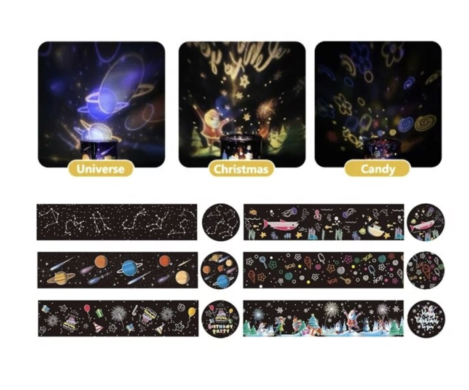 Dispune de 6 tematici vizuale diferite (cer instelat, animalute, univers etc.), care transforma peretii si tavanul camerei intr-un peisaj de poveste.